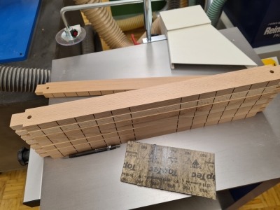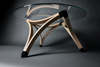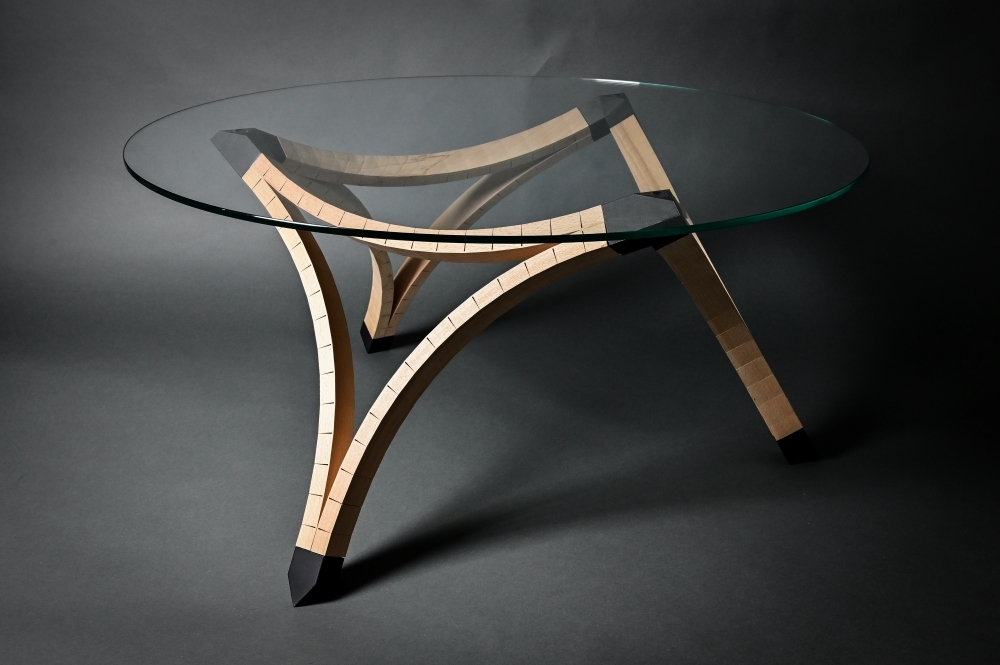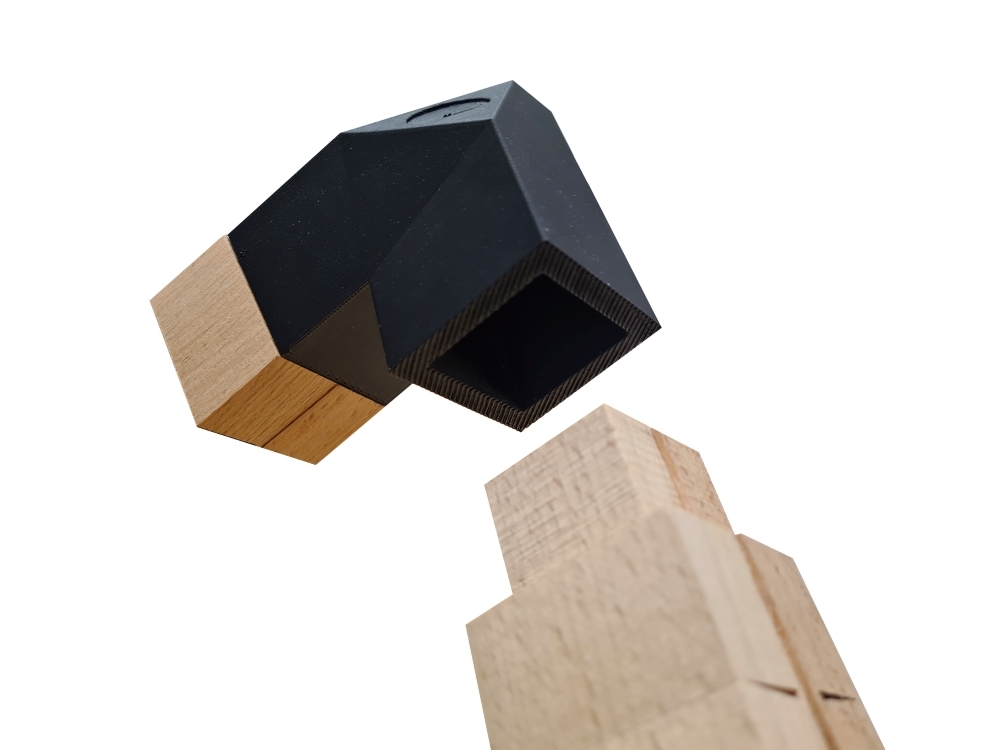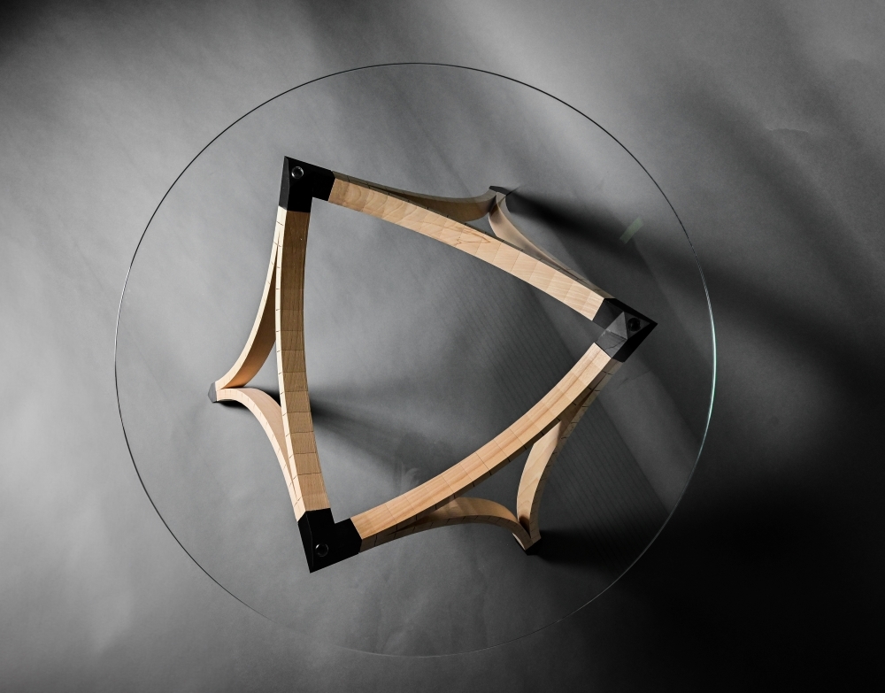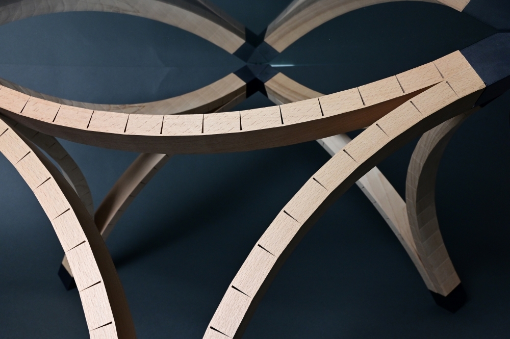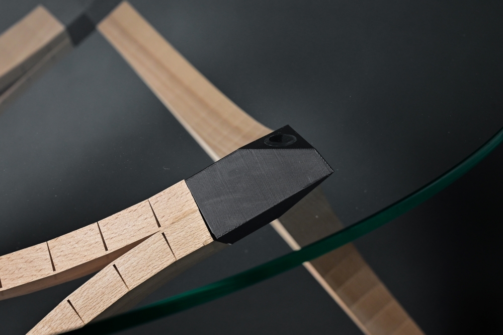 The original idea was to design and handcraft a piece of furniture from wood. In our search for various furniture styles and woodworking techniques, we came across the method of "kerfing". This involves making the wood flexible through precise cuts. When enough pressure is applied to such a bend, the cuts stabilize each other and do not require additional gluing. After numerous experiments with different types of wood, we opted for beech wood due to its high density, which provides the necessary stability. Based on these experiments, the idea arose to design a table using identical arches. The triangular shape lends itself to independent stability. A 3D-printed part serves as the connecting element between these three arches, continuing the curvature lines and contrasting in color with the wood. The plug connection with integrated recesses for felt pads and anti-slip pads gives the connecting element an elegant aesthetic and utilizes the advantages of 3D printing due to its complex shape. The result is an intricate coffee table that convinces with its simplicity. It also holds potential for further furniture pieces based on this principle.
