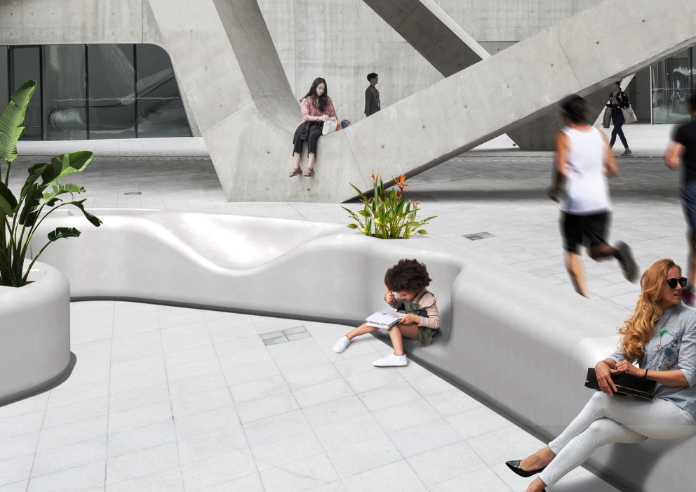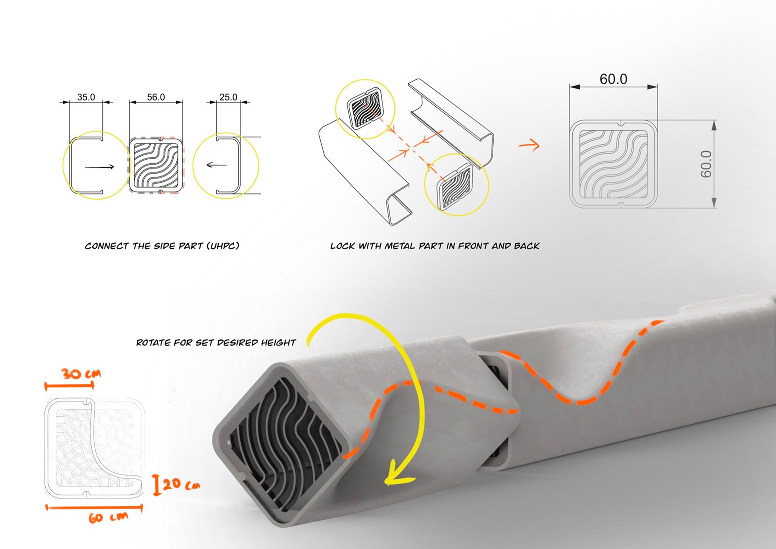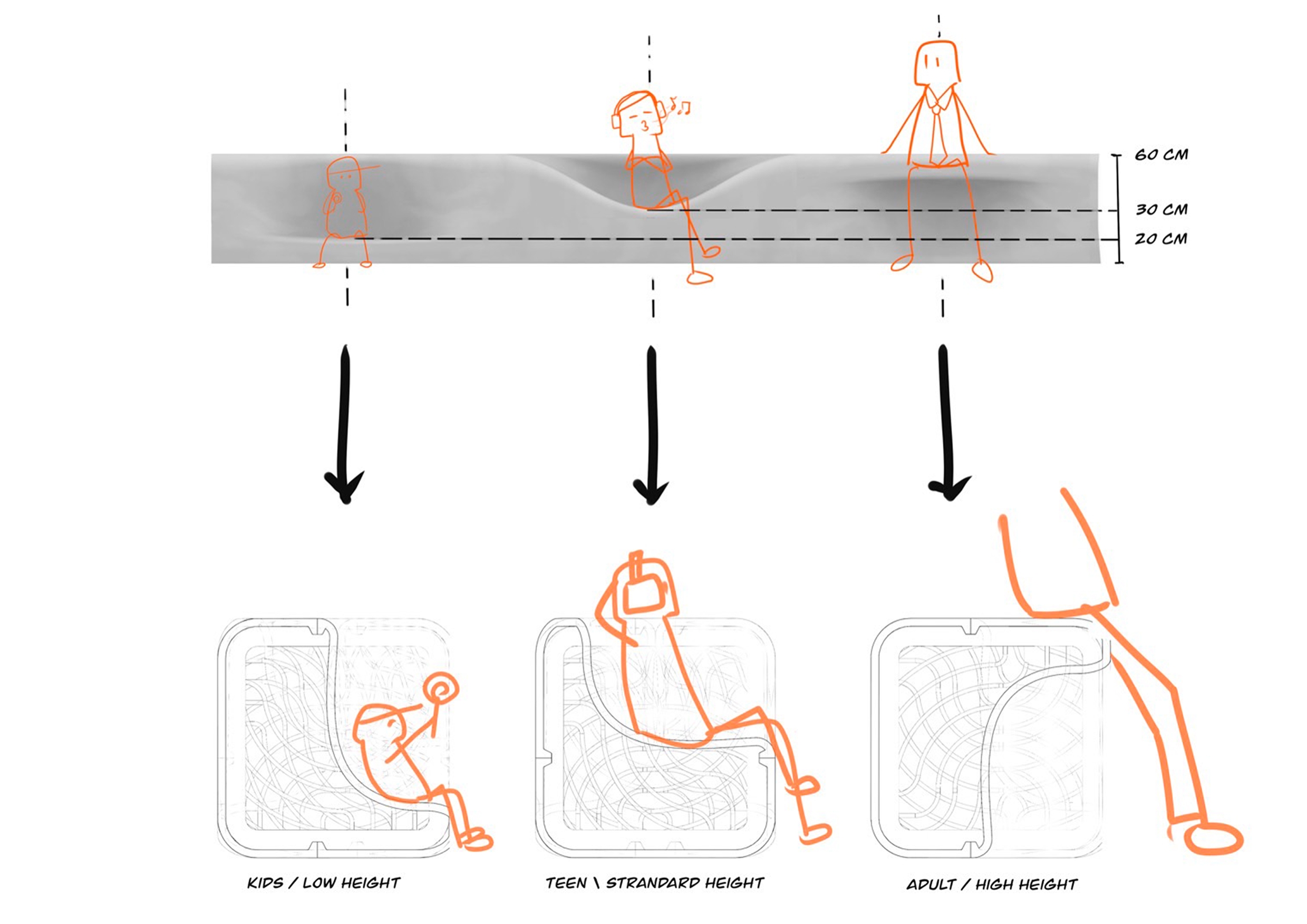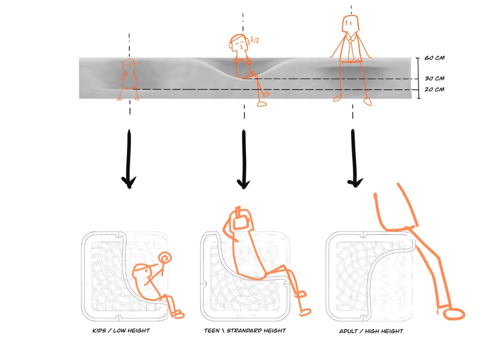 The One for All Bench is a singular modular seating solution featuring three varying heights, catering to individuals of all statures, thus ensuring ergonomic comfort across different age groups and genders. Its simplistic yet innovative design, comprising a box-shaped structure with concave faces, provides users with diverse seating experiences. By offering adjustable seating heights within a unified bench, it fosters inclusivity and equality of comfort, bridging generational divides and fostering a sense of unity within urban communities. Crafted from Ultra High Performance Concrete and aluminum, and featuring adaptable modules, it seamlessly integrates into any urban landscape while ensuring sustainability. The graceful curves formed upon assembly symbolize the perpetual harmony it engenders.
