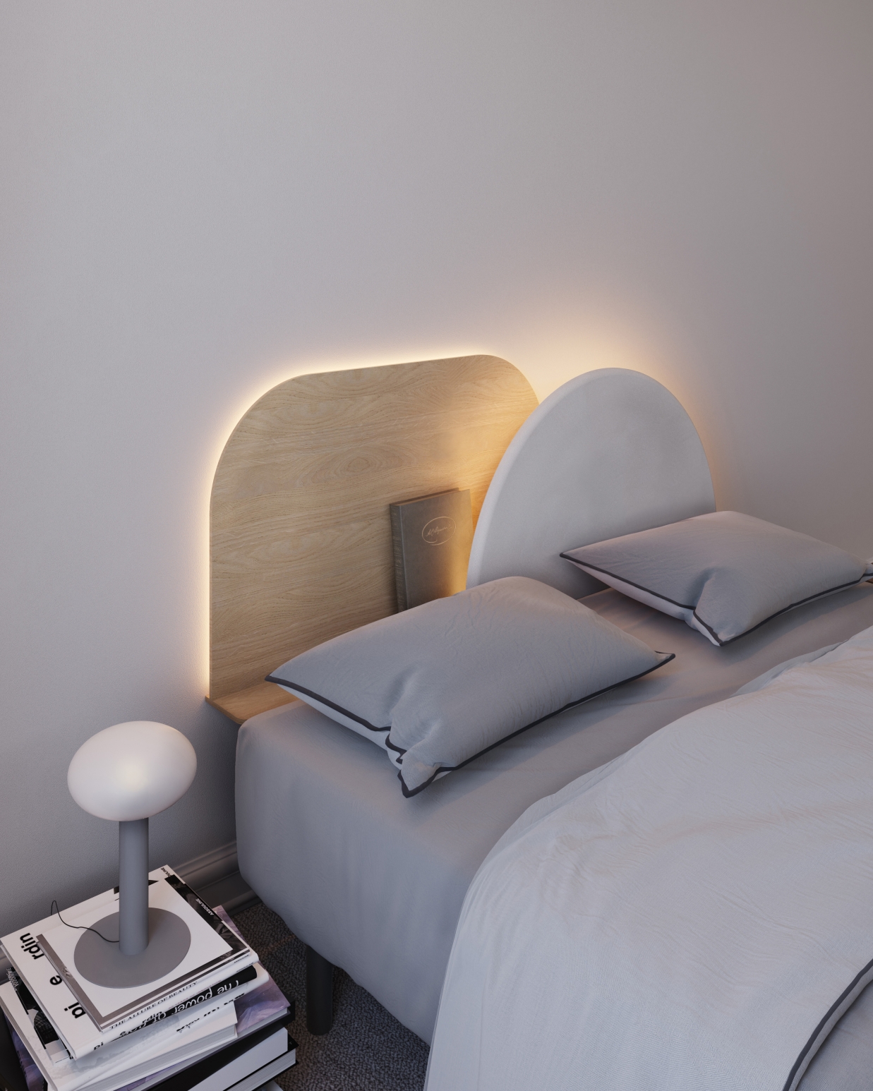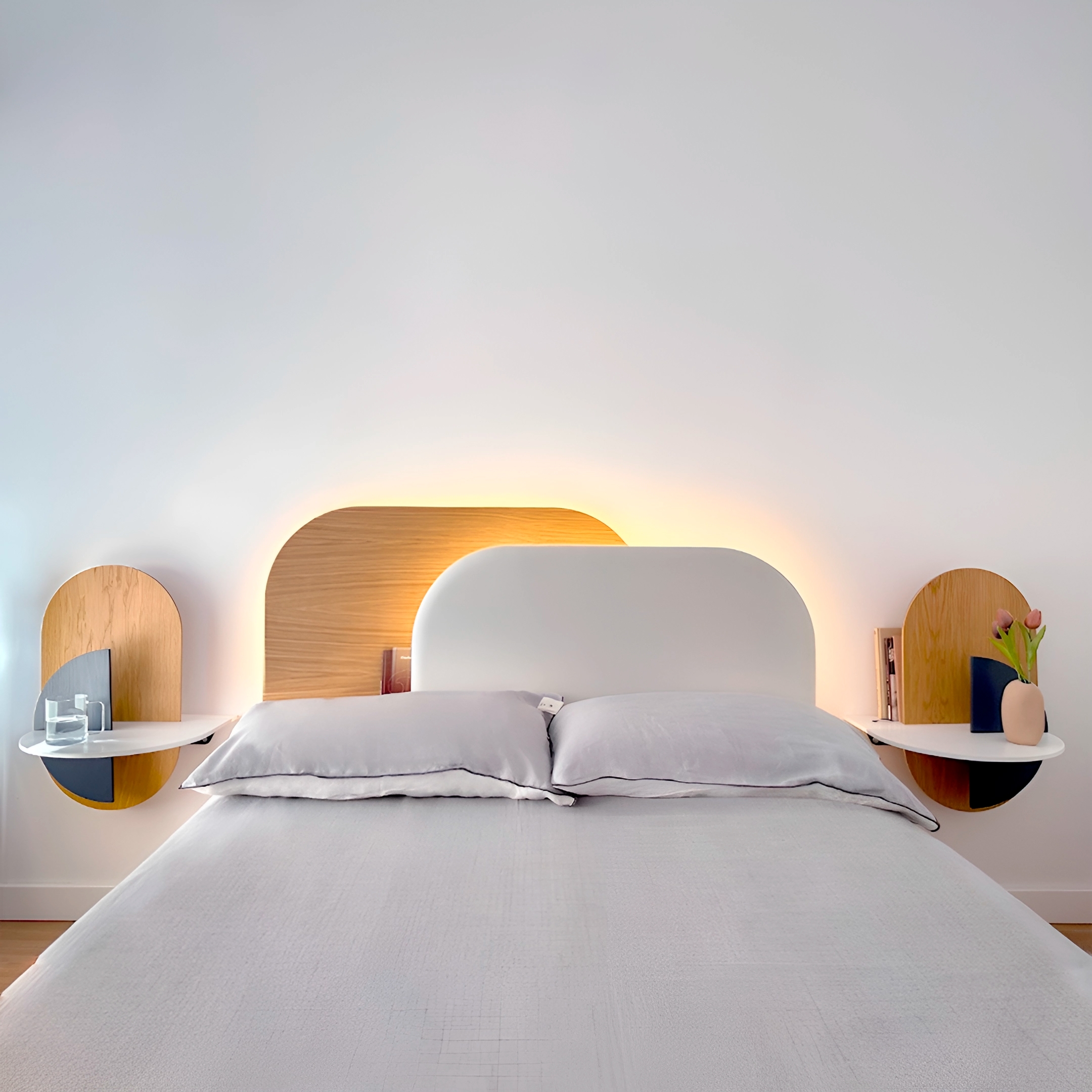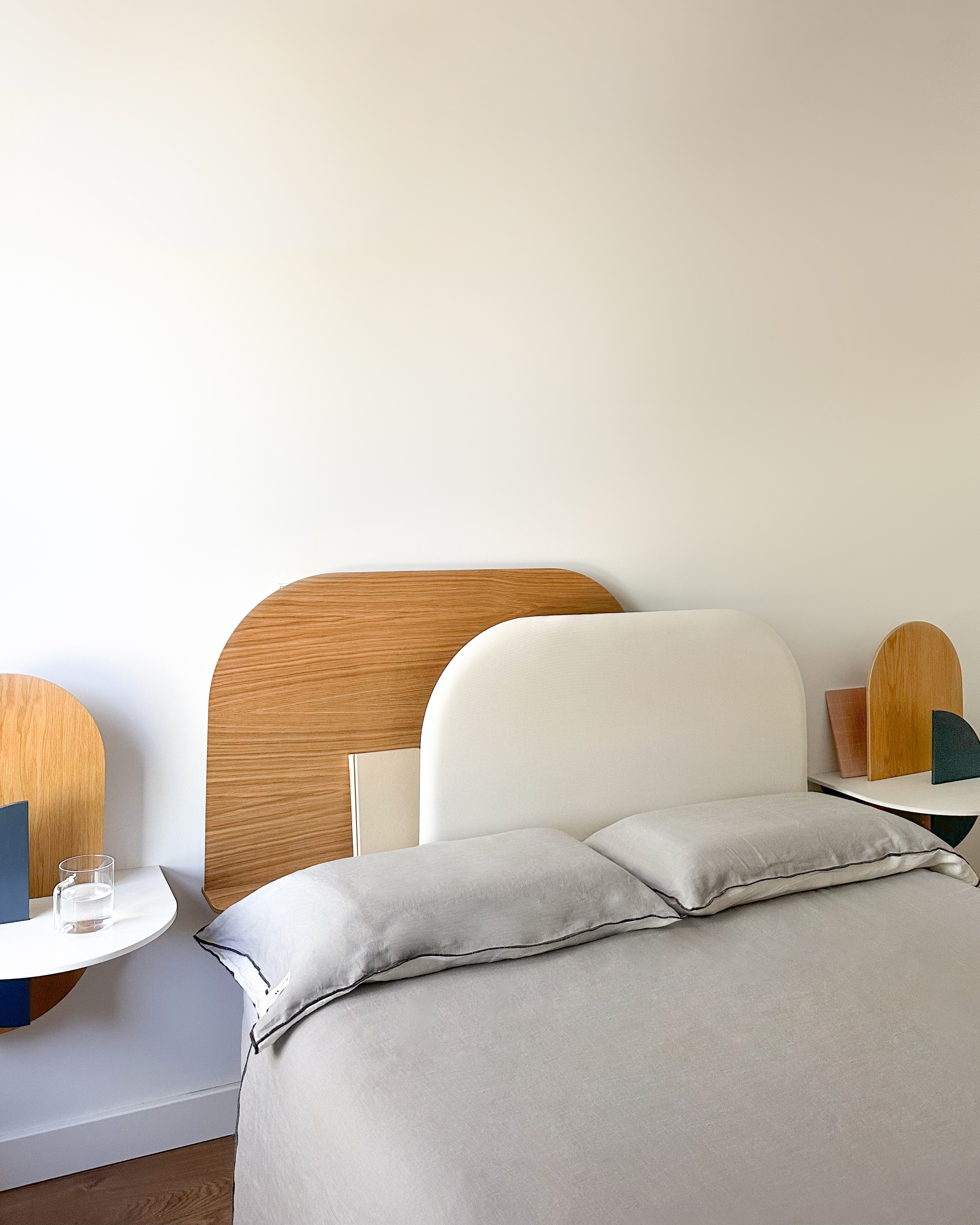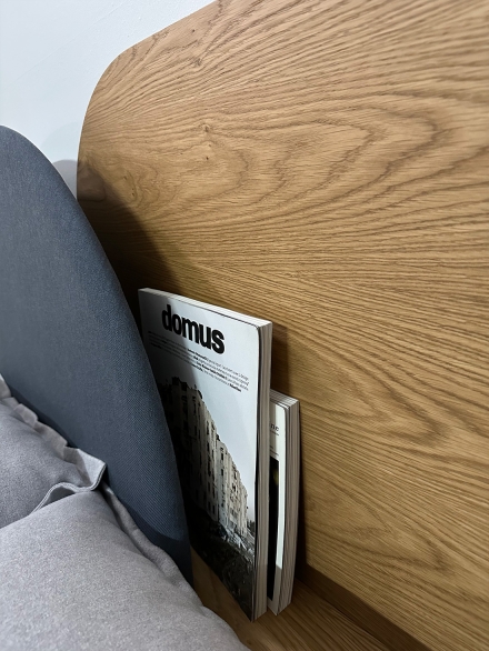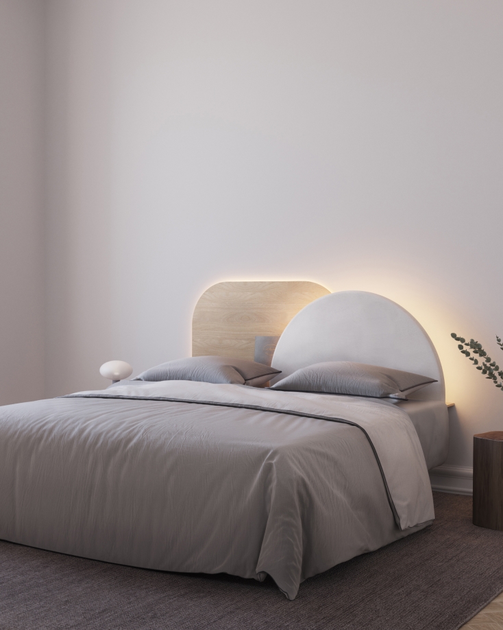 Fully modular and customisable, our Alba headboard consists of two panels that overlap in the centre, allowing it to adapt to different bed sizes. It also features a hidden shelf at the back for small everyday objects and the possibility to add a dimmable backlight. Available in a sustainable wood finish or in a beautiful textile. Carefully manufactured with our Design with Intention philosophy locally in Spain.