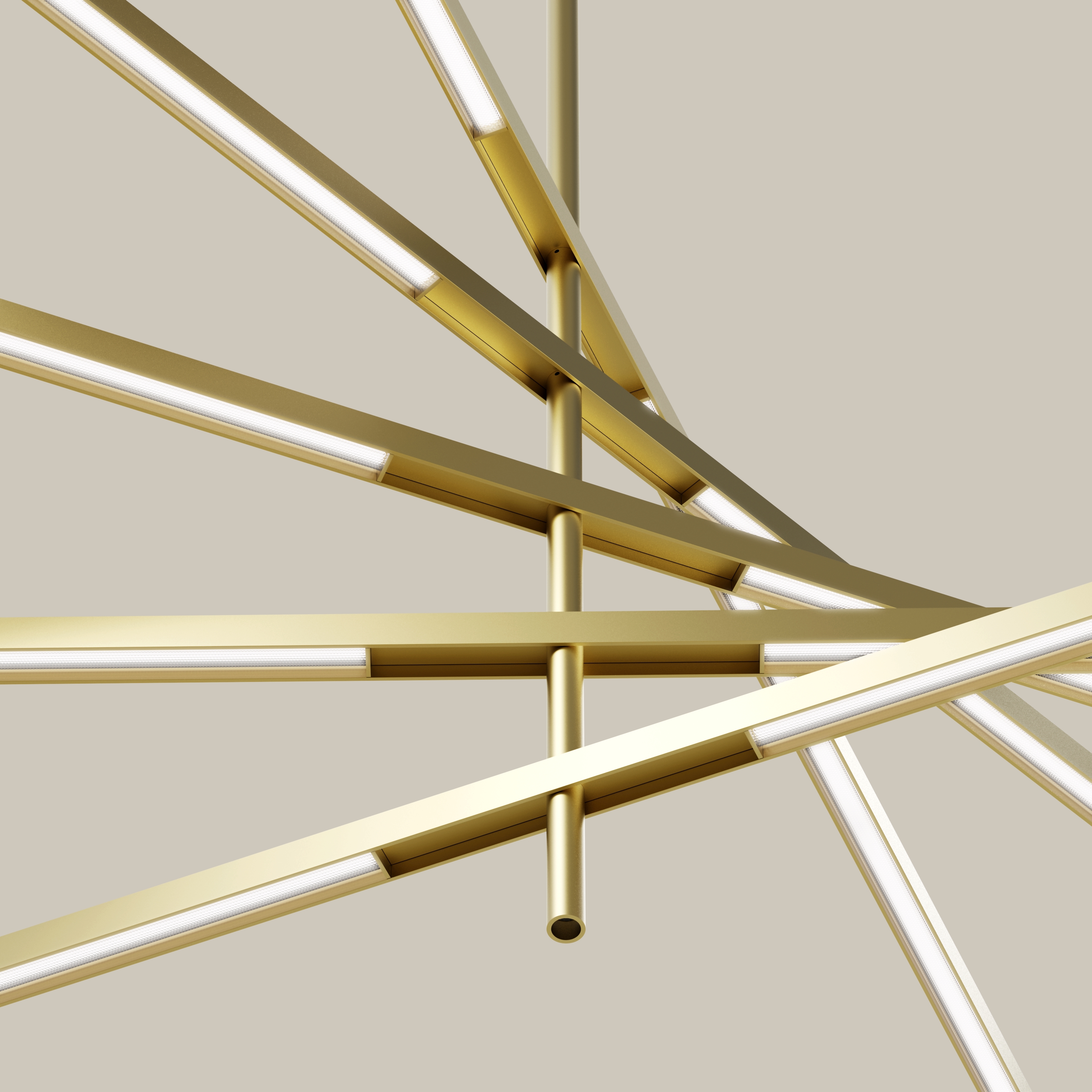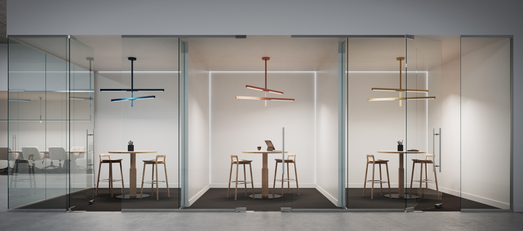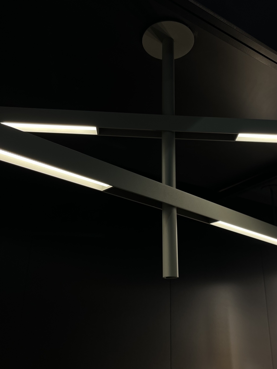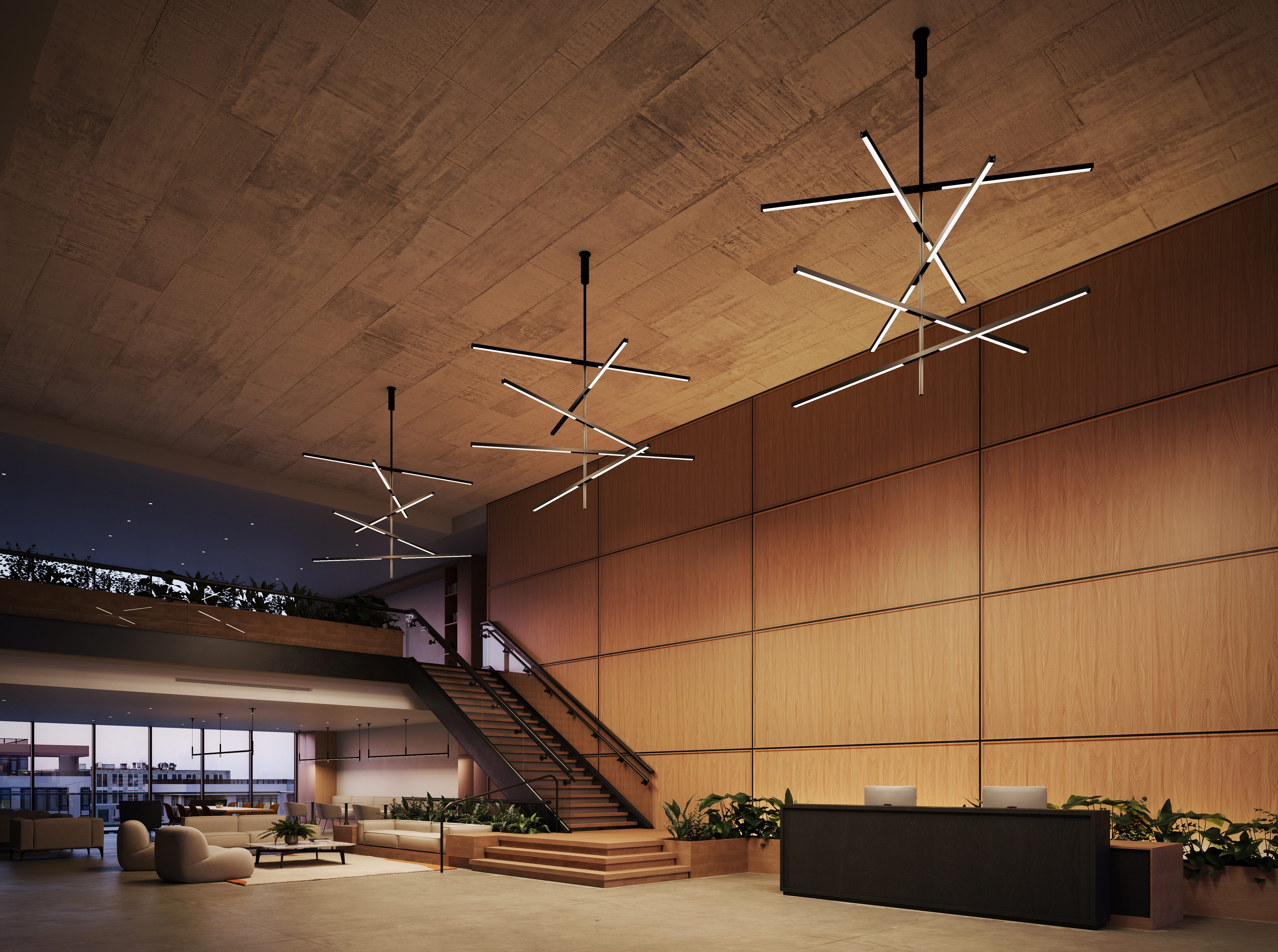 Symmetrical and minimalist, Junction is an aluminium luminaire shaped by up to five linear luminaires (arms) that pivot around a central mast. The open structure creates negative space around the mast, emphasizing an airy aesthetic that enhances a variety of large-scale spaces, from grand lobbies to reception areas. Junction comes together in multiple configurations. Up to five arms may be selected, in lengths of 4’, 6’, or 8’. Each arm can rotate 180 degrees and be positioned either 6” or 12” apart. A U-shaped diffuser adds subtle depth and comes in either a smooth or a prismatic finish. Junction is available in 16 colors.