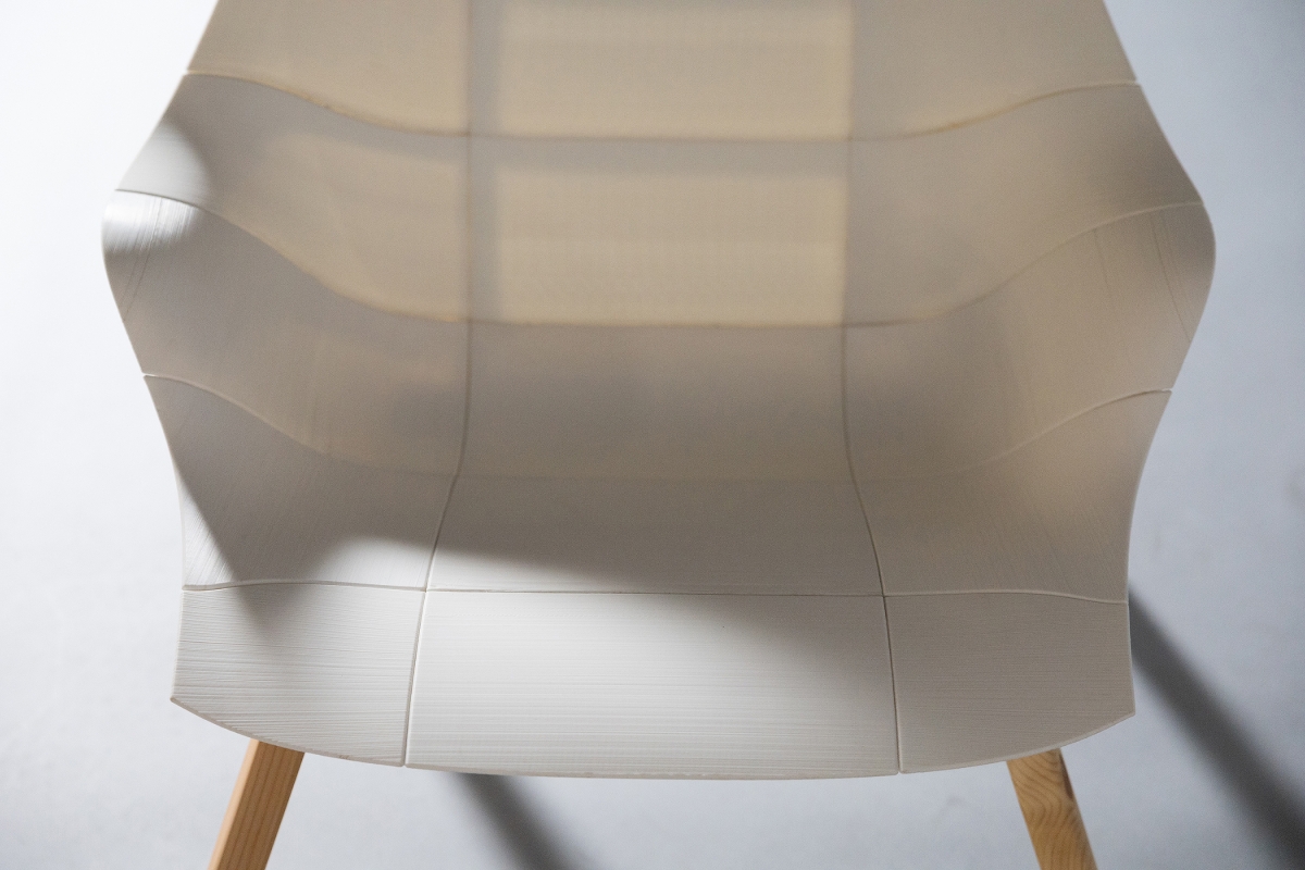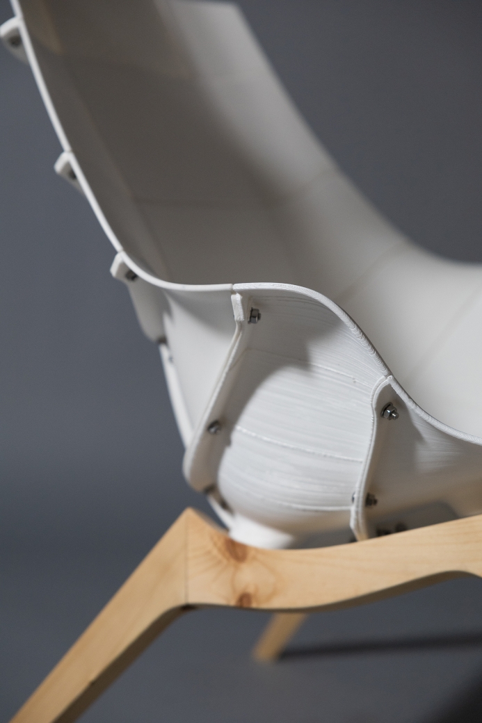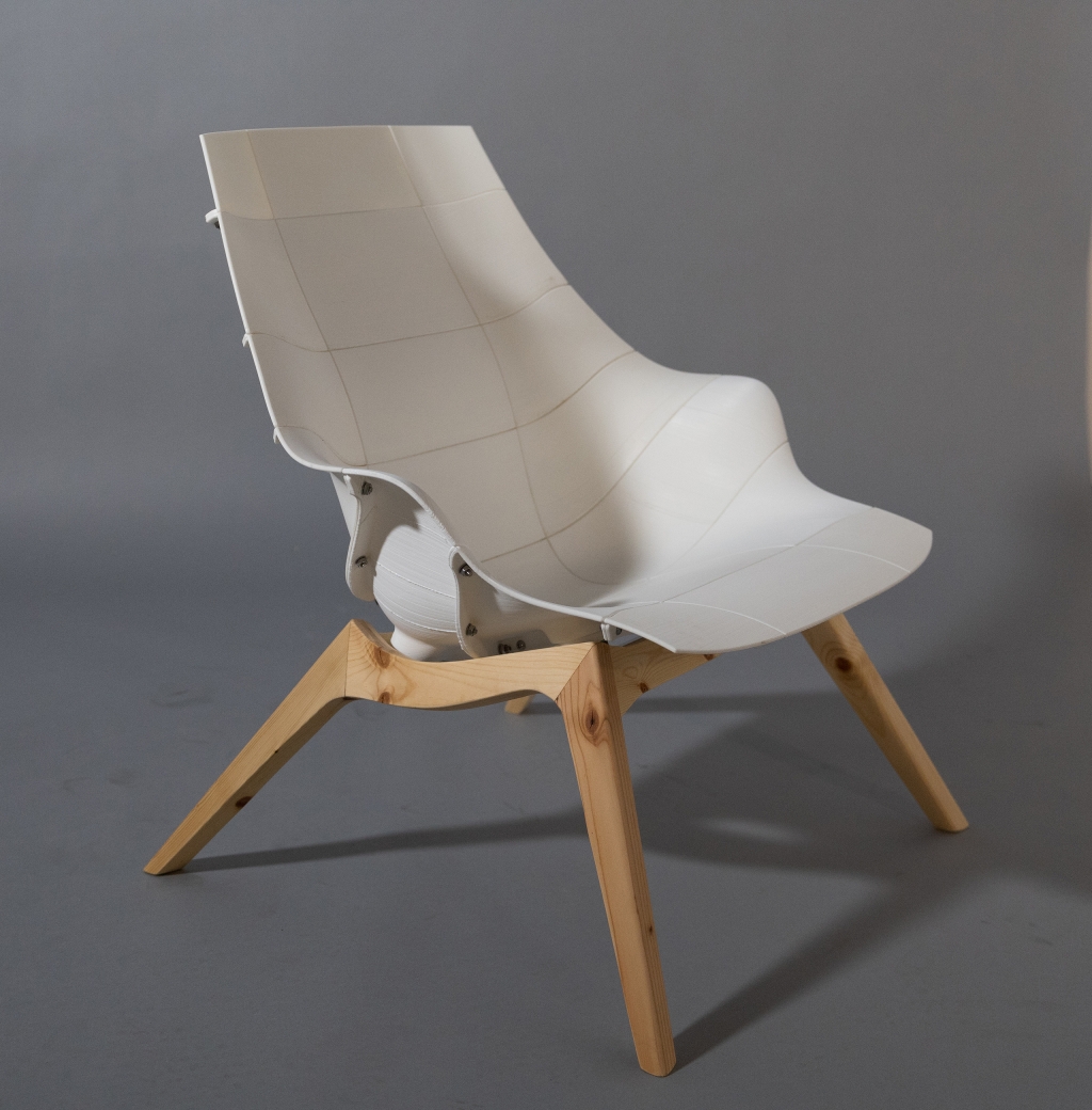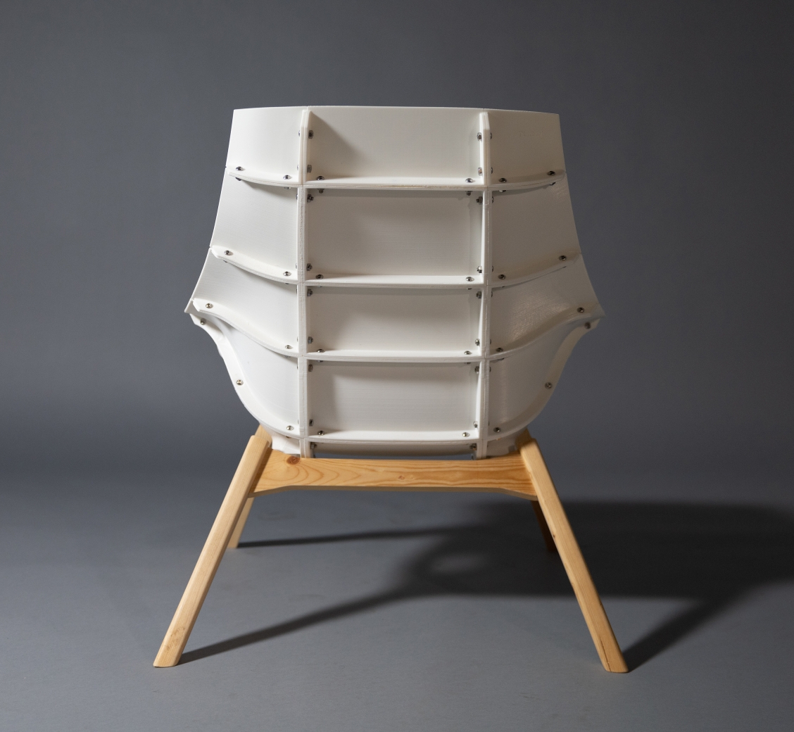 Chair29 embodies the philosophy of “Design for All,” merging the joy of making with high-quality design. This lounge chair invites users to participate in its creation, allowing customization and assembly while showcasing the beauty of mechanical connections. Harnessing the power of 3D printing, Chair29 reduces waste and energy consumption and empowers individuals to produce their own furniture locally. Originally crafted from 29 modular, 3D-printed pieces, Chair29 adapts to consumer-level printing constraints, with each part fitting within an 11”x10”x10” volume. The chair stands out for its ergonomic comfort inspired by the iconic Eames LCW fit. With features like lumbar support and high armrests, its silhouette elegantly balances organic curves with angular leg lines. To enhance stability, the latest iteration includes redesigned legs with extrusions for better attachment, enabling a choice between wooden or metal bases. The warm wood texture beautifully complements the translucent plastic, creating an inviting aesthetic. Made from advanced PolyMaker PolyMax PLA, this design showcases the mechanical artistry of 3D printing while prioritizing user experience and aesthetic appeal.