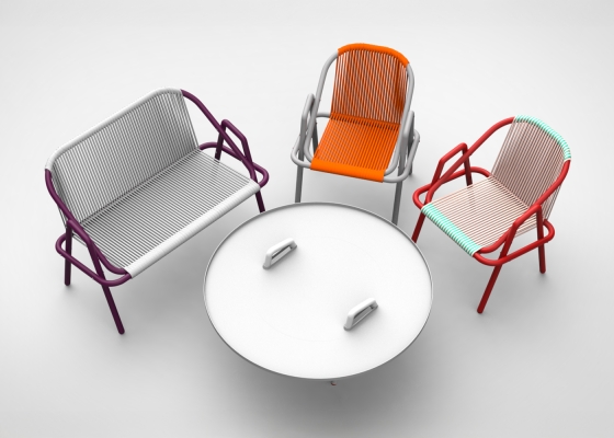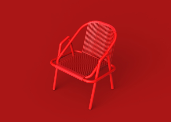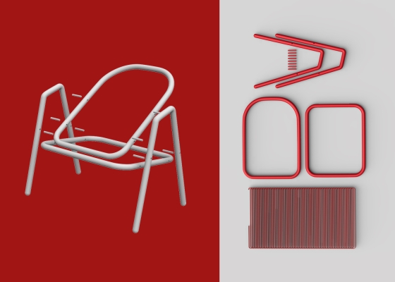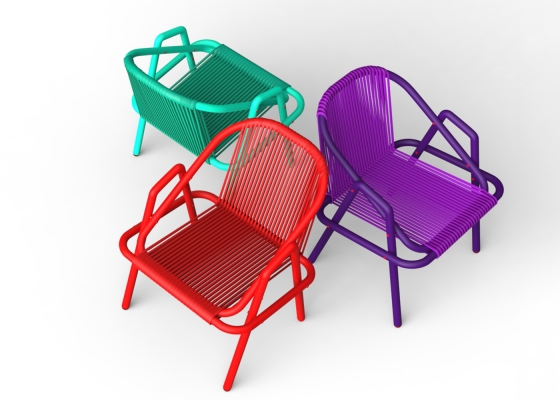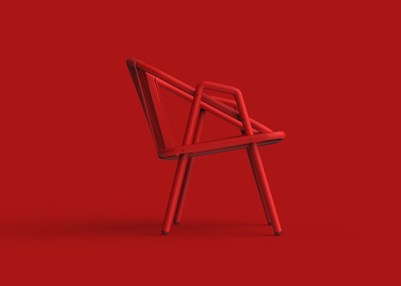 Due to their simple structure, these chairs can easily be stacked on top of each other. This chair is designed with a focus on limited materials and an easy production method with few parts from aluminum profiles. The seat and backrest are made from cotton rope or recycled material, which can be easily tied by the user according to their preference.