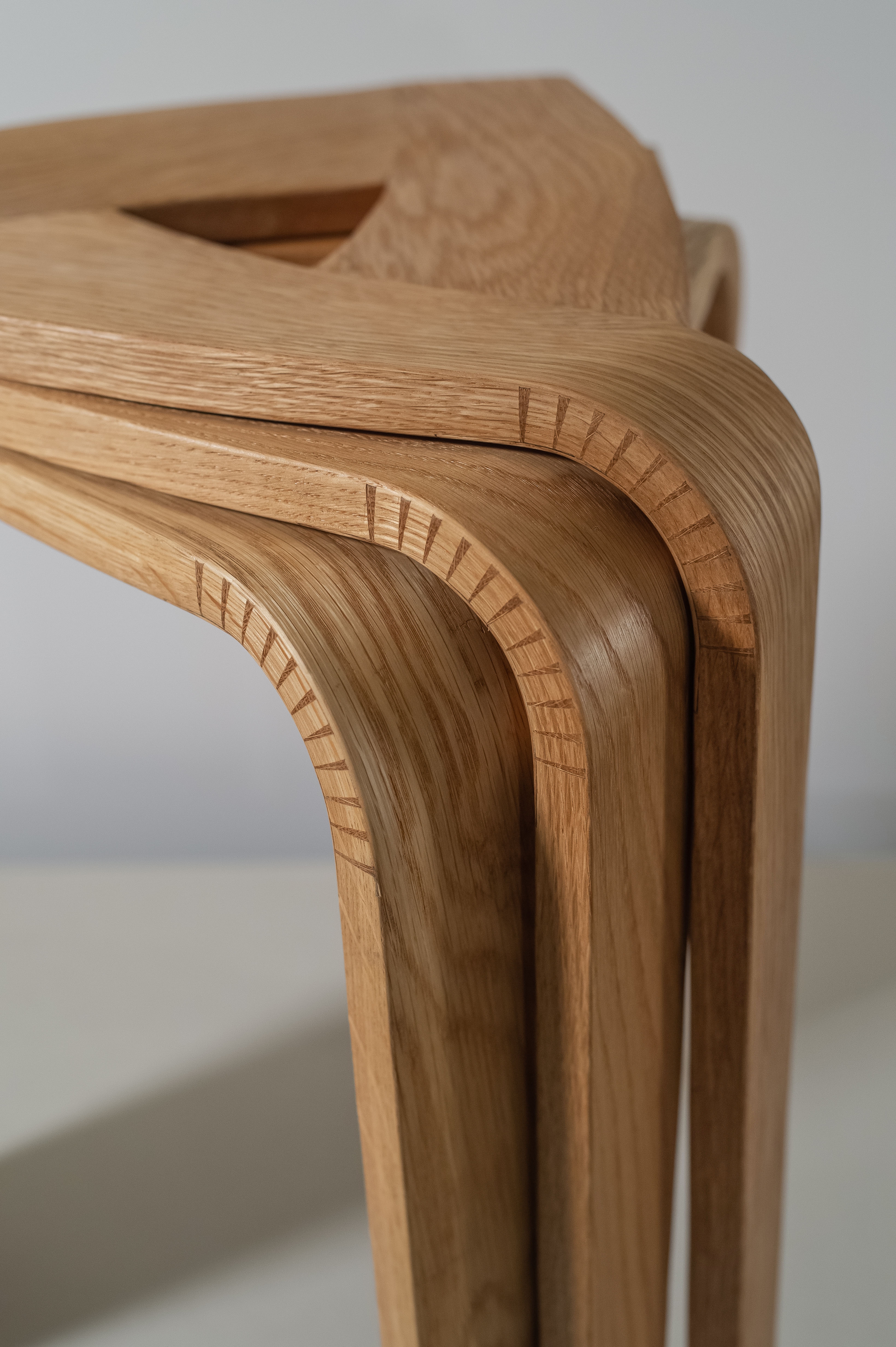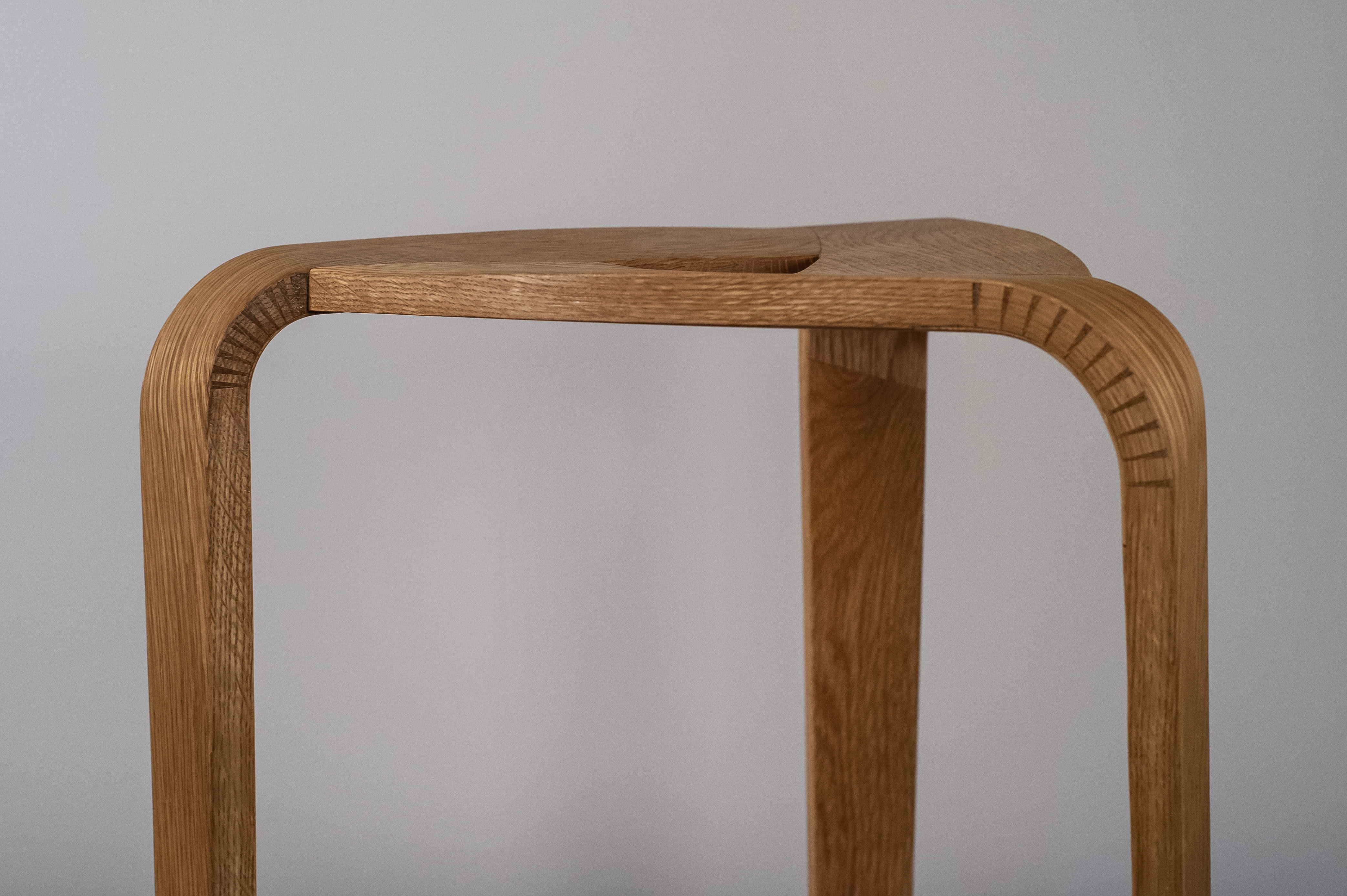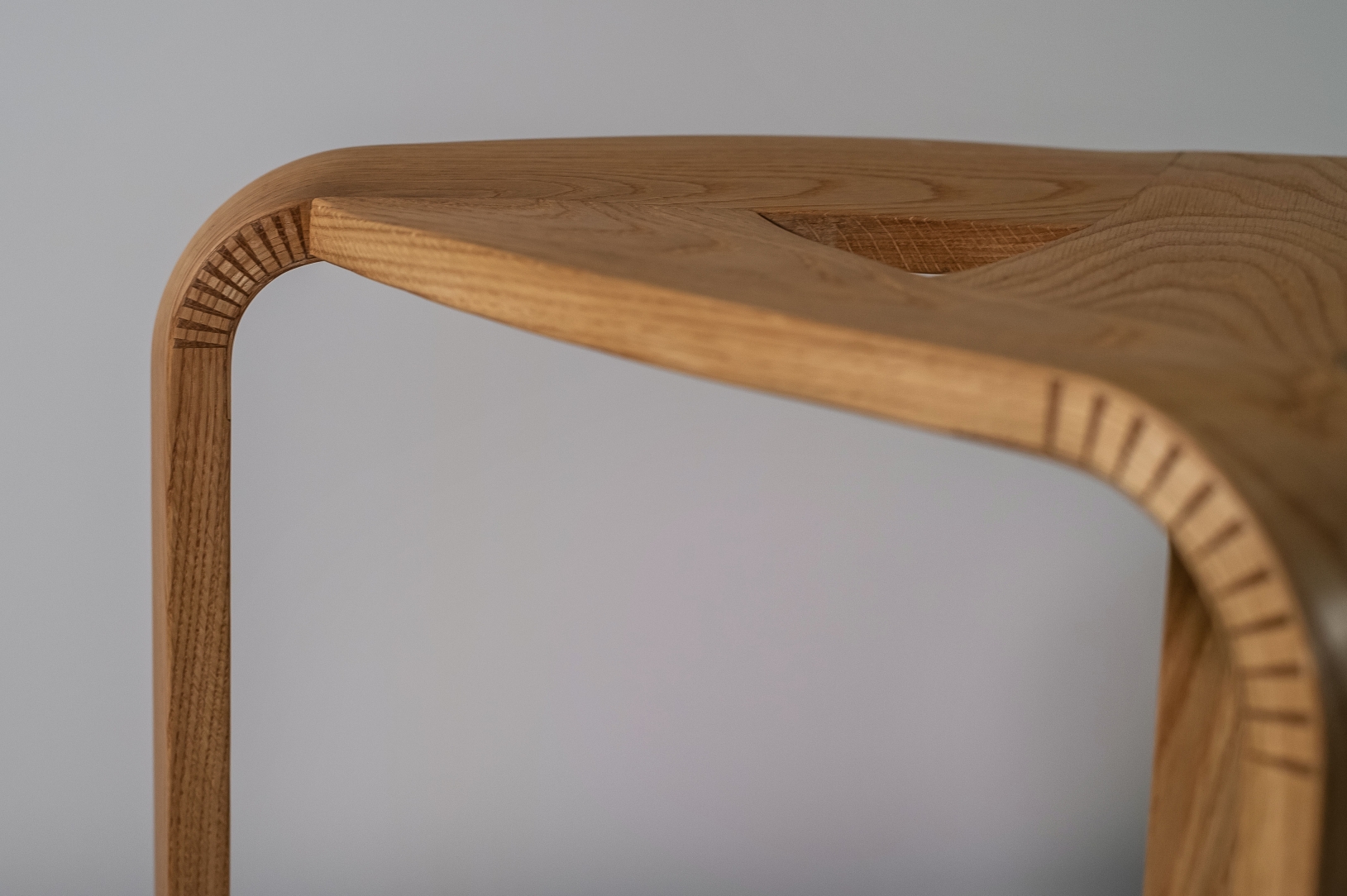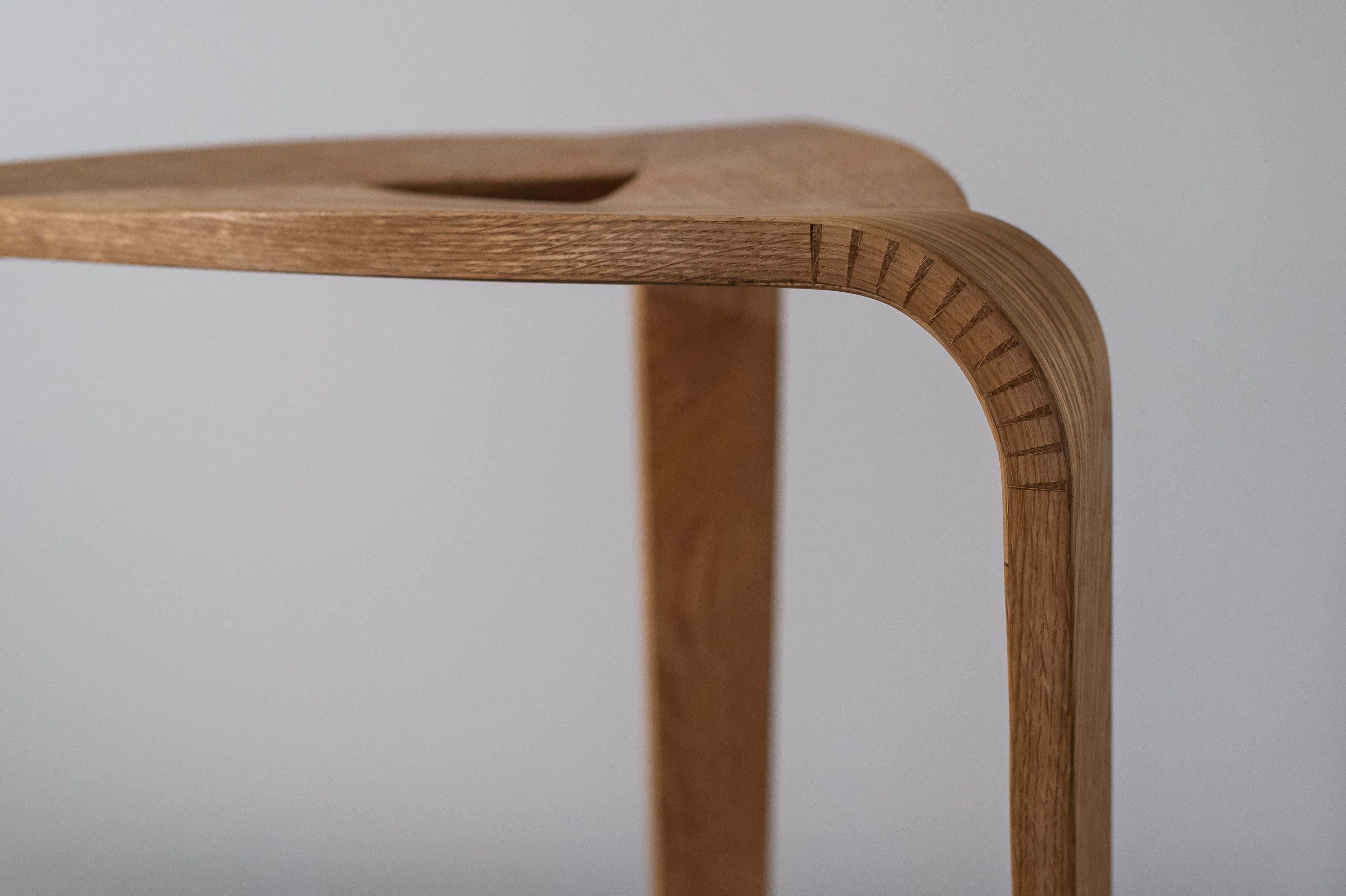 The fine detailing of the splined kerf knee joint is predominantly exposed on this simple, yet elegantly formed stool; whether it’s standalone, grouped or stacked in multiples, in a spiralling formation.
