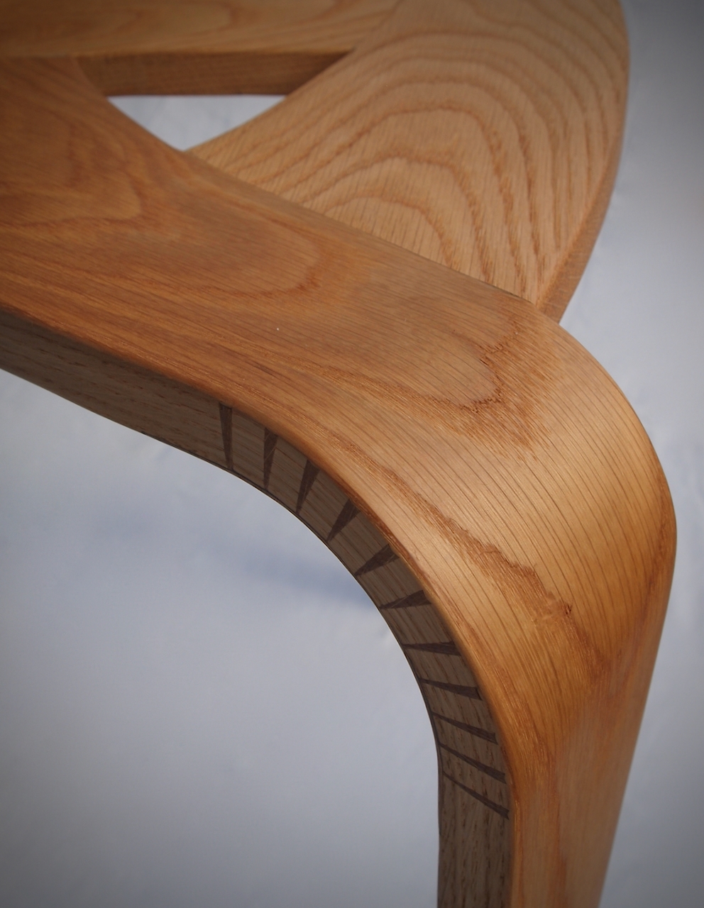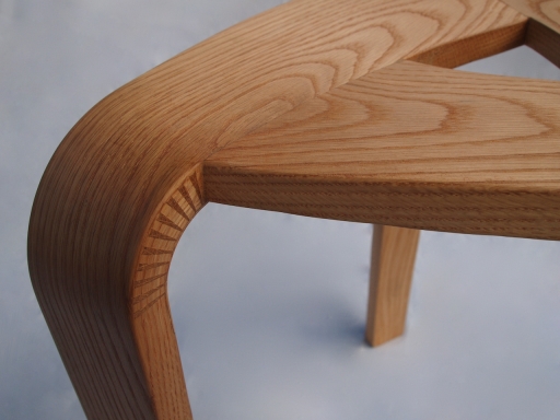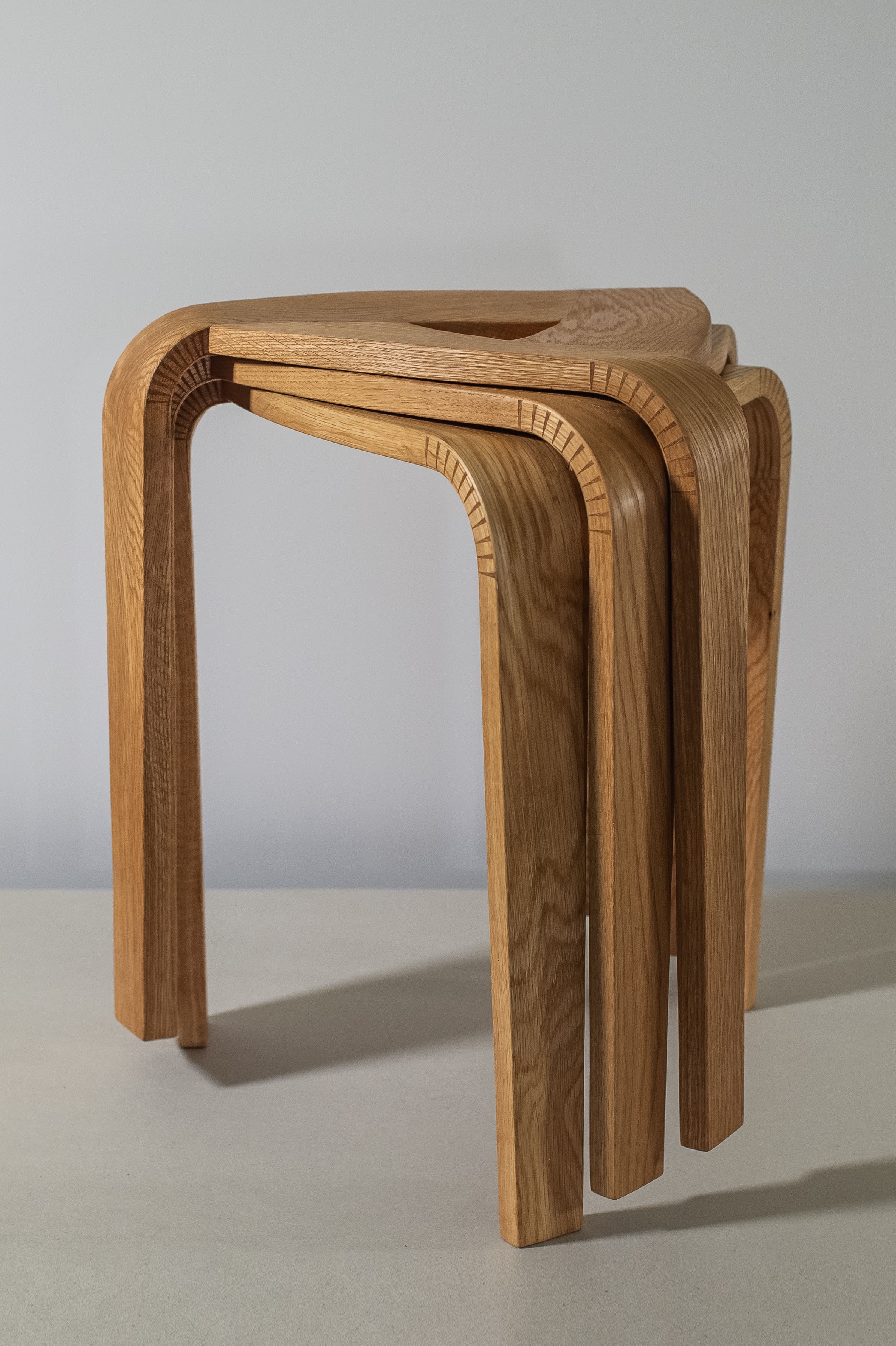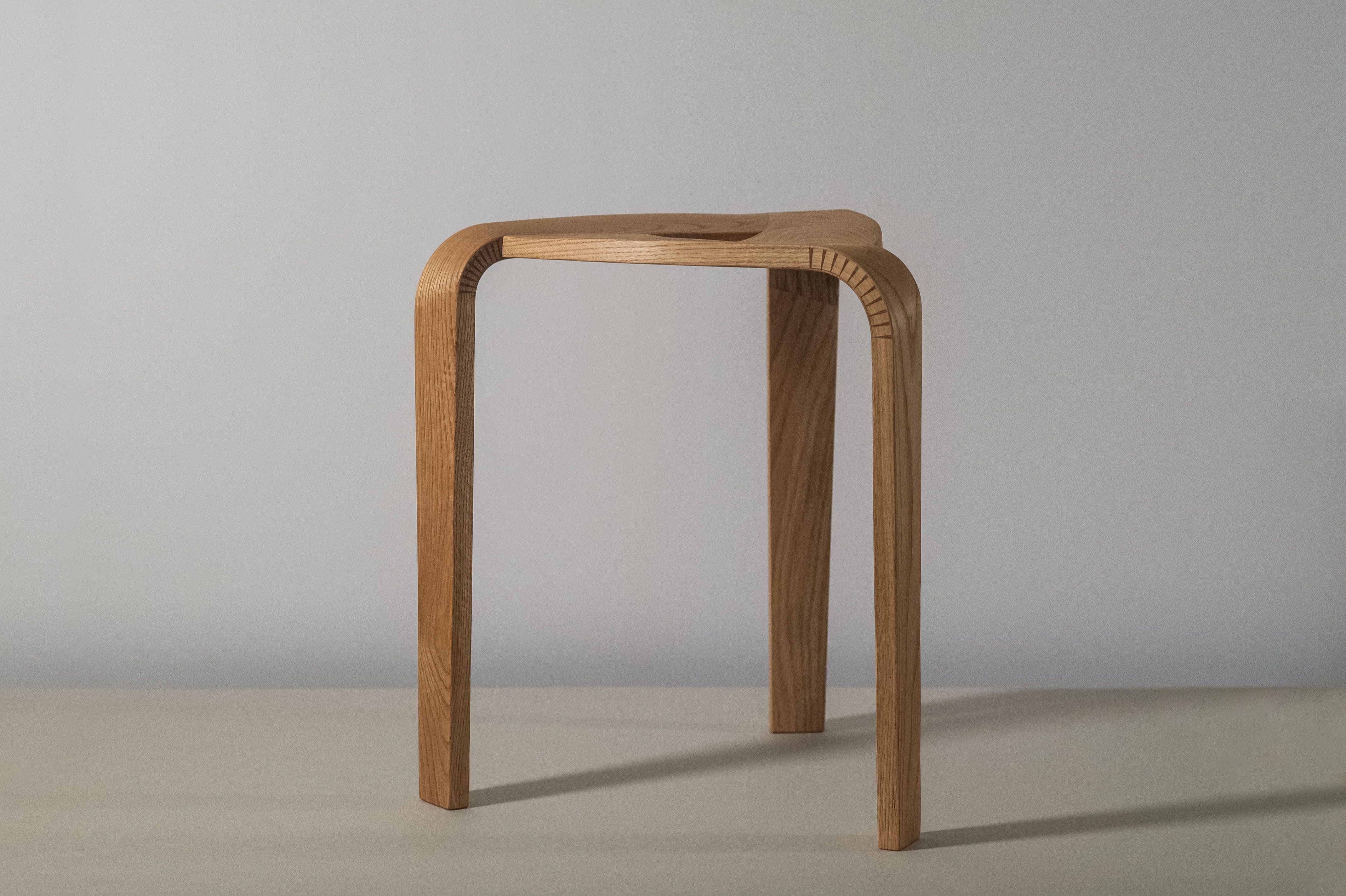 The fine detailing of the splined kerf knee joint is predominantly exposed on this simple, yet elegantly formed stool; whether it’s standalone, grouped or stacked in multiples, in a spiralling formation.