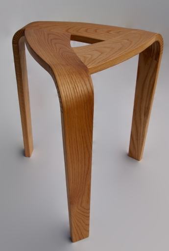 Each leg is arched using an innovative kerf technique, which forms a conical knee bend that cambers the seating element inwards. The joined seating elements create a shallow ergonomic bowl with a triangular void, which serves as a carrying handle.