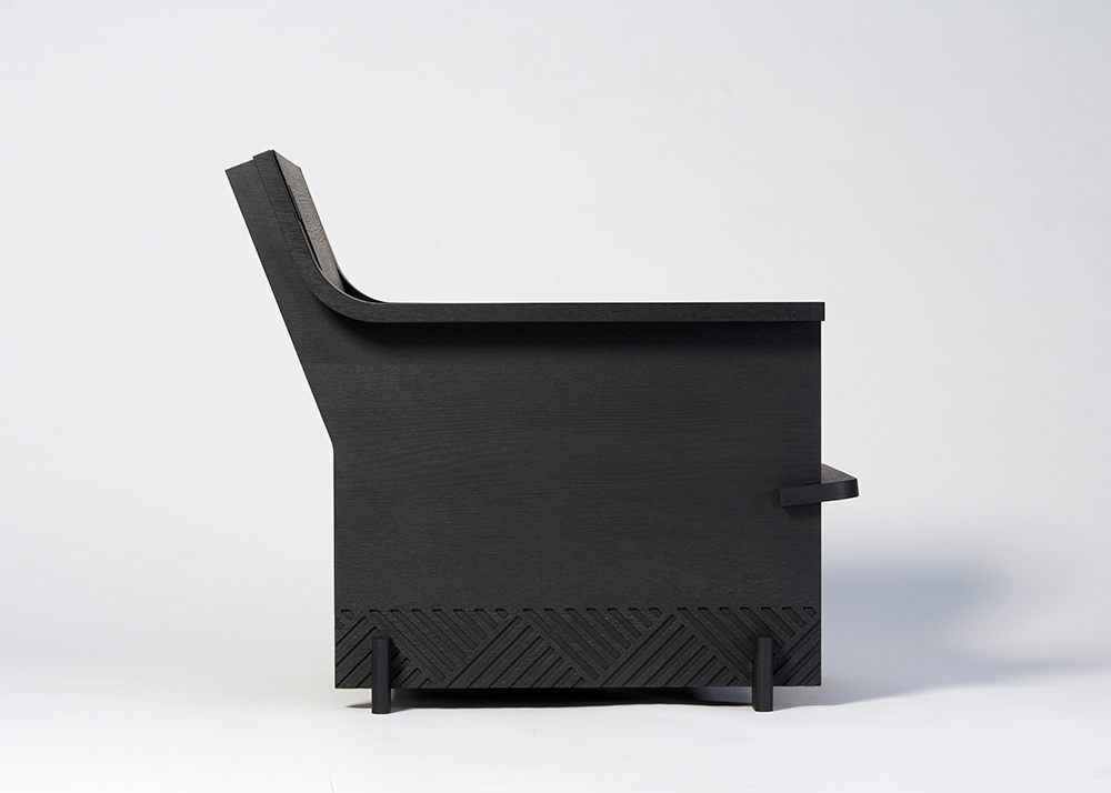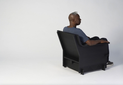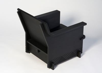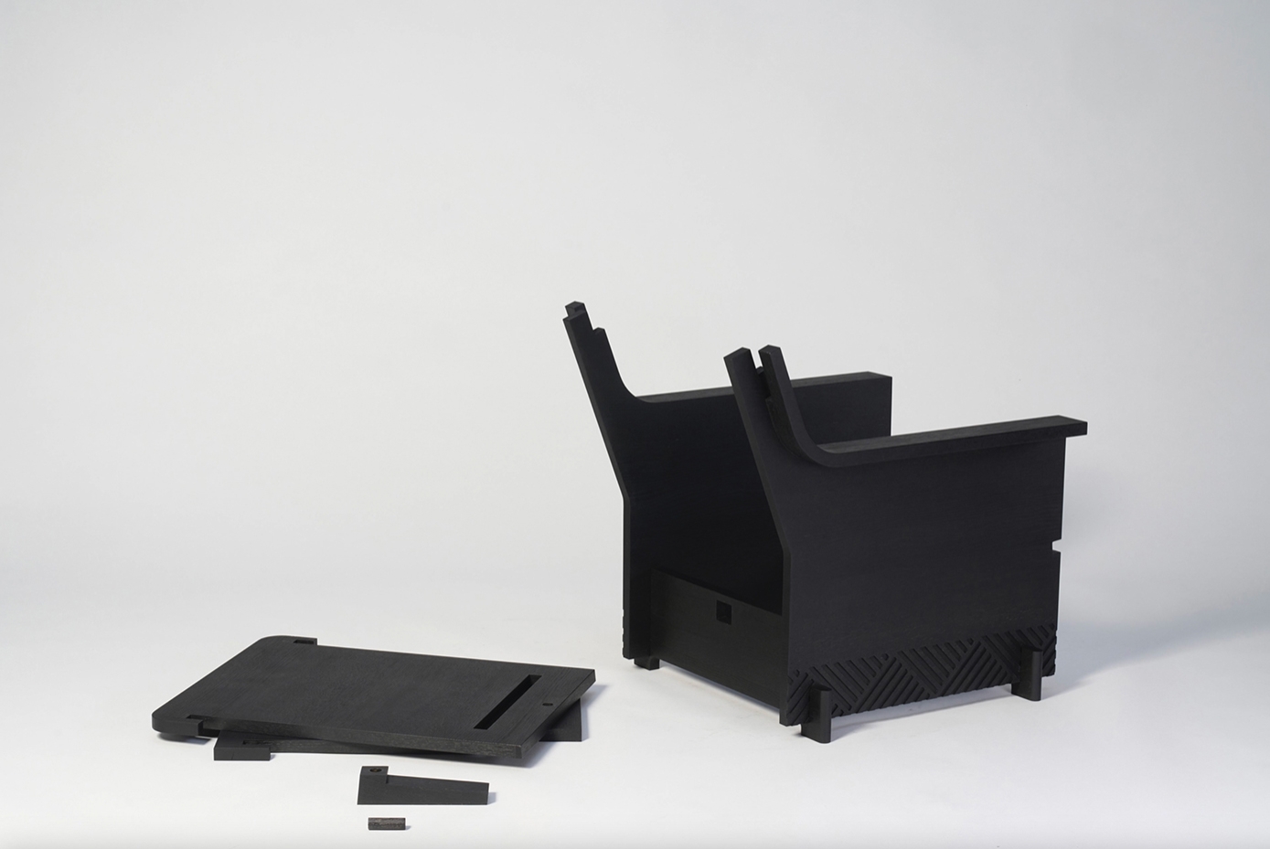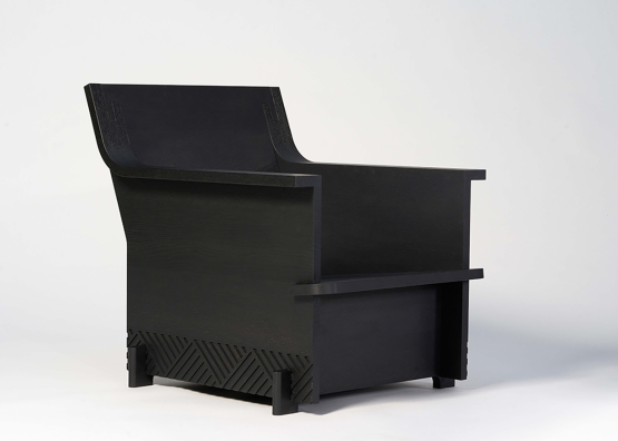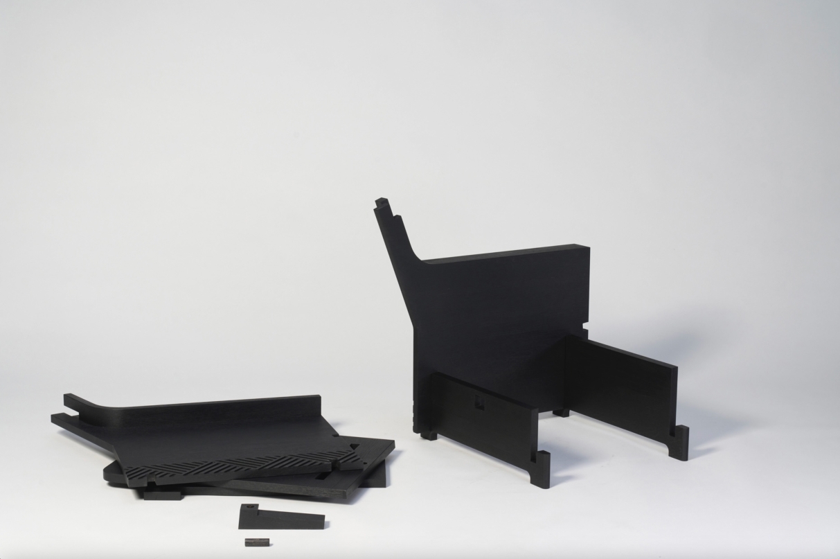 An armchair consisting of 4 simple, interlocking wooden planks.