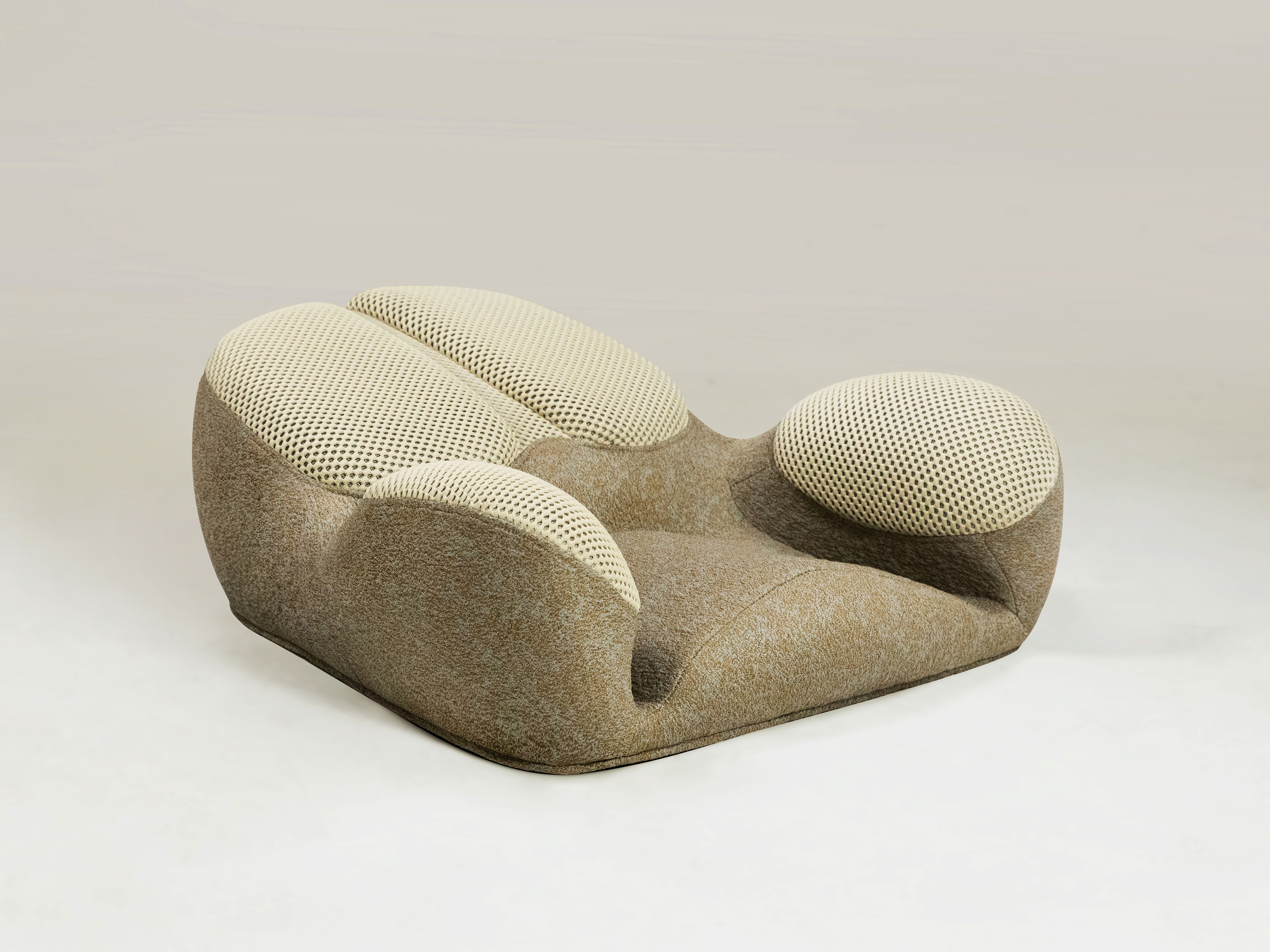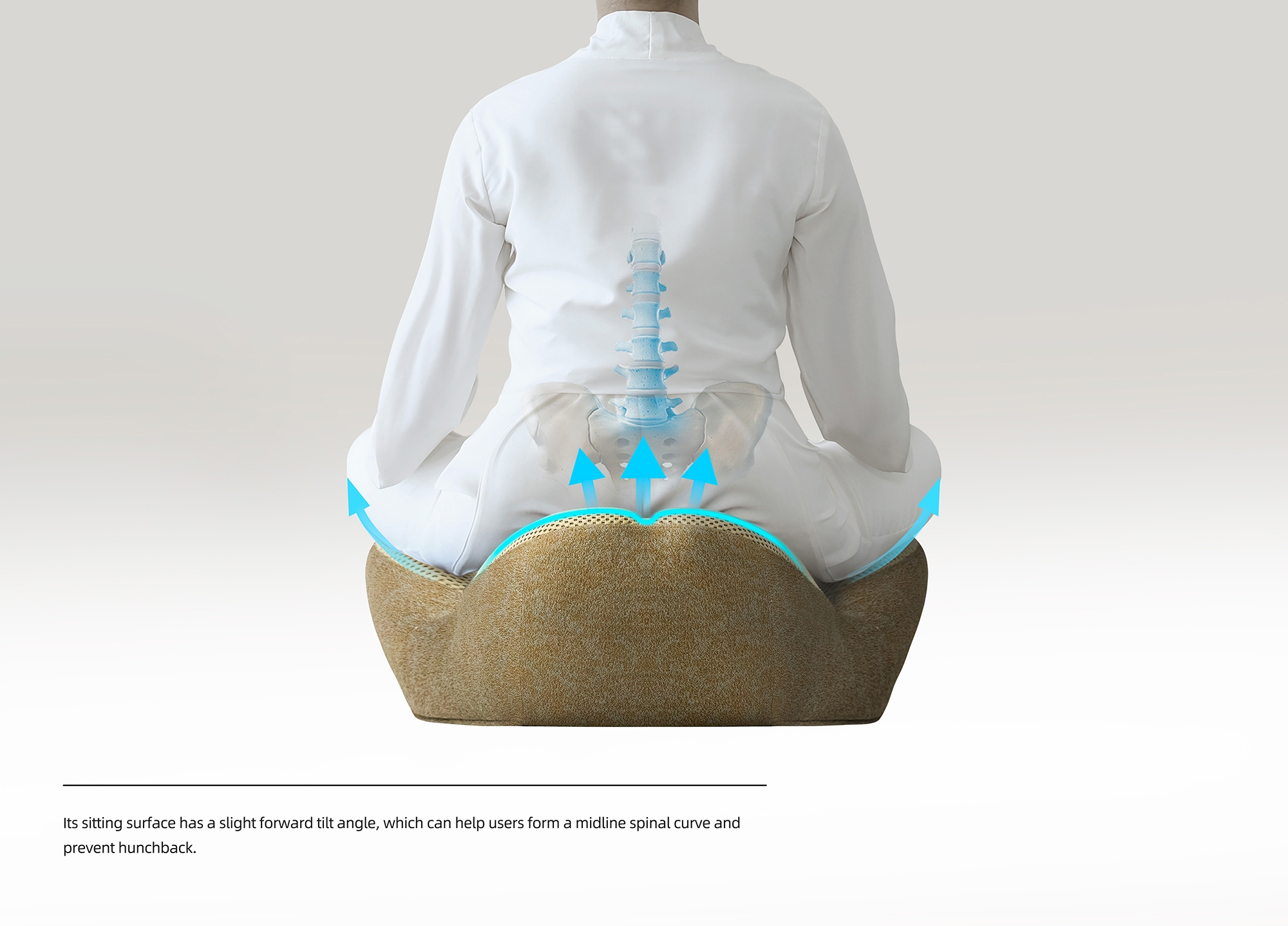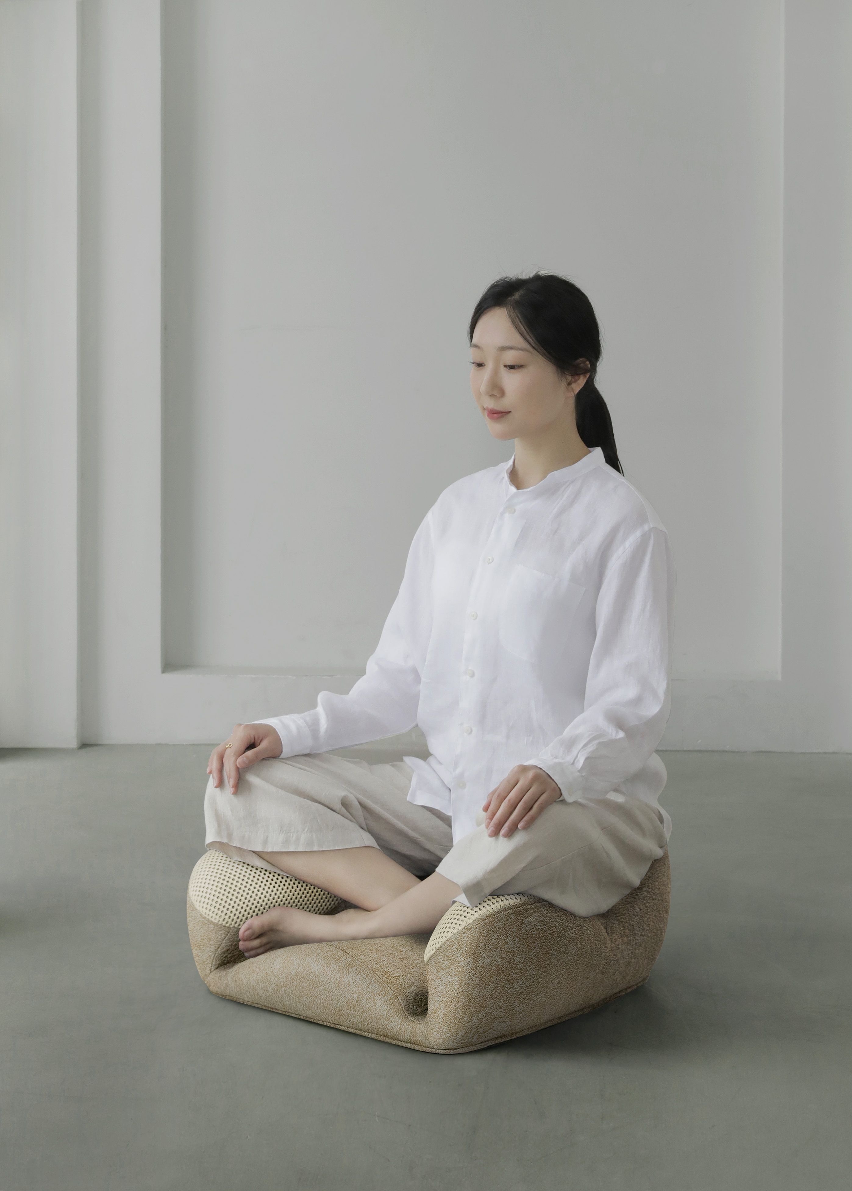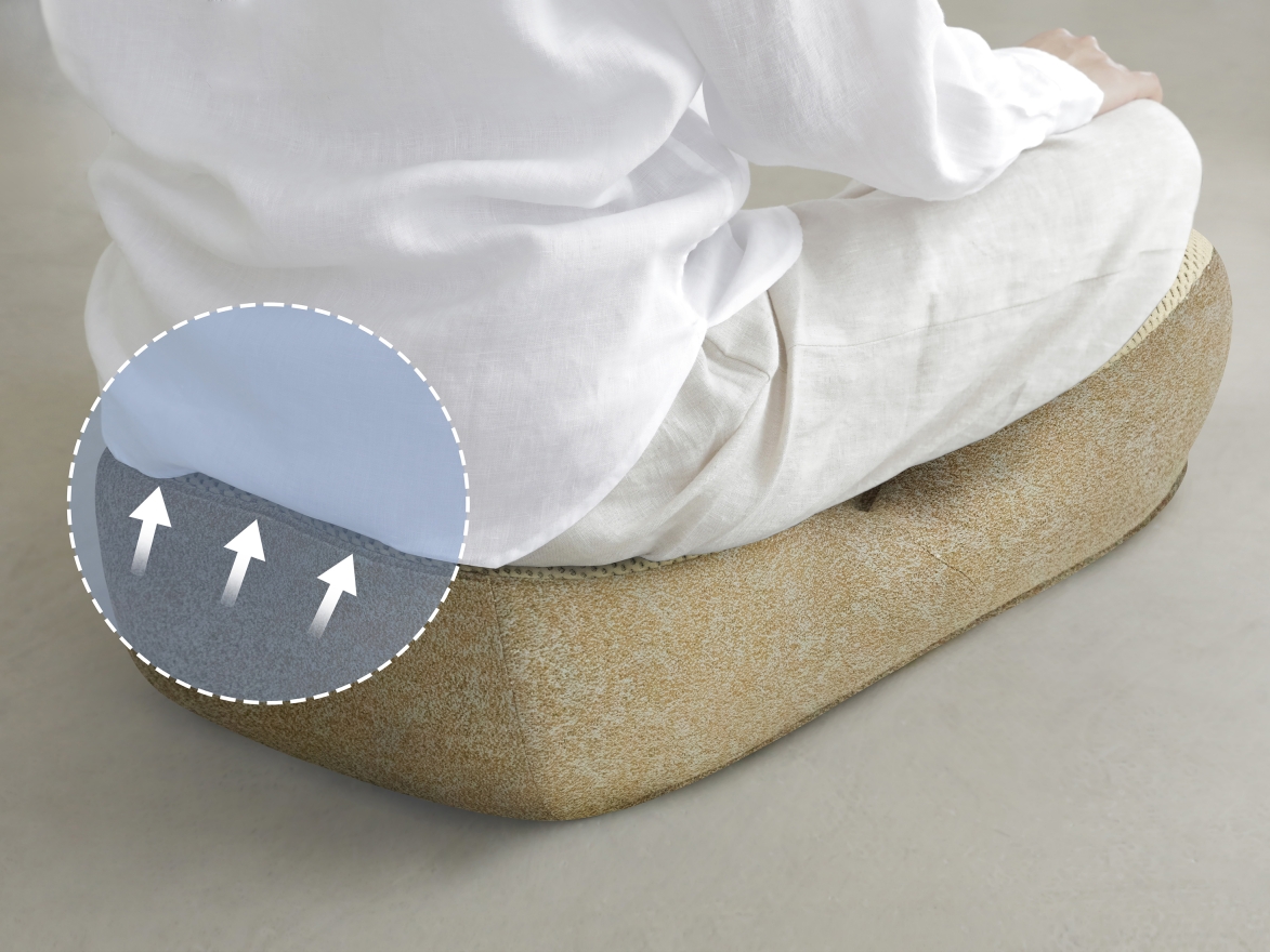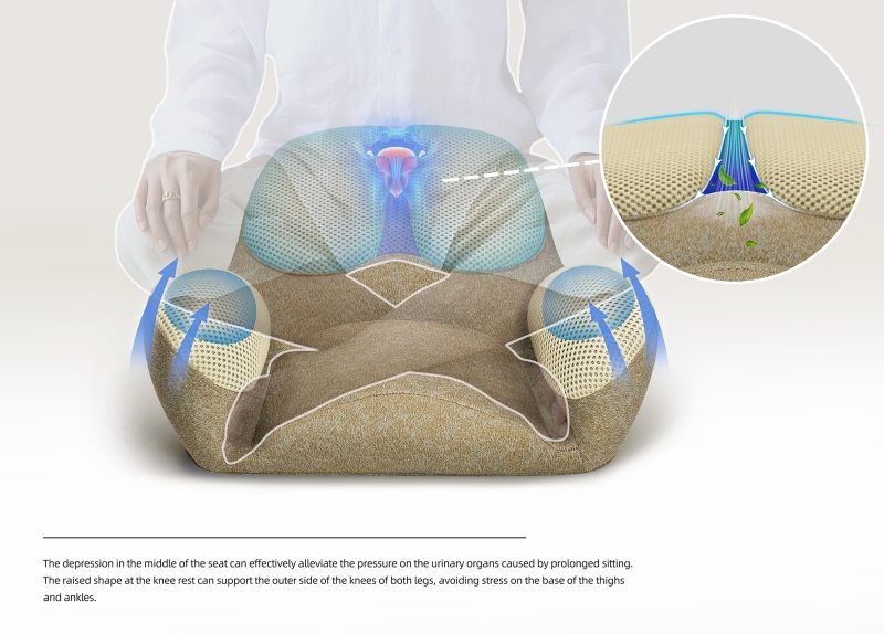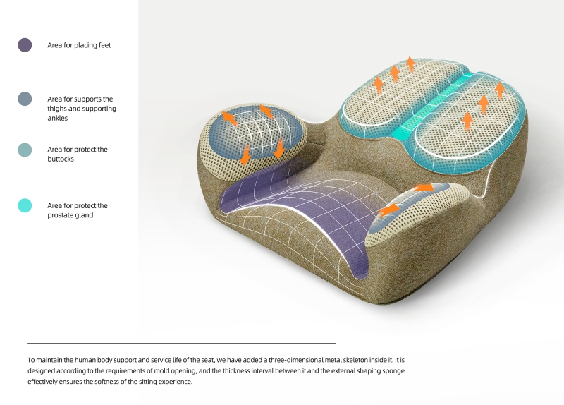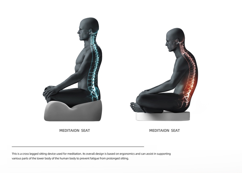 This is a cross legged sitting device used for meditation. Its overall design is based on ergonomics and can assist in supporting various parts of the lower body of the human body to prevent fatigue from prolonged sitting.Because its design inspiration comes from the claws of dogs and borrows the spirit of the ancient Greek philosophical school of cynicism as the design direction, it is named Cynicism. This seat is a type of furniture that helps people better enter a meditative state and can also be used for various activities such as cross legged sitting. To maintain the human body support and service life of the seat, we have added a three-dimensional metal skeleton inside it. It is designed according to the requirements of mold opening, and the thickness interval between it and the external shaping sponge effectively ensures the softness of the sitting experience.