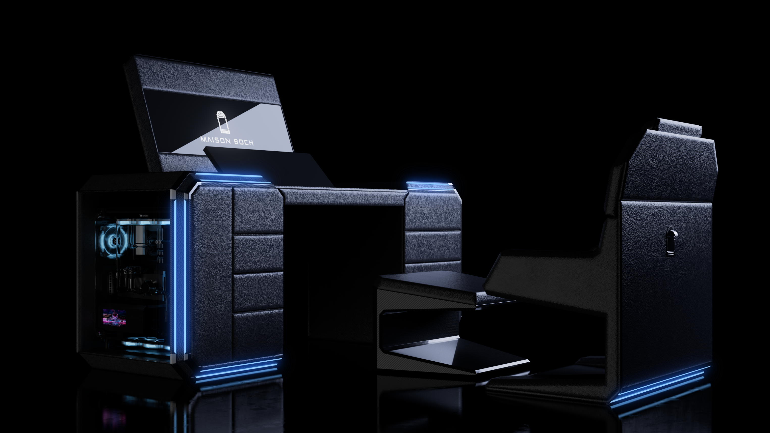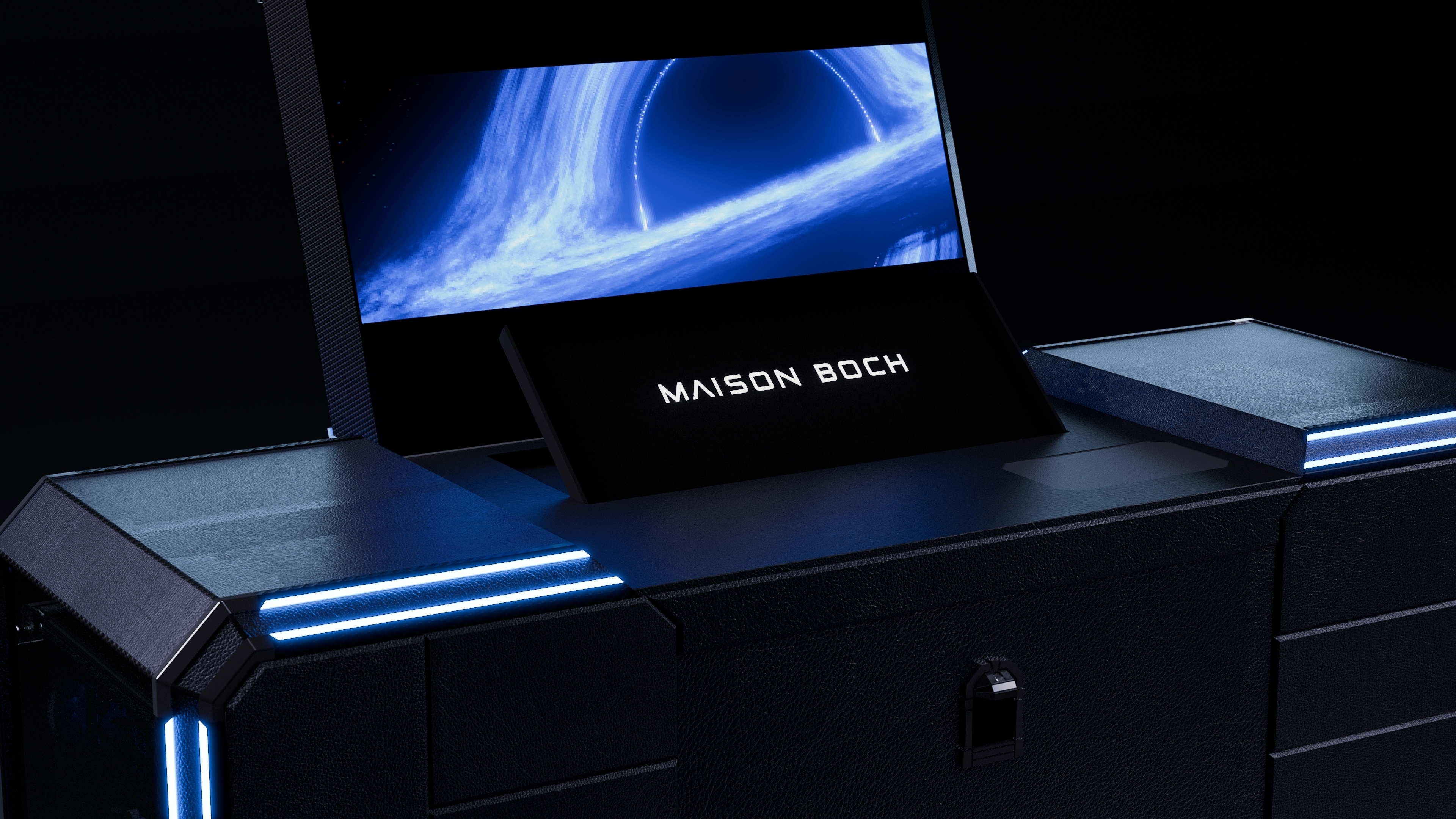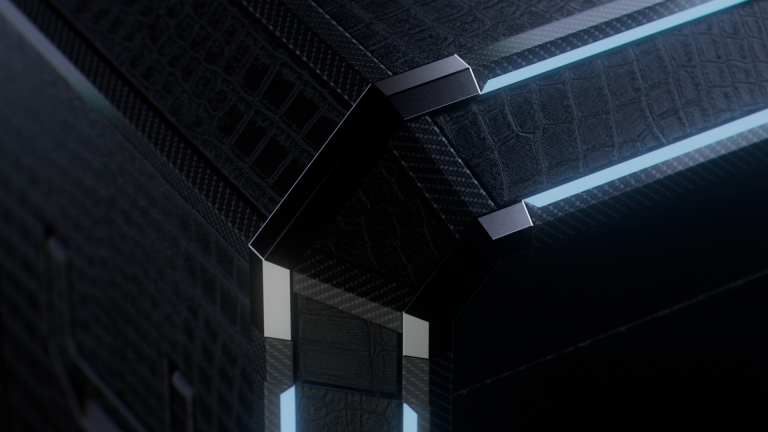 This desk trunk reimagines mobile workspaces through a fusion of traditional craftsmanship and modern engineering. At first glance, it appears as a clean, compact trunk with a diamond-inspired silhouette, an aesthetic choice that balances strength, elegance, and structure. When activated via a central control panel, the trunk transforms into a fully integrated workstation featuring dual screens, a slide-out PC drawer, and a concealed seating system. The removable chair is released through a motorized mechanism. Customisable drawers, a built-in footrest, and integrated touch controls are included. A single power source supports the system, including private satellite connectivity for remote or maritime environments. Materials include recycled carbon fibre, hand-polished 3D-printed titanium, and premium vegetable tanned leathers, bridging cutting-edge fabrication and heritage detailing. The trunk is illuminated by an ambient light signature in a custom blue tone, echoing its conceptual origins in legacy, transmission, and timeless design. Each unit is made to order, allowing tailored configurations to match the owner's lifestyle and legacy.