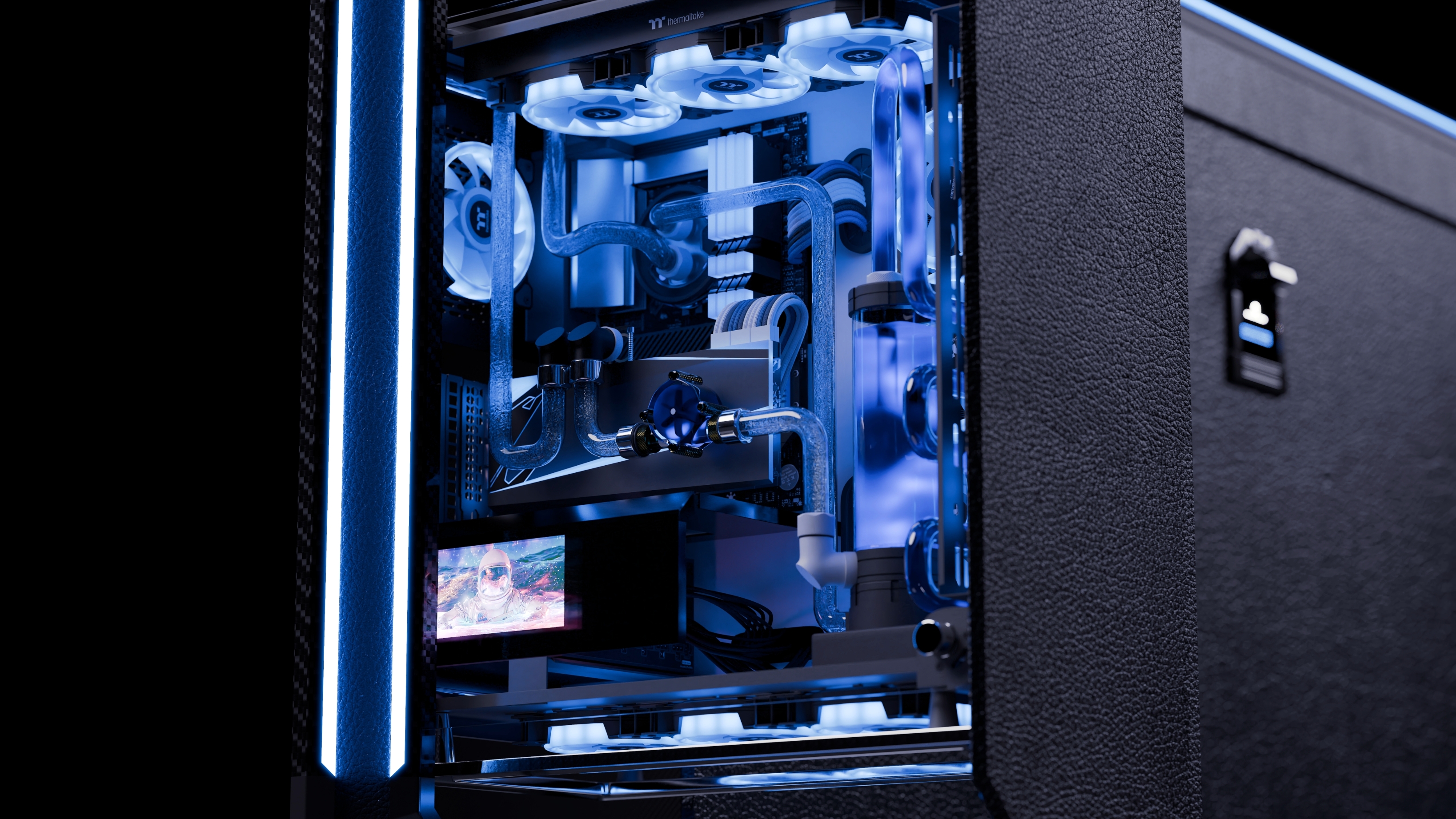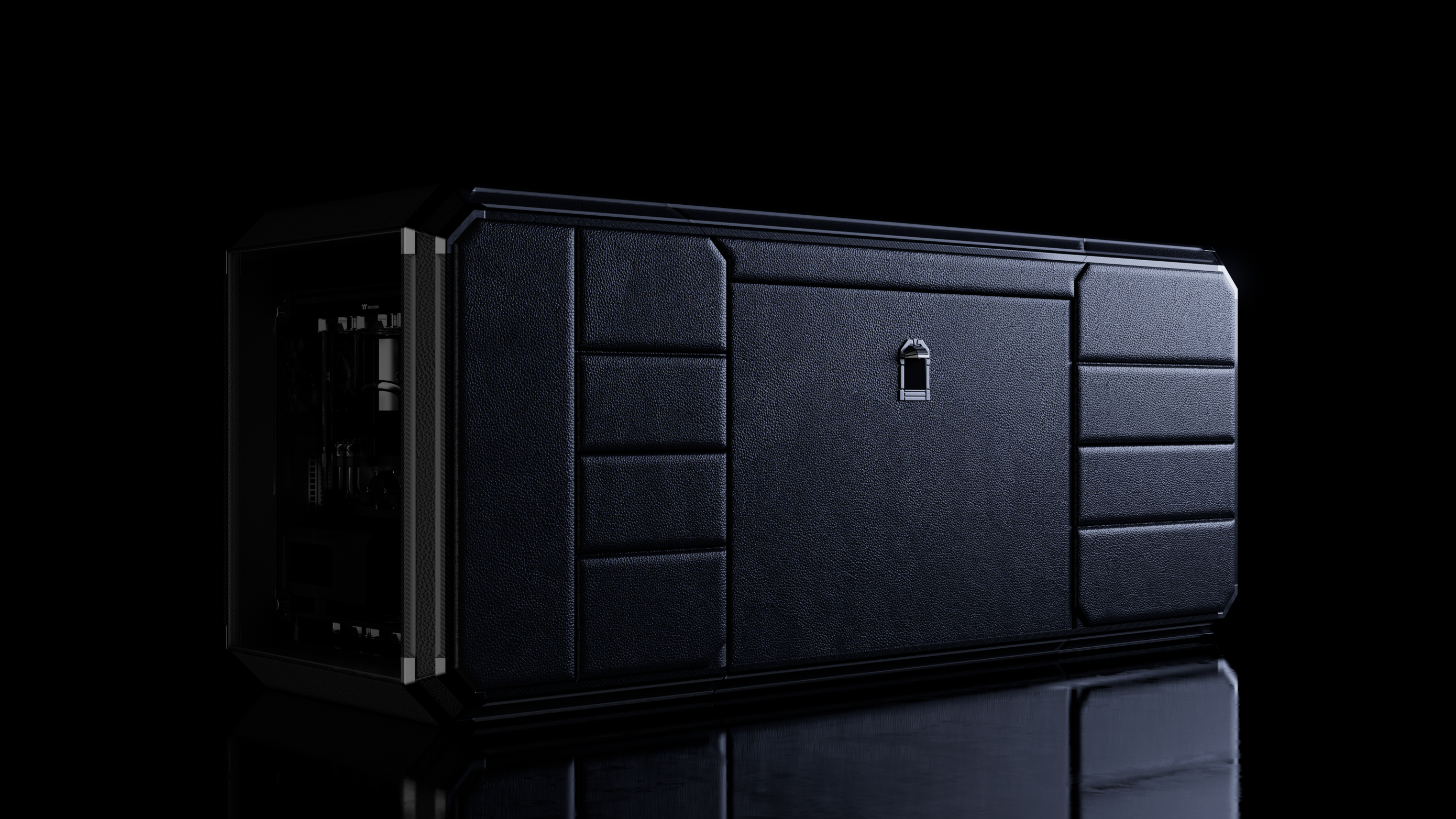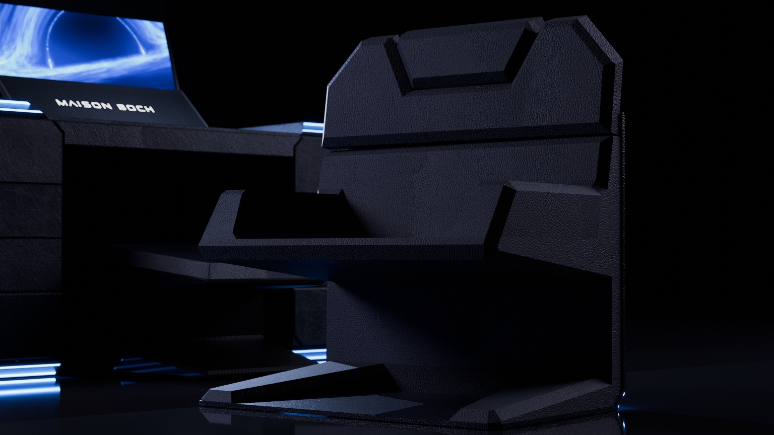 This desk trunk reimagines mobile workspaces through a fusion of traditional craftsmanship and modern engineering. At first glance, it appears as a clean, compact trunk with a diamond-inspired silhouette, an aesthetic choice that balances strength, elegance, and structure. When activated via a central control panel, the trunk transforms into a fully integrated workstation featuring dual screens, a slide-out PC drawer, and a concealed seating system. The removable chair is released through a motorized mechanism. Customisable drawers, a built-in footrest, and integrated touch controls are included. A single power source supports the system, including private satellite connectivity for remote or maritime environments. Materials include recycled carbon fibre, hand-polished 3D-printed titanium, and premium vegetable tanned leathers, bridging cutting-edge fabrication and heritage detailing. The trunk is illuminated by an ambient light signature in a custom blue tone, echoing its conceptual origins in legacy, transmission, and timeless design. Each unit is made to order, allowing tailored configurations to match the owner's lifestyle and legacy.