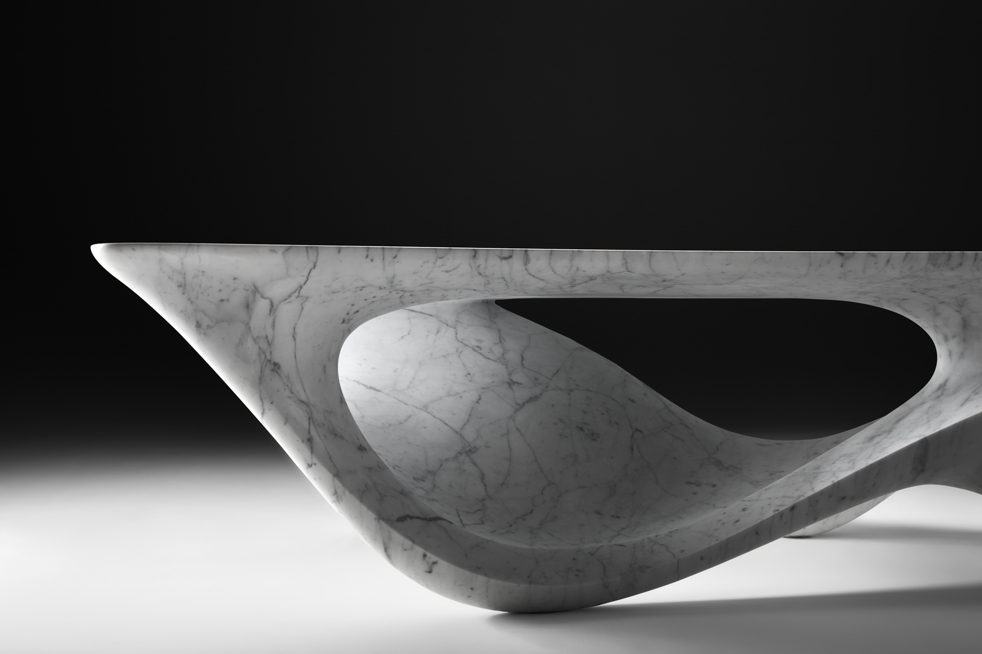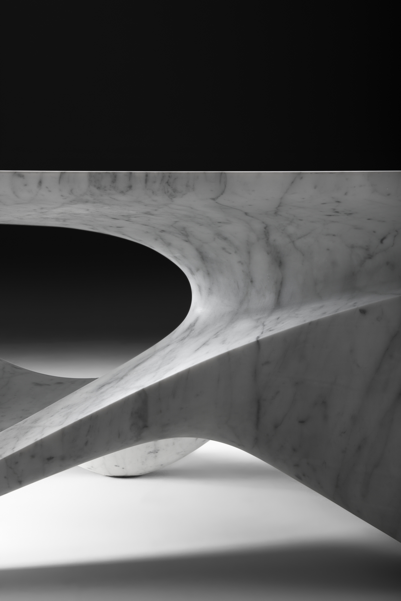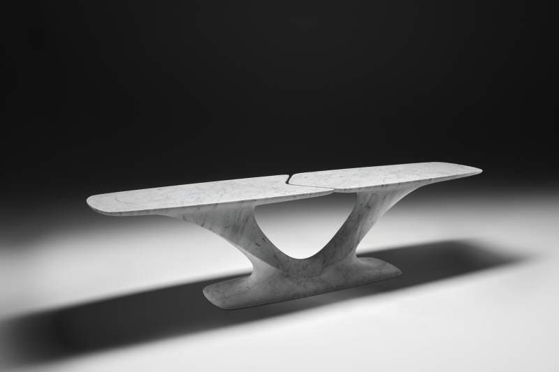 Carved from the finest Carrara marble, the fluid forms and sinuous lines of the collection blur the boundary between furniture and sculpture, suggesting an alternative concept of space.