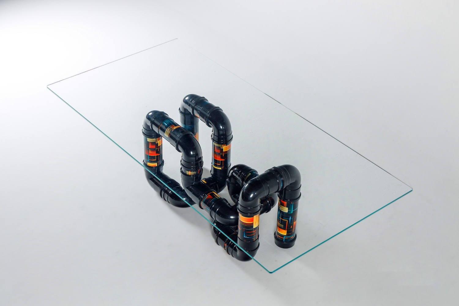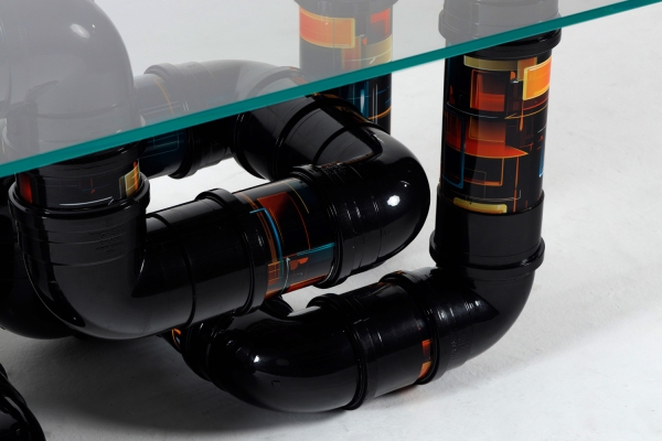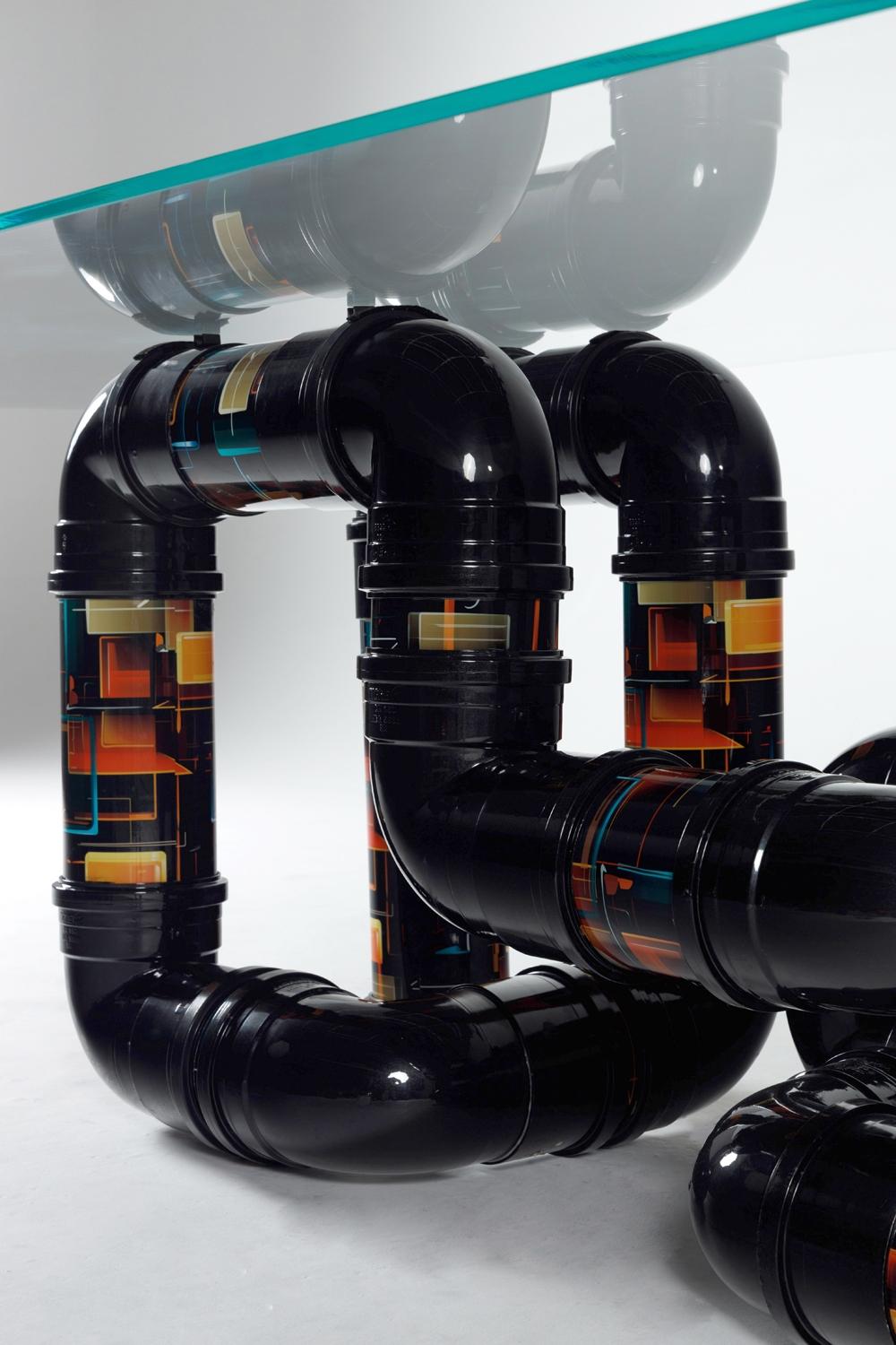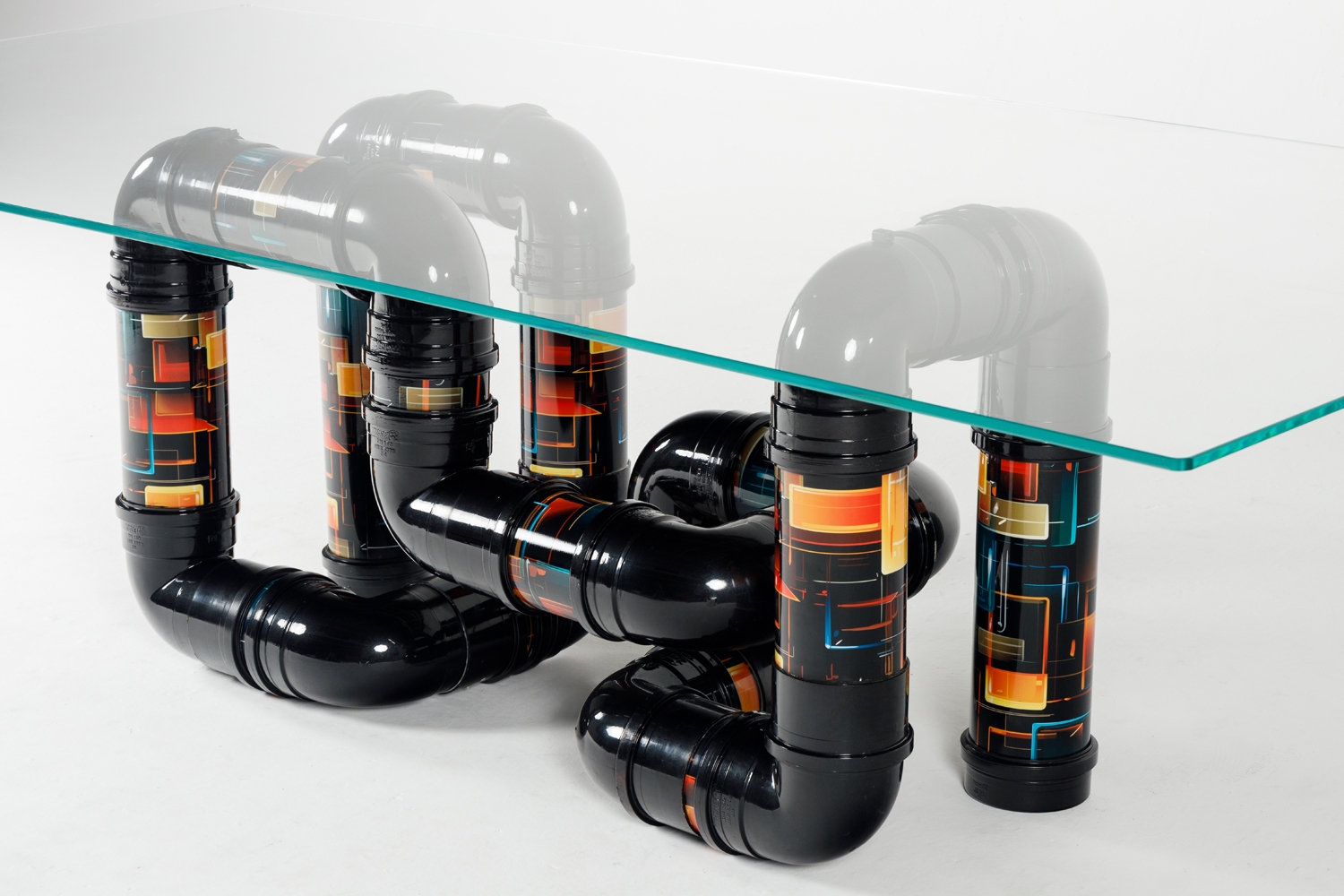 Taking a raw material that is part of our daily lives out of context was the starting point for creating the Conexão 08 dining table. Its base, which supports a 2.60m by 1.30m glass top weighing around 140 kg, has a challenging and curious design that moves sinuously from one side of the piece to the other, provoking the observer in a playful way. With ergonomics as a premise, the table was built with oversized PVC Pipes and Pipe Fittings with vehicle wrapping, after several experiments to ensure that its structure and resistance has the stability necessary for its functional use.