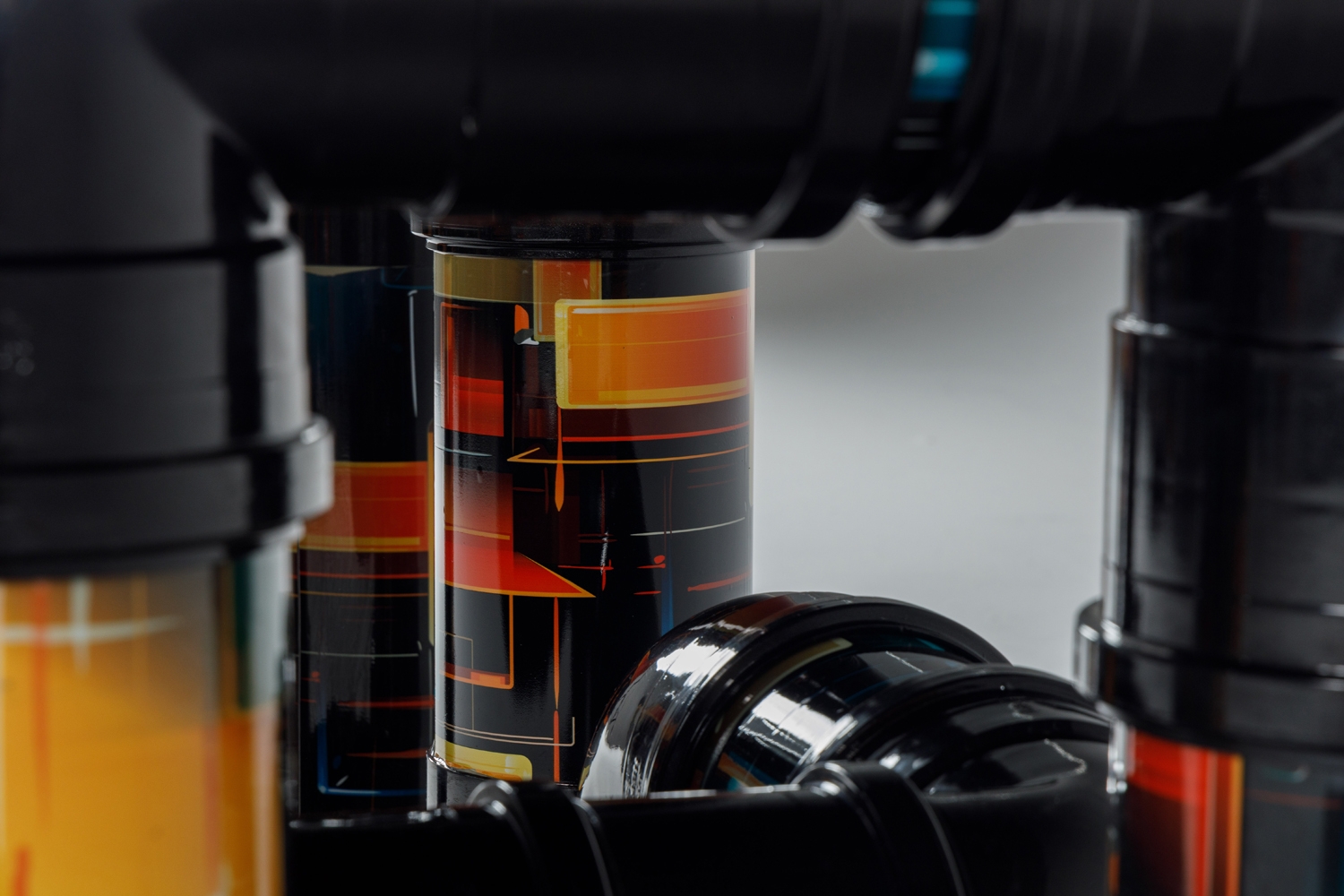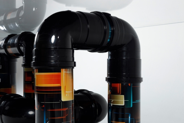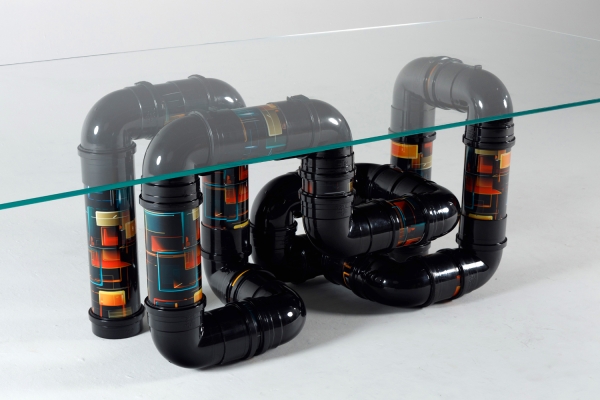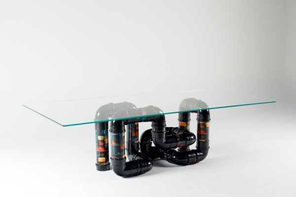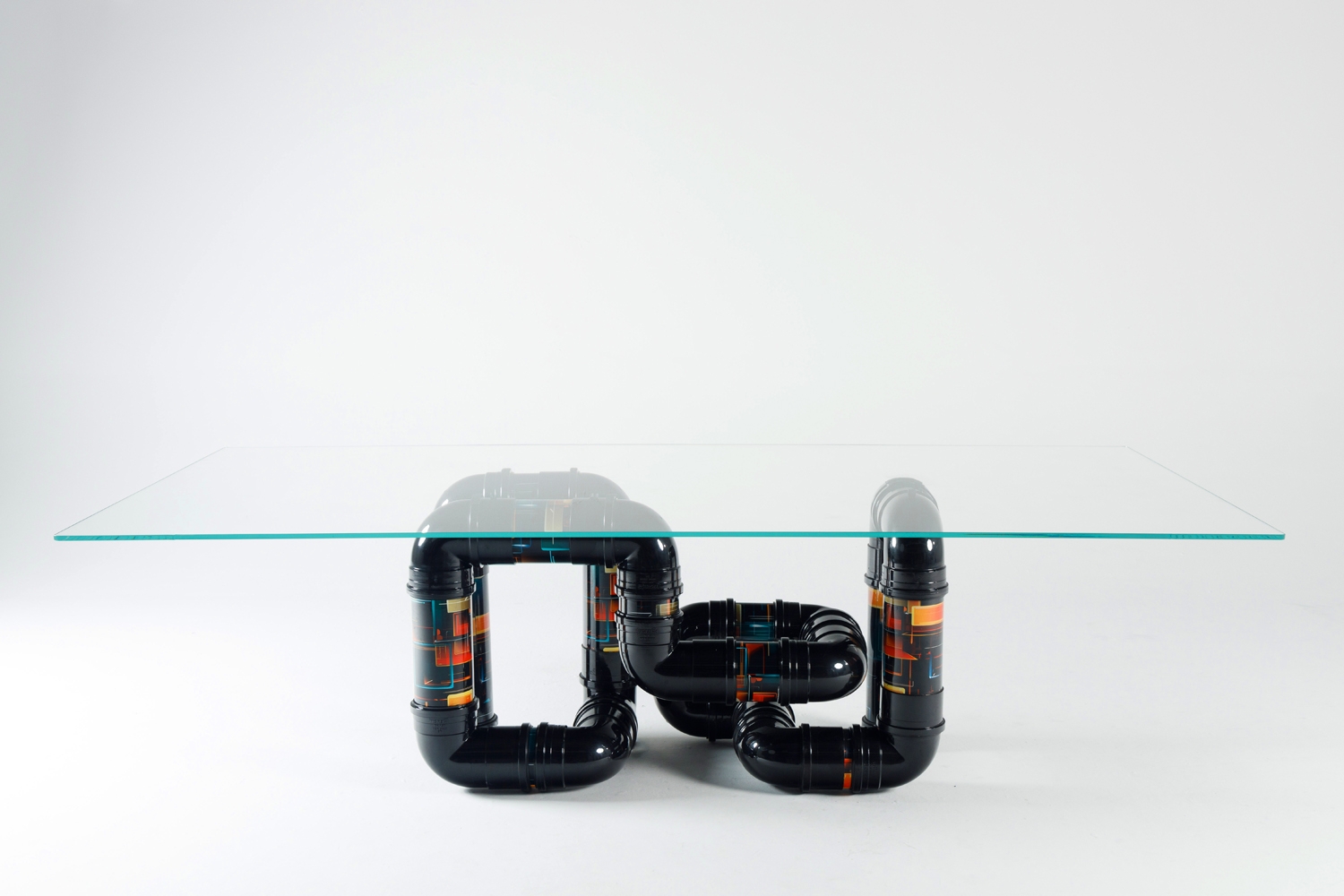 Taking a raw material that is part of our daily lives out of context was the starting point for creating the Conexão 08 dining table. Its base, which supports a 2.60m by 1.30m glass top weighing around 140 kg, has a challenging and curious design that moves sinuously from one side of the piece to the other, provoking the observer in a playful way. With ergonomics as a premise, the table was built with oversized PVC Pipes and Pipe Fittings with vehicle wrapping, after several experiments to ensure that its structure and resistance has the stability necessary for its functional use.