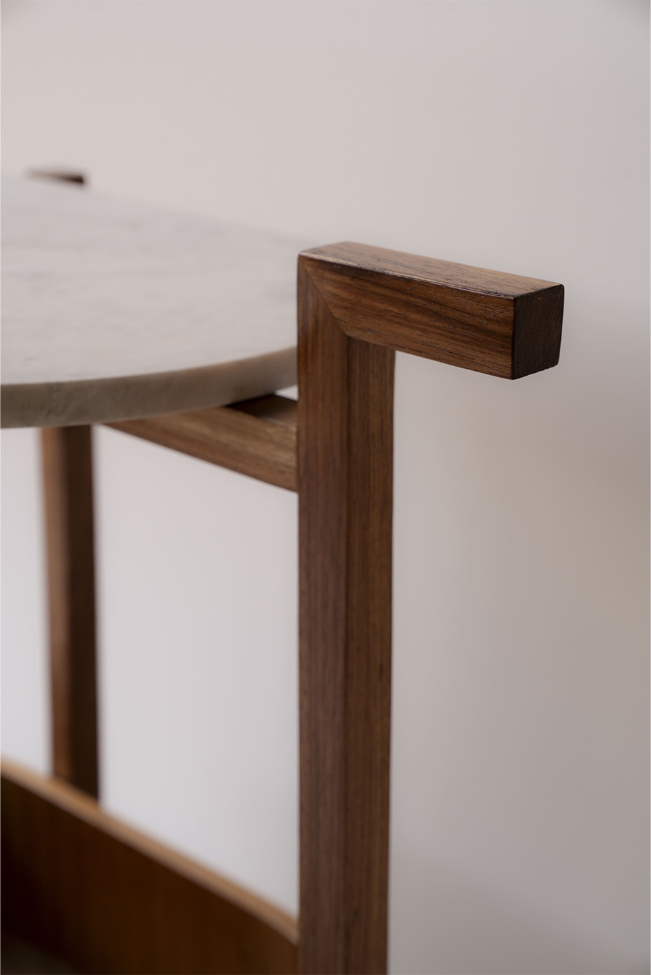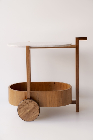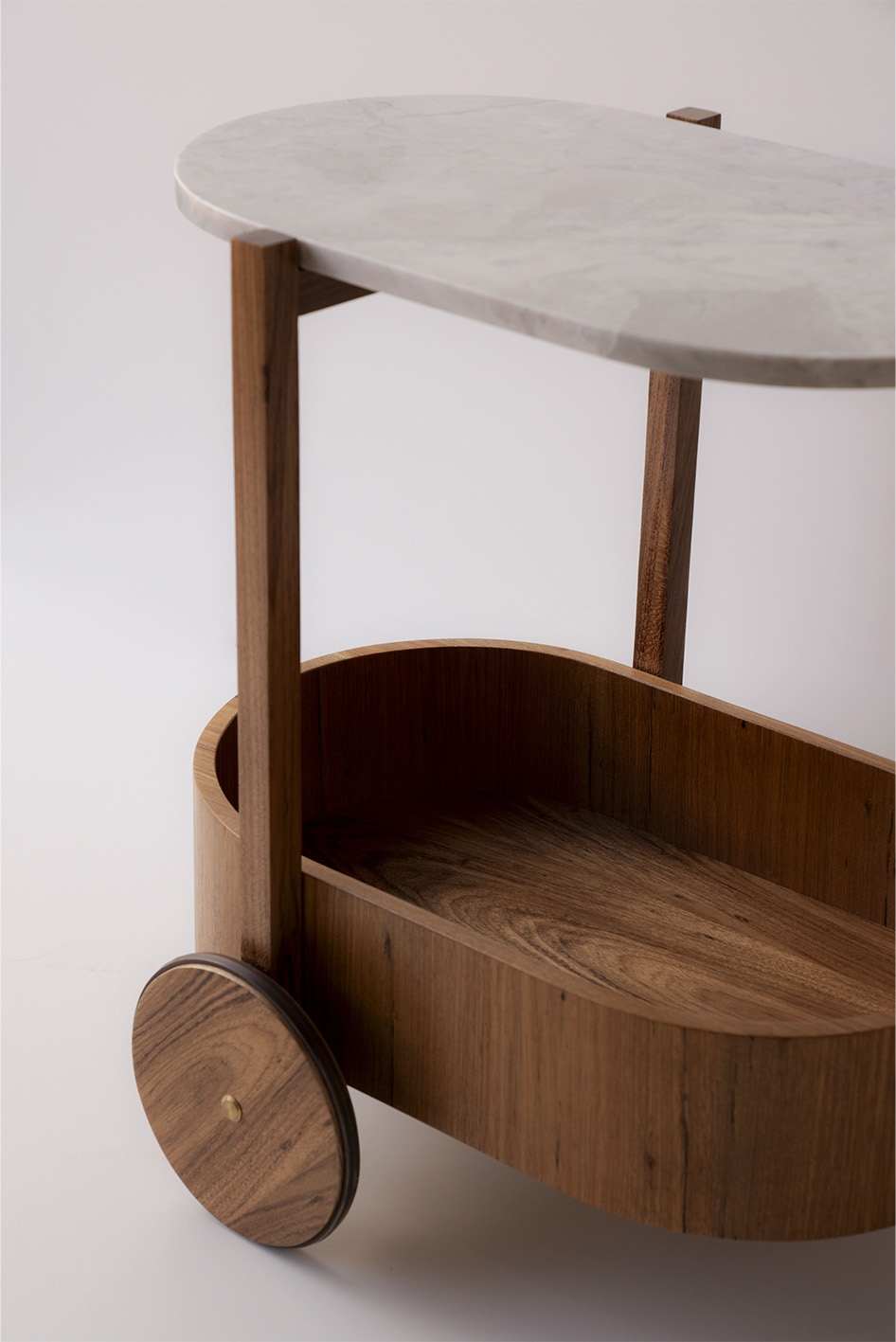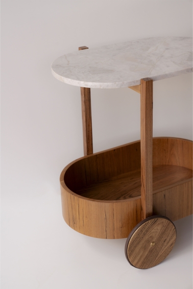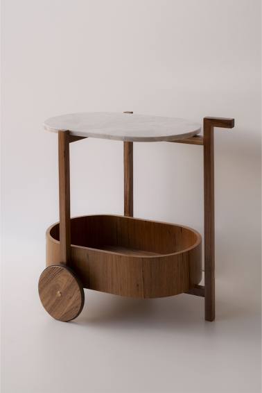 Inspired by the clean lines and functional elegance of modernism, TÉA is crafted with attention to detail and durable materials. The top is made from fine Brazilian marble, while the structure and tray are built from freijó wood, a native species valued for its durability and warm tones. The curved elements introduce a sense of movement, and the three-point solid wood frame enhances the piece’s visual lightness. Subtle brass details on the wheels complete the design with a refined and understated elegance.