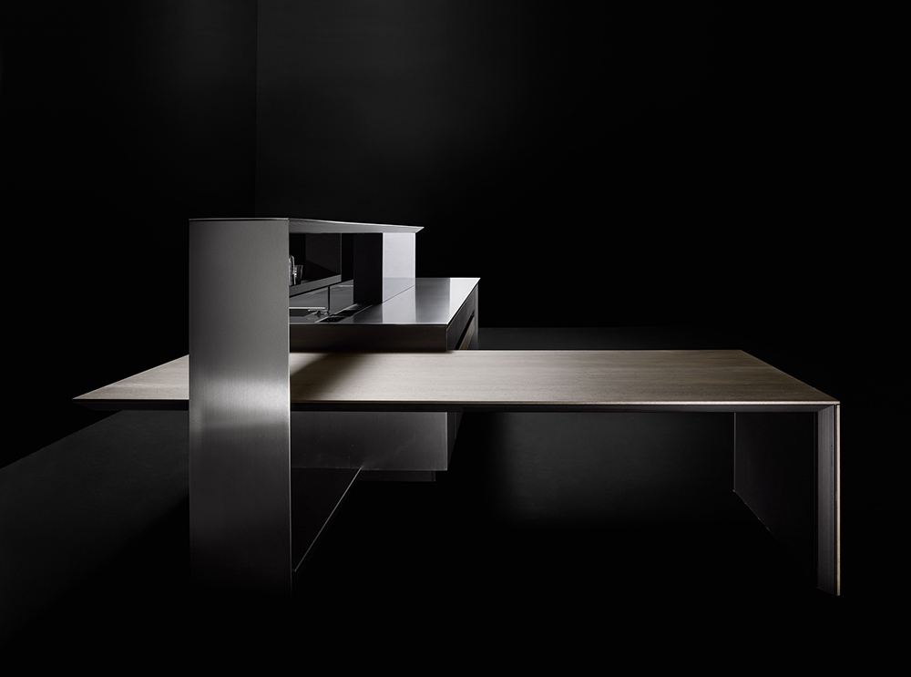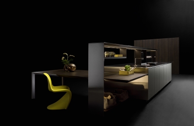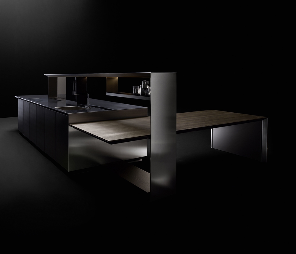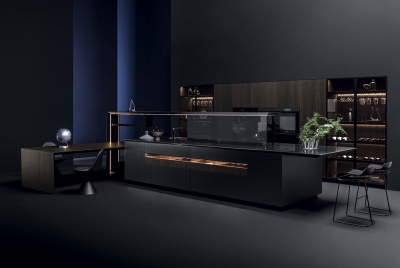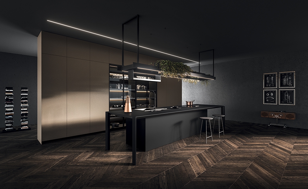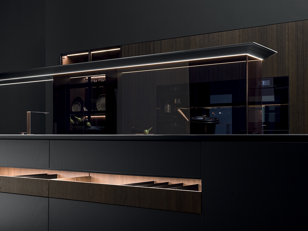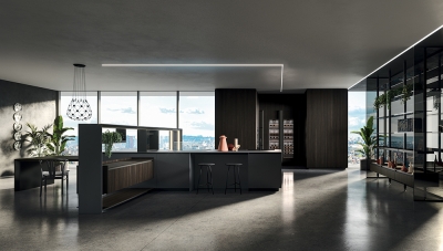 NAUTILA - From place for sharing to functional and multi-tasking micro-architecture. Nautila by Arrital is the combination of performance, design and innovation.The new kitchen system, designed by the architect Franco Driusso, is inspired by a noble example of “oceanic architecture”: the shell of the Nautilus, whose internal chamber structure is recognised as one of the best-known forms of golden ratio, mathematical language of beauty. The core of the collection is the door characterized by a ribbed aluminium support (16-mm thick), a material renowned for its technical properties which adds high performance in terms of stability and lightness. Eye-catching and elegant, thanks to the geometrically perfect alternation of solid and empty spaces, the new overhead system is provided with integrated LED lighting and can store kitchen utensils and support the main service accessories, such as shelves and electrical sockets, while an integrated transparent glass element protects the cooking area.The collection is completed by the new Sipario storage system with four concealed doors, which can be configured internally in different versions, including the solution with integrated extraction.