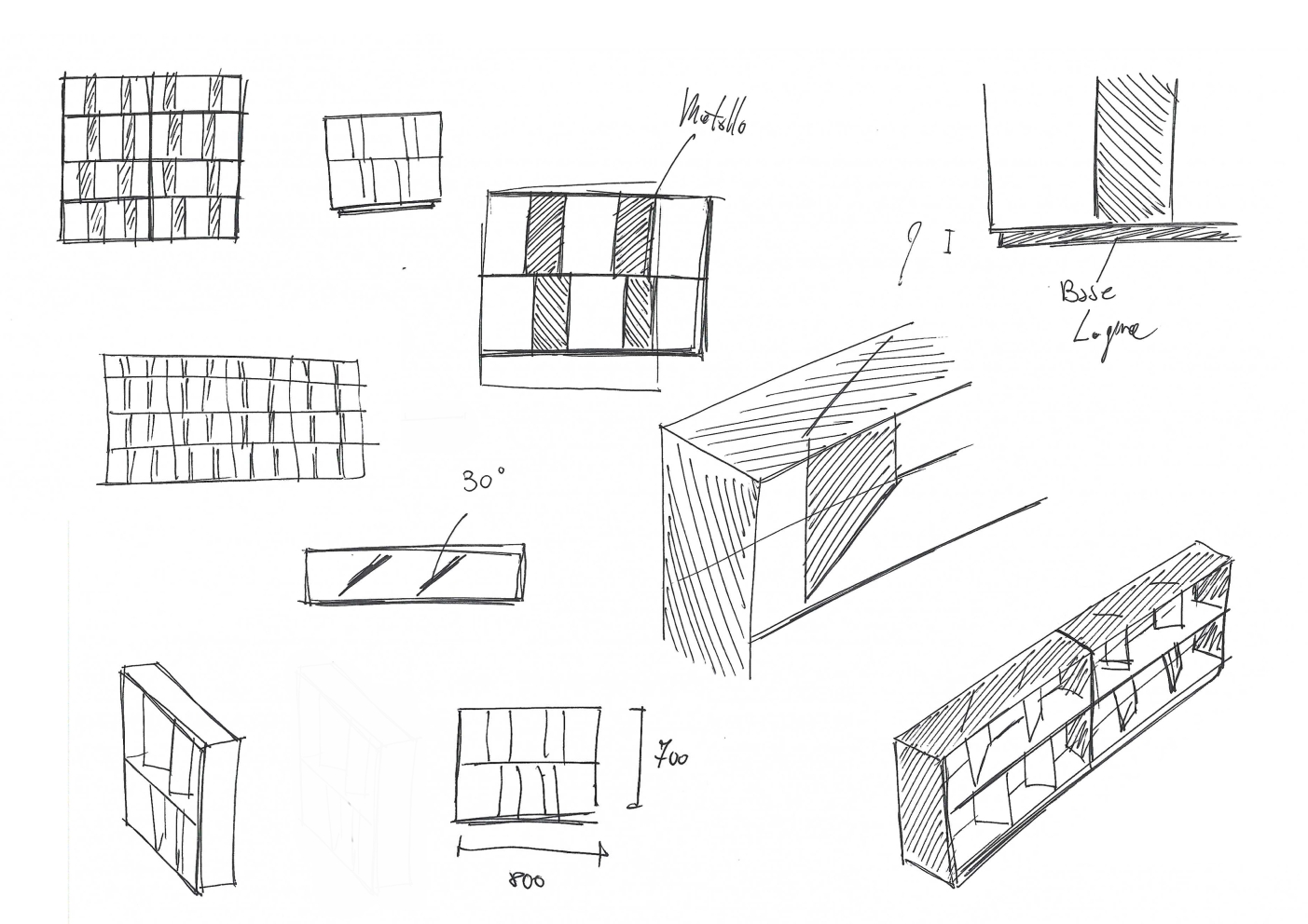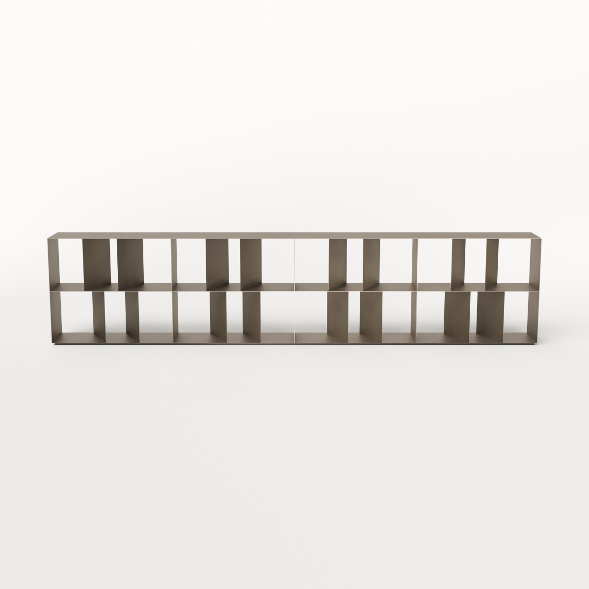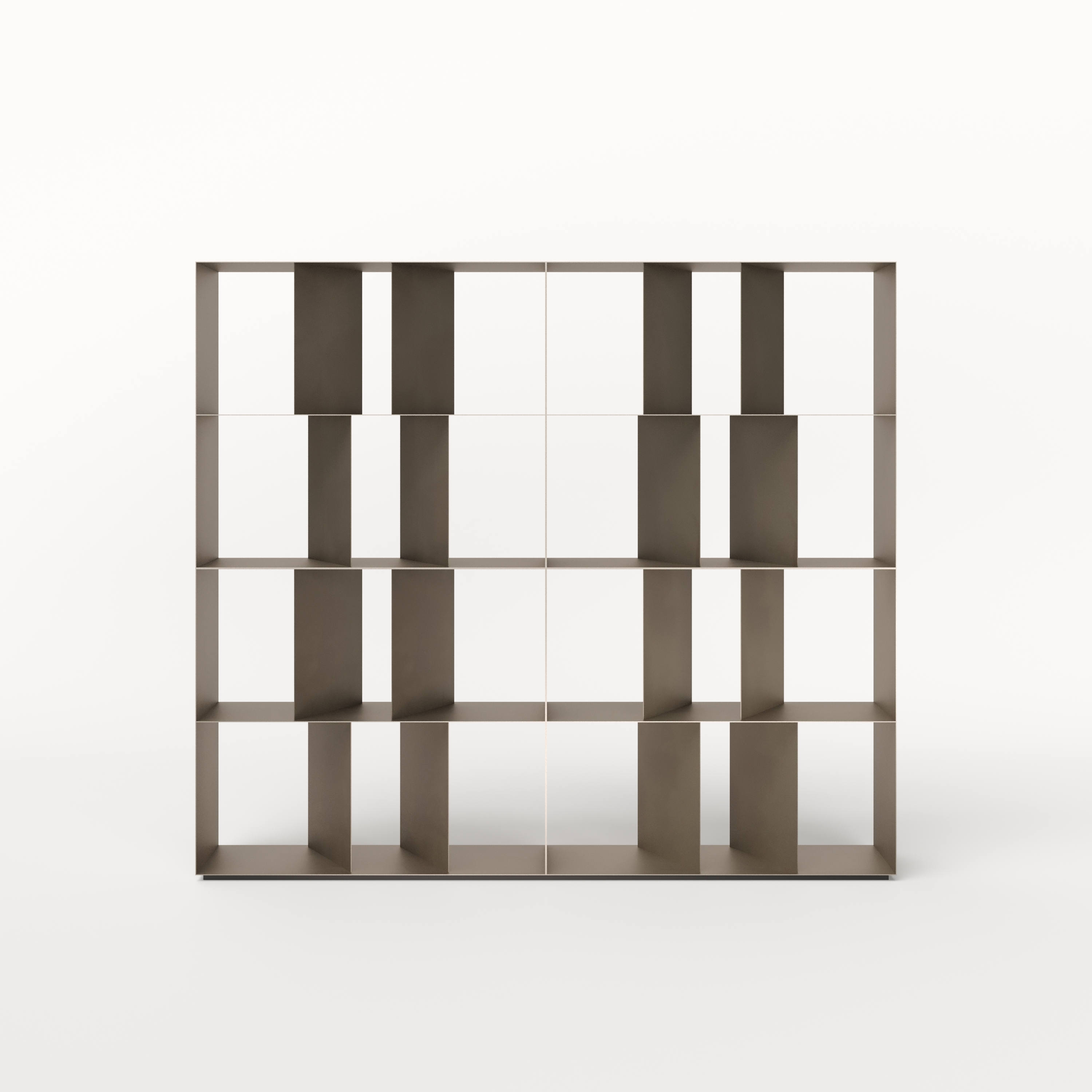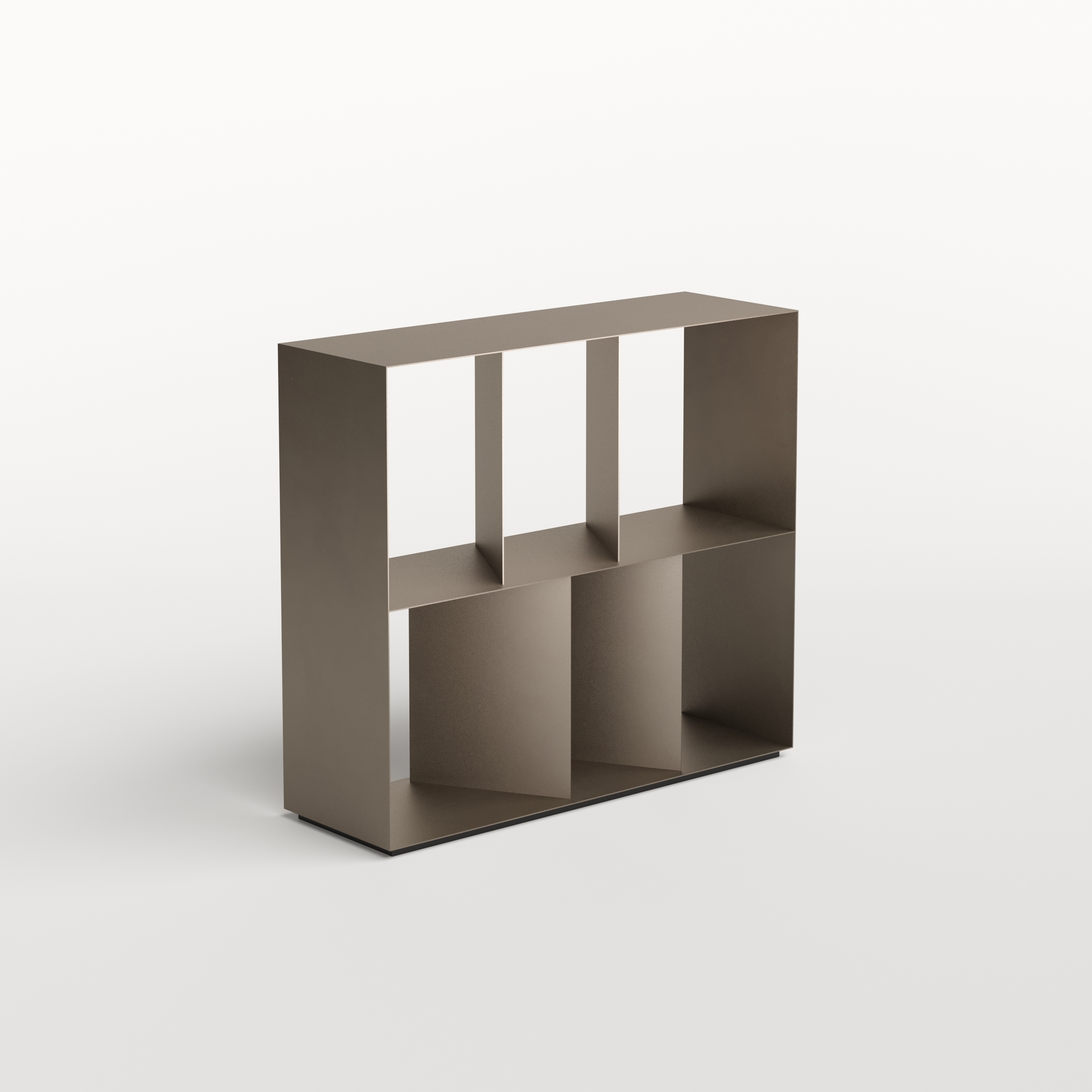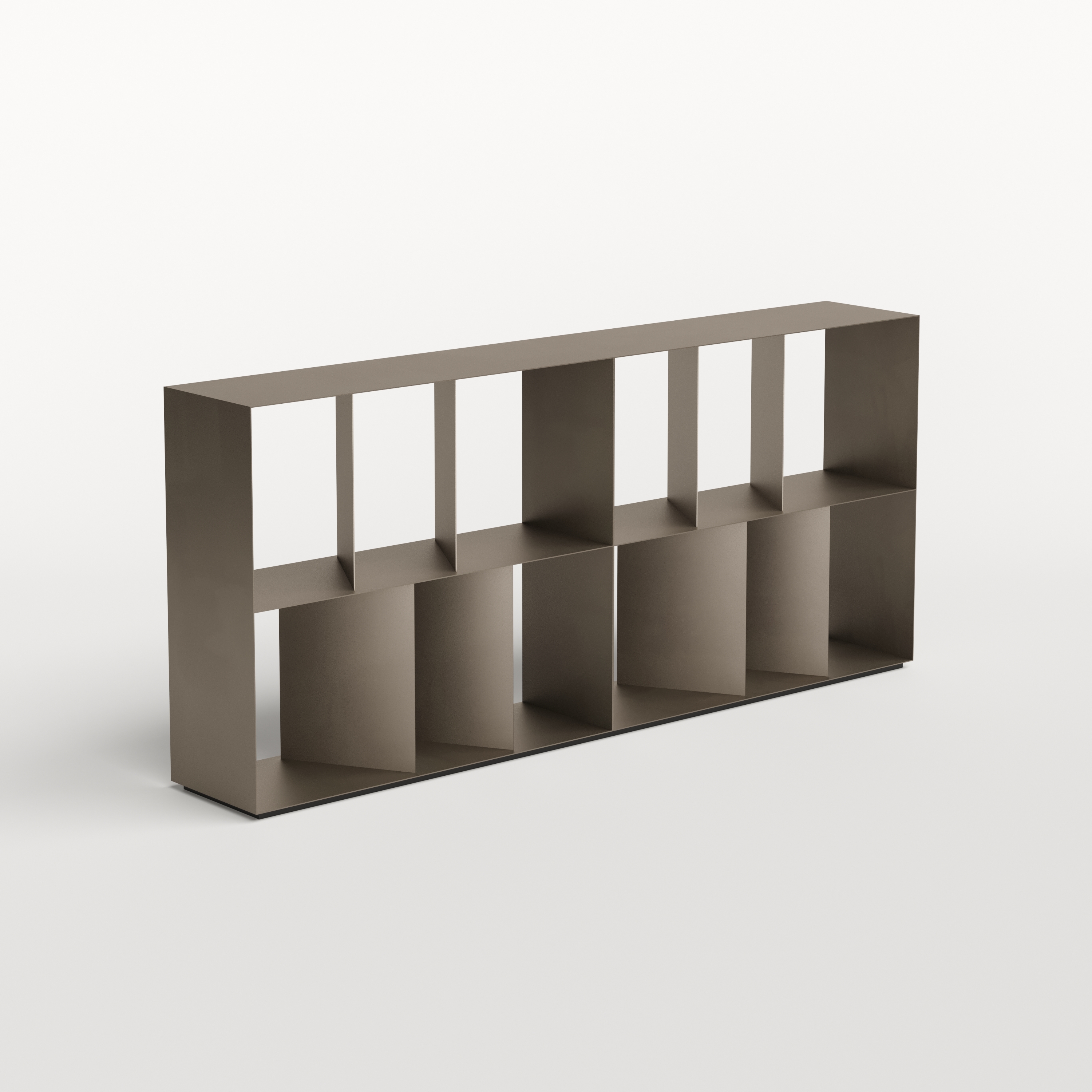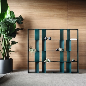 Rocky is a double-sided iron sheet bookcase designed for indoors & outdoors. It's composed of free-standing elements, which can be placed side by side and stacked, to be oriented as desired. The project is completed with a recessed wooden base, a detail designed to give more three-dimensionality to the product.