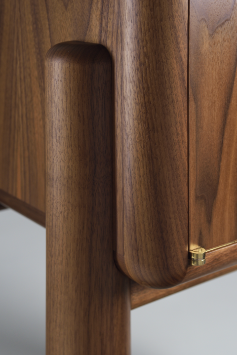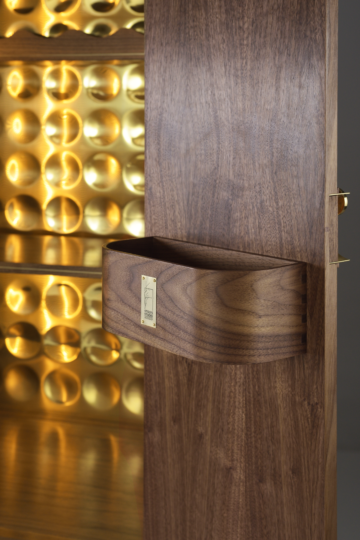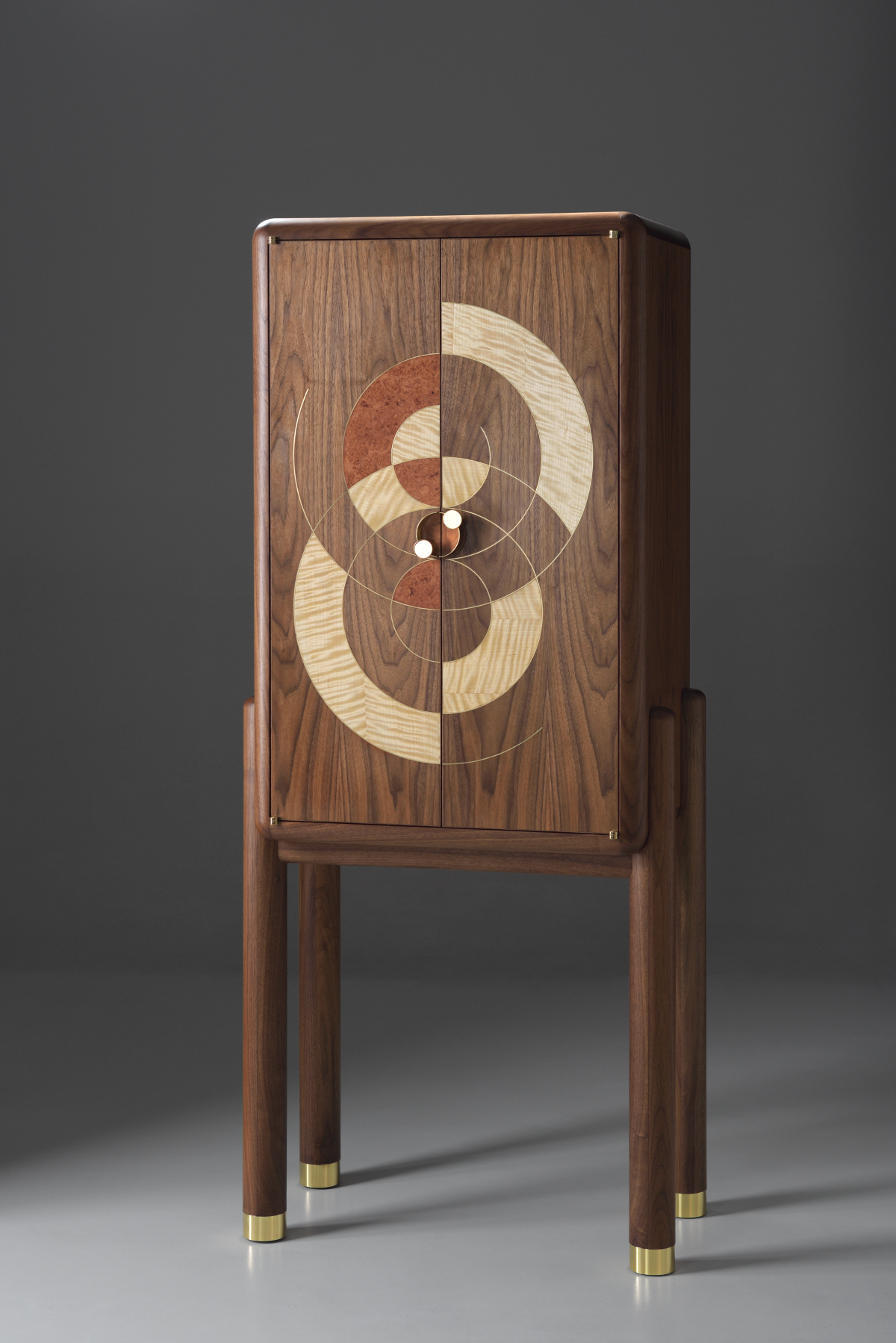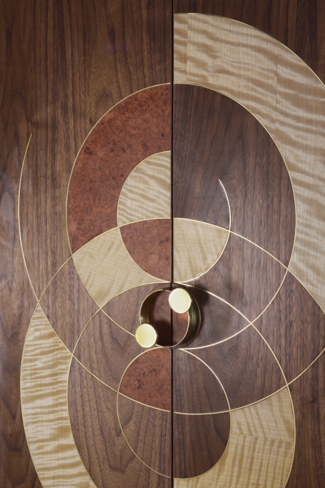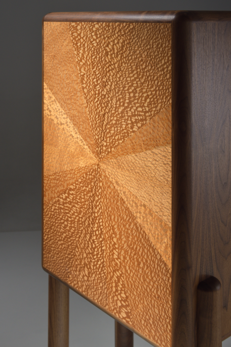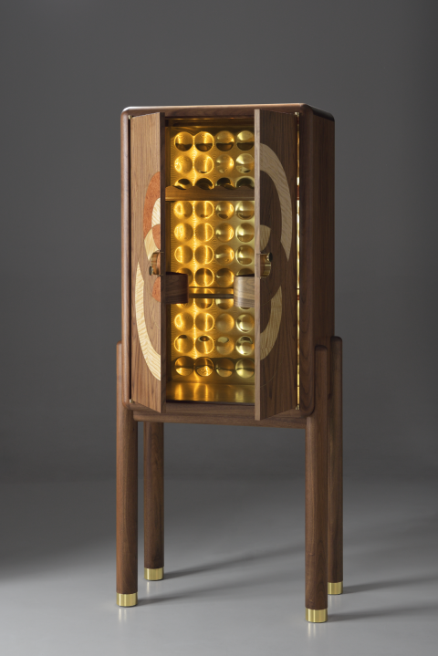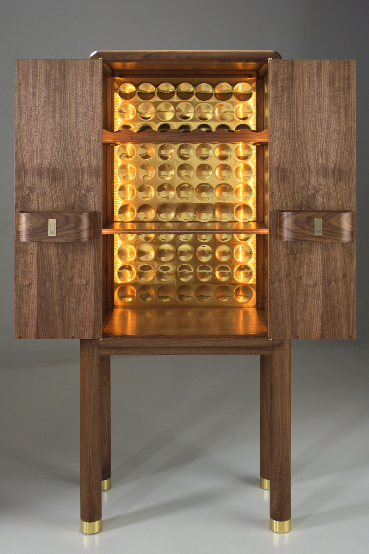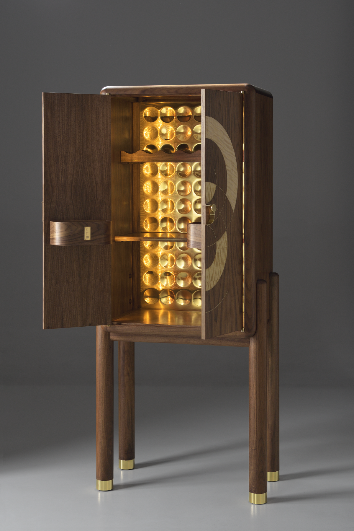 Expertly crafted from a combination of solid American walnut and premium veneer, showcasing the natural beauty and enduring integrity of the materials and timeless design. Every element, from the brass interior cabinet back to the door hinges, knobs, and brass leg fittings, has been entirely handcrafted. The doors feature a pattern inspired by a sand drawing, realised through the delicate techniques of marquetry and brass inlay. The back of the piece is made from lacewood, chosen for its unique ability to produce a dynamic, changing reflection depending on the angle from which it is viewed. Equipped with an auto on/off amber lighting system, this cabinet ensures that your finest spirits are displayed in a warm, inviting glow, enhancing the overall ambiance of any room.