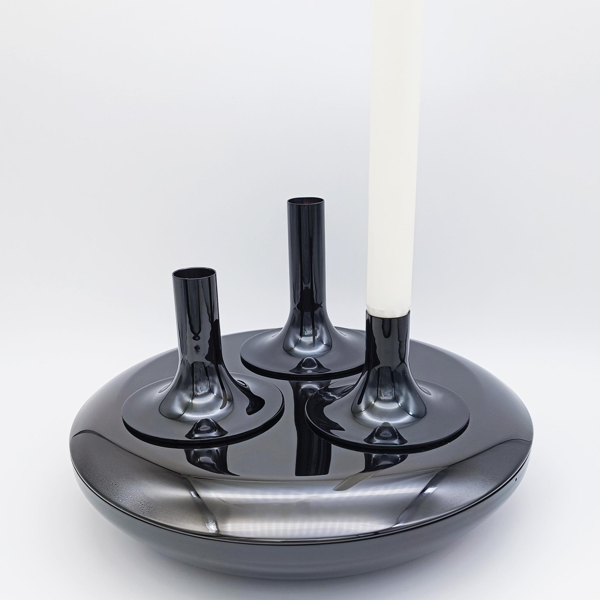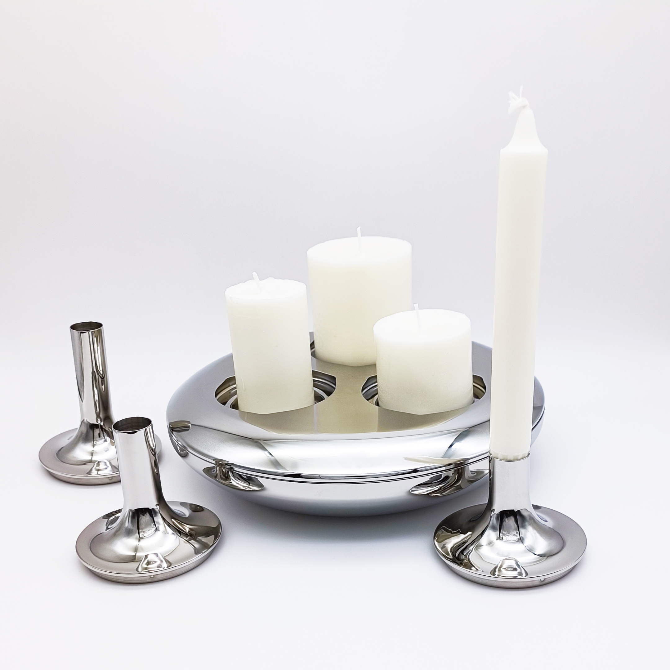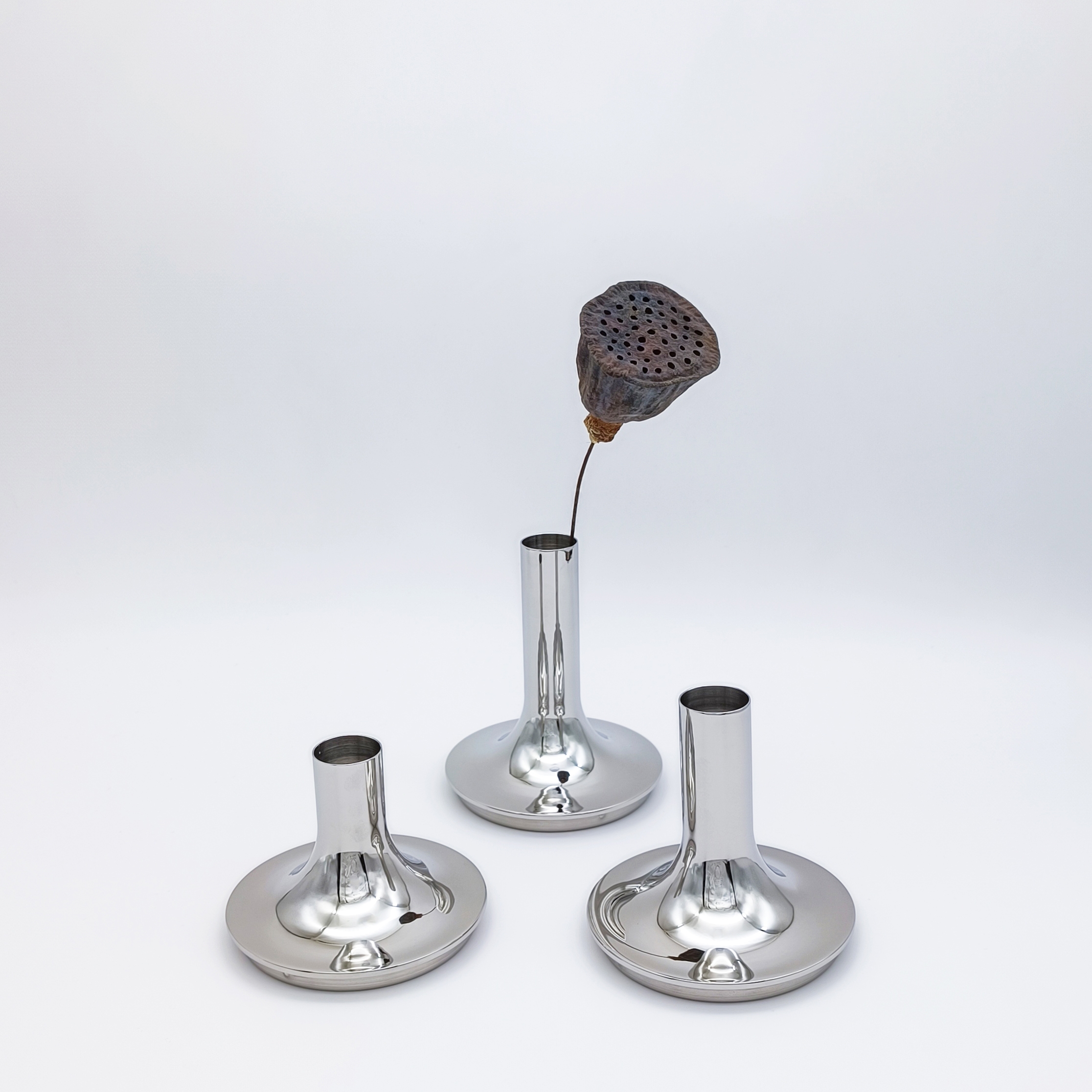 UTOSPACE is a functional set of stainless steel vase or candle holder made of SUS316 (SS 18/10). It can be used as vase or holder for candle pillars or sticks. There are 3 candlestick holders which can be removable and used individually. The base can also act as tray for separately used. This set can be used as tableware and home decors that are designed to be both aesthetically unique and highly functional.