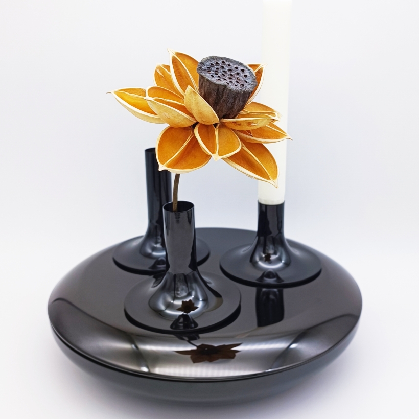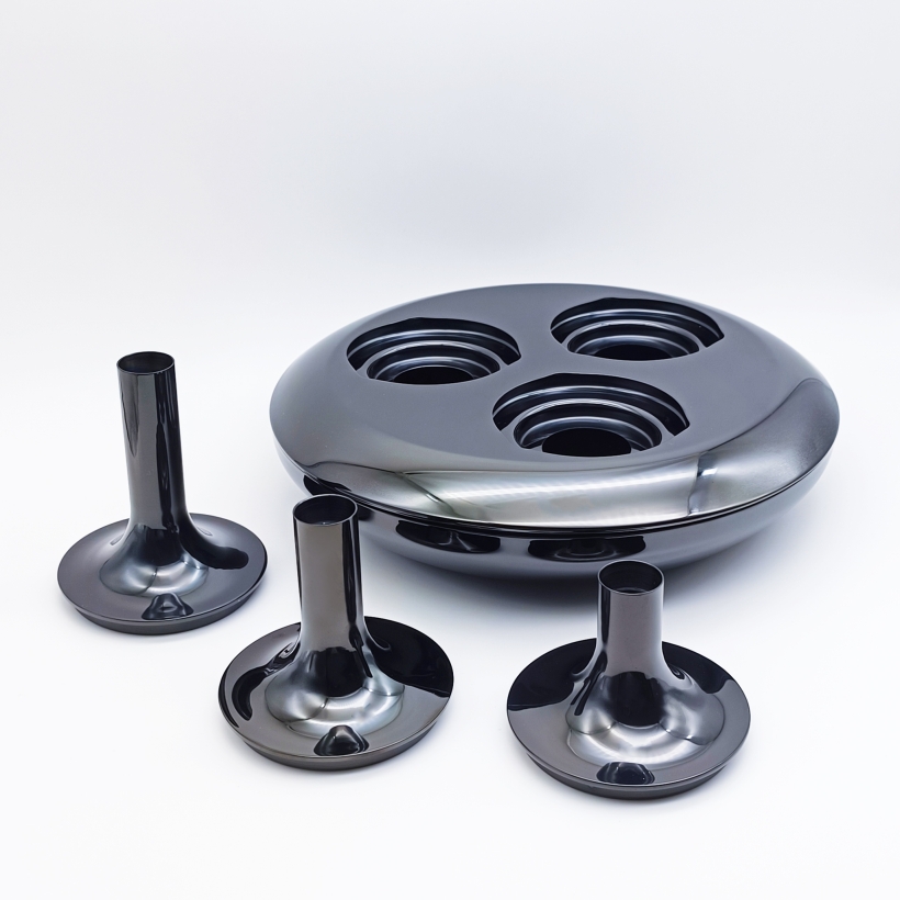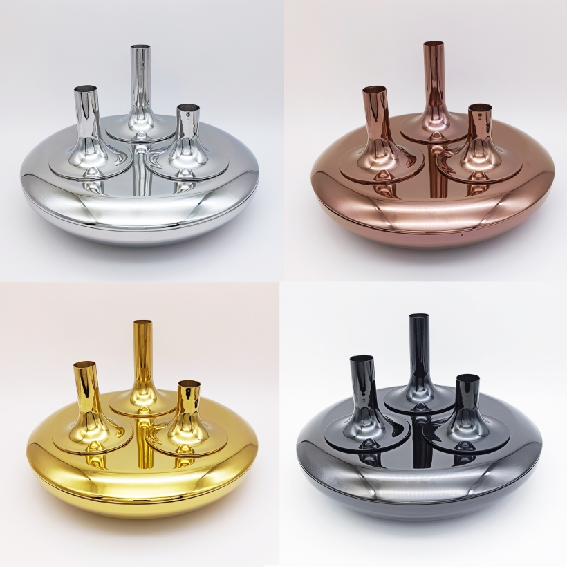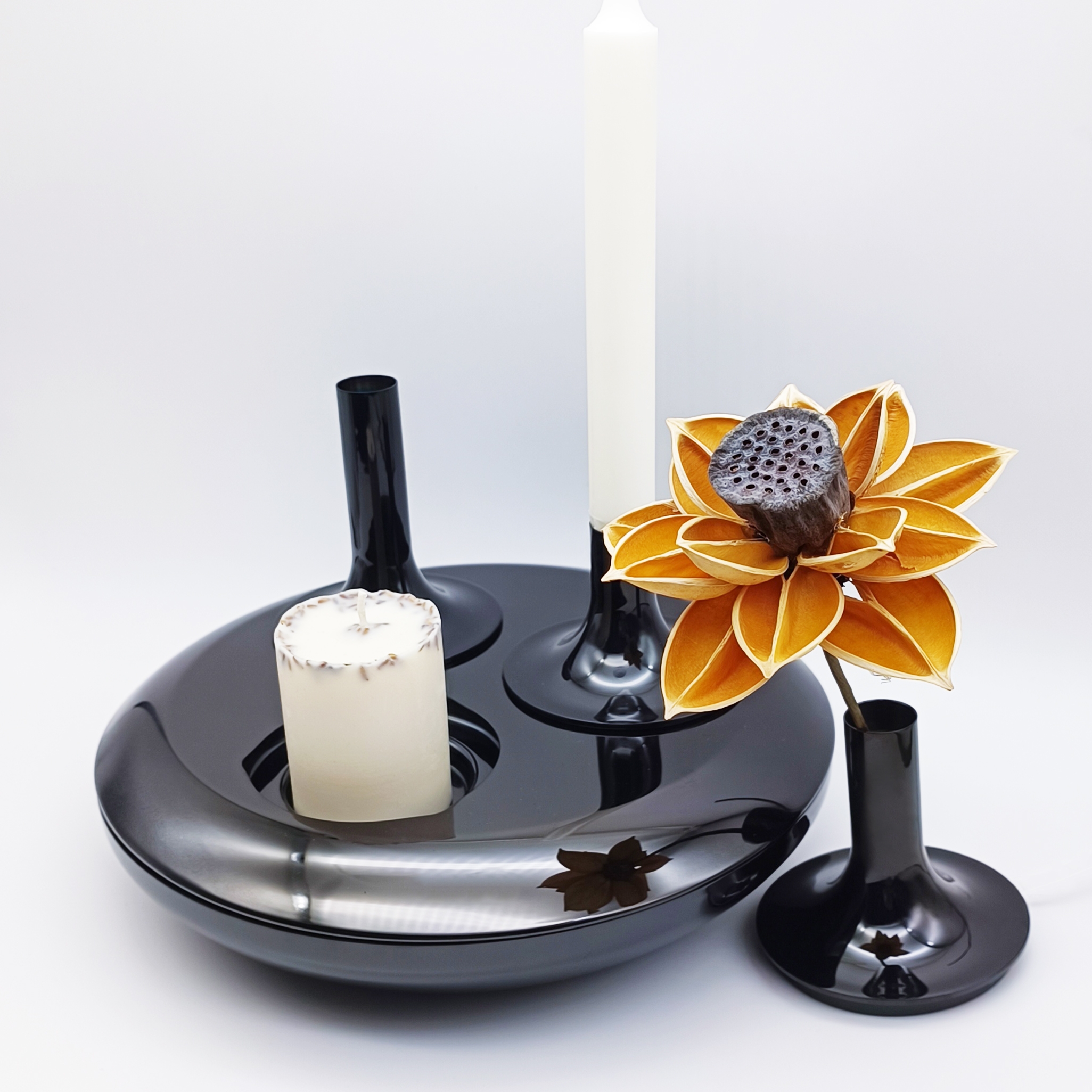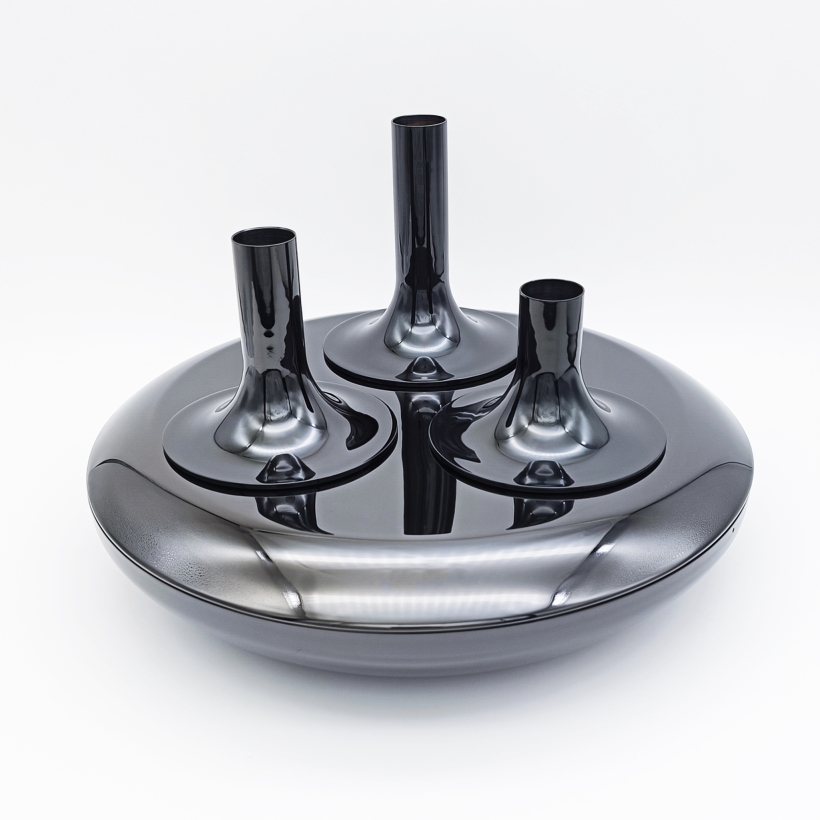 UTOSPACE is a functional set of stainless steel vase or candle holder made of SUS316 (SS 18/10). It can be used as vase or holder for candle pillars or sticks. There are 3 candlestick holders which can be removable and used individually. The base can also act as tray for separately used. This set can be used as tableware and home decors that are designed to be both aesthetically unique and highly functional.