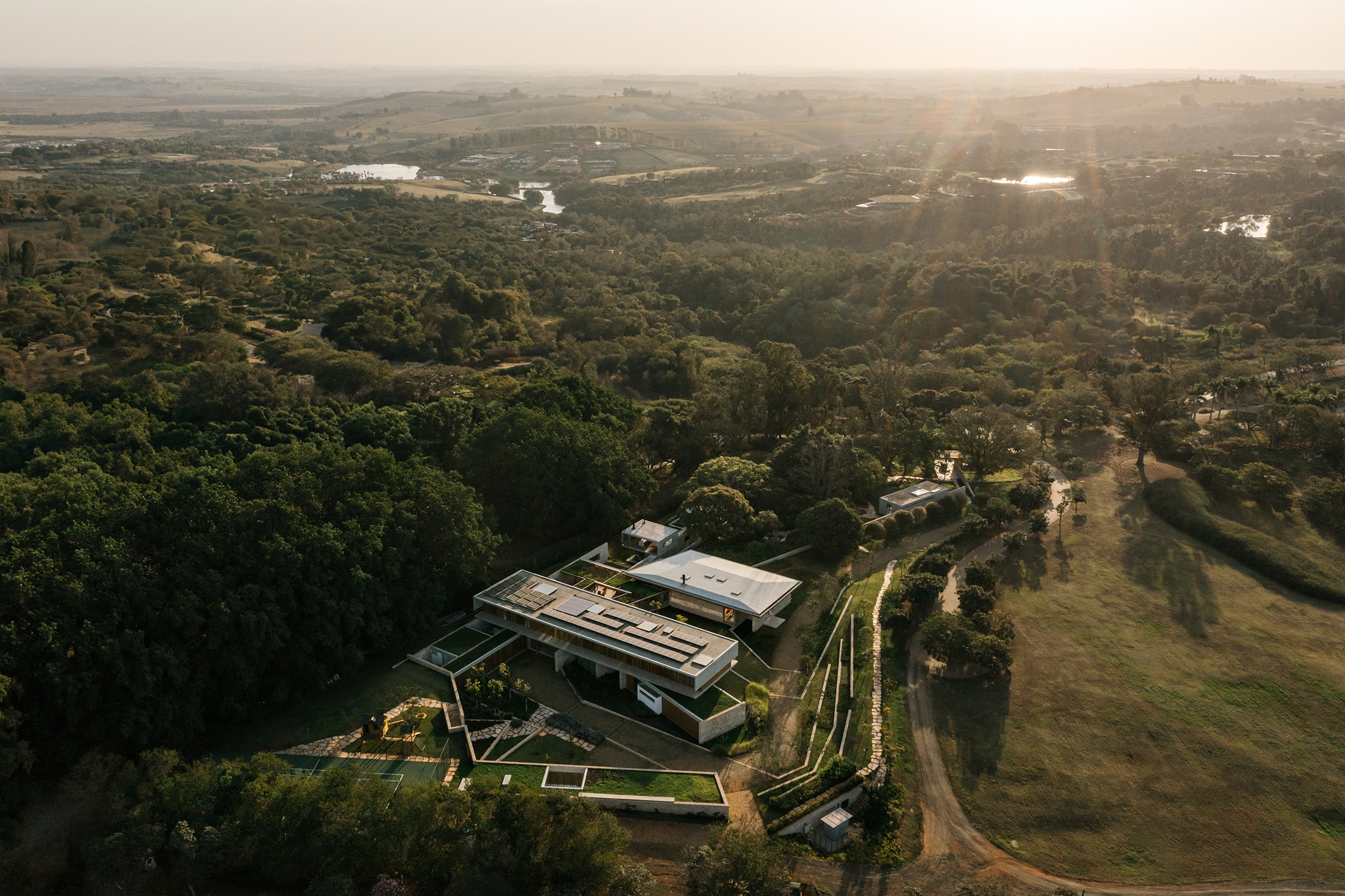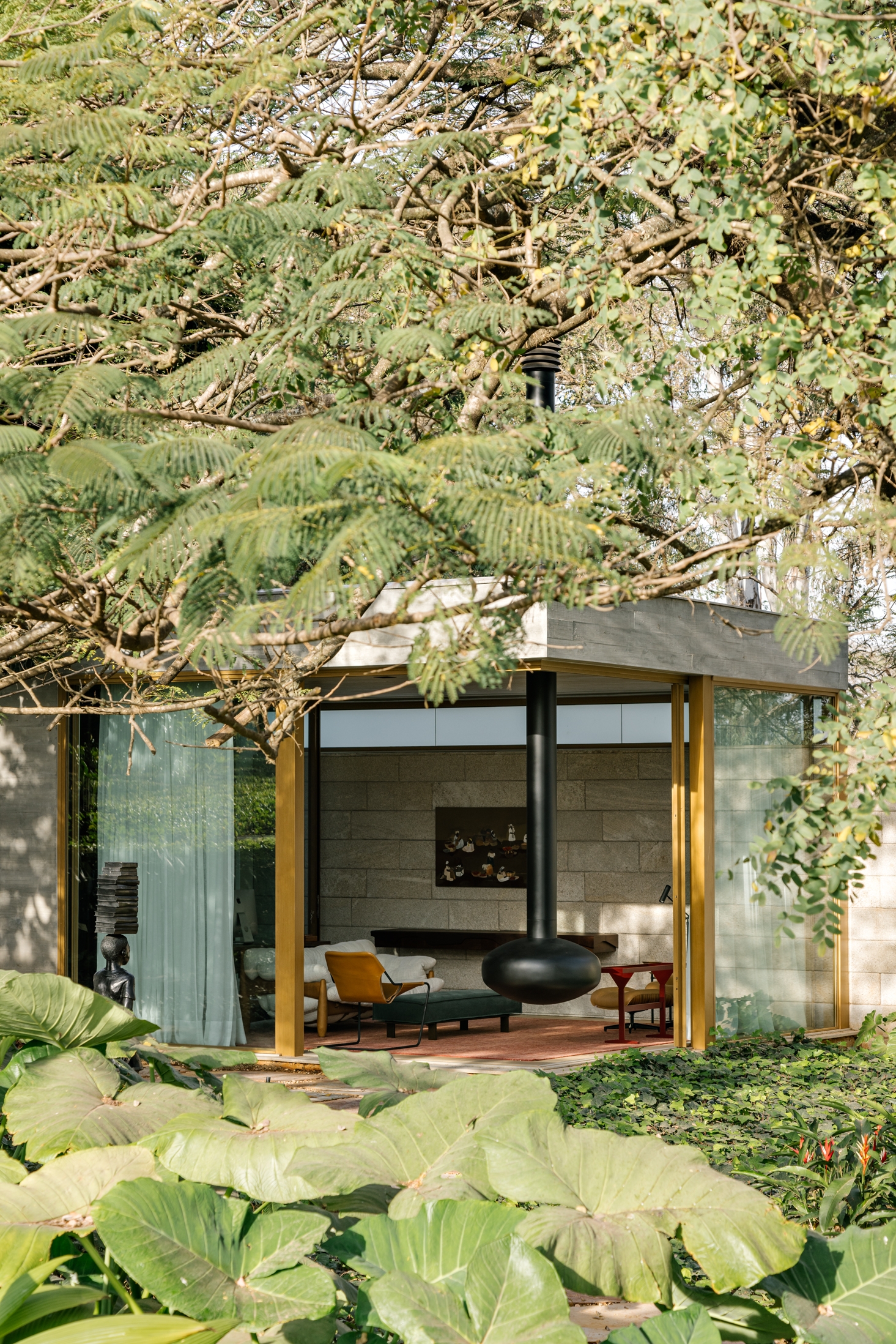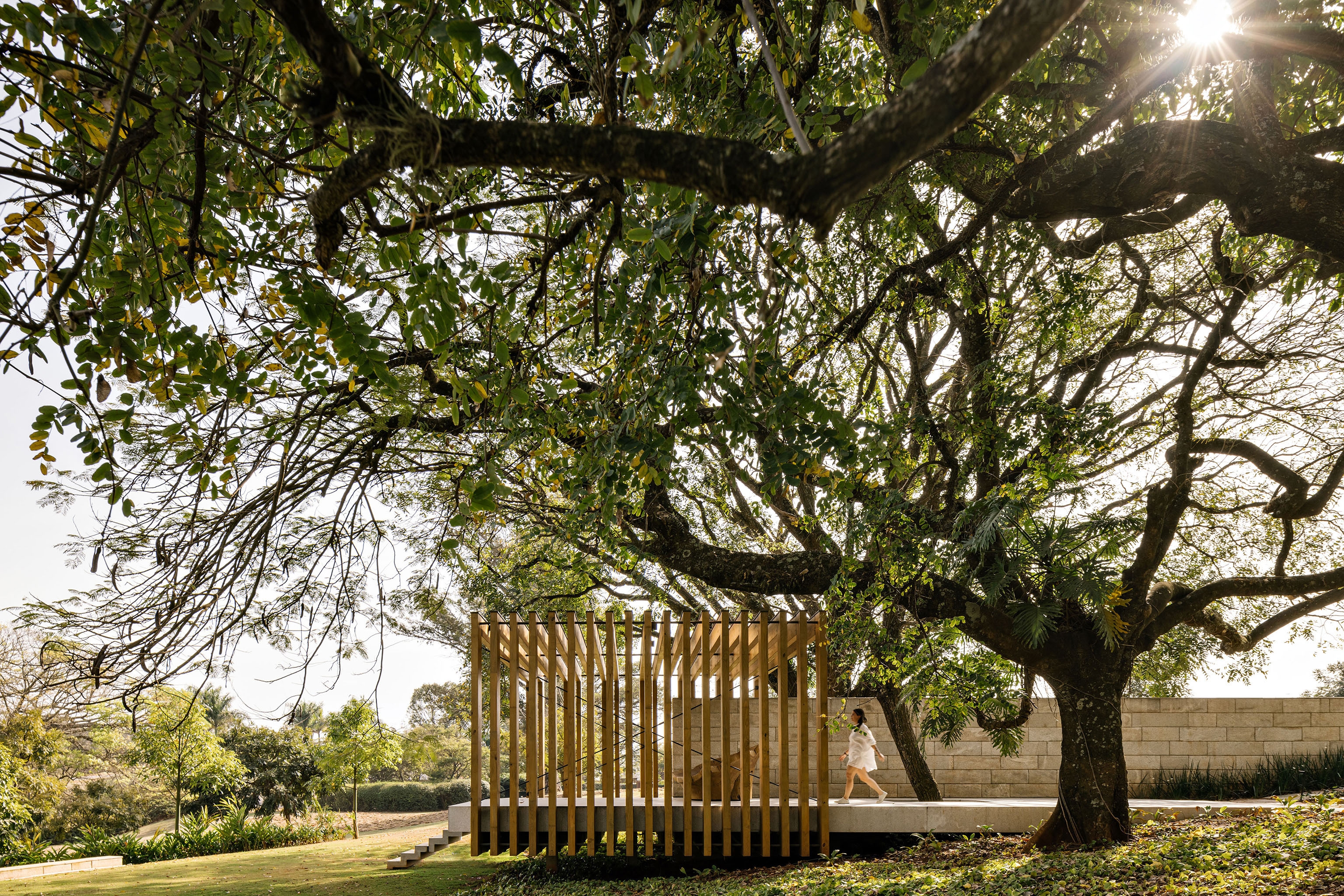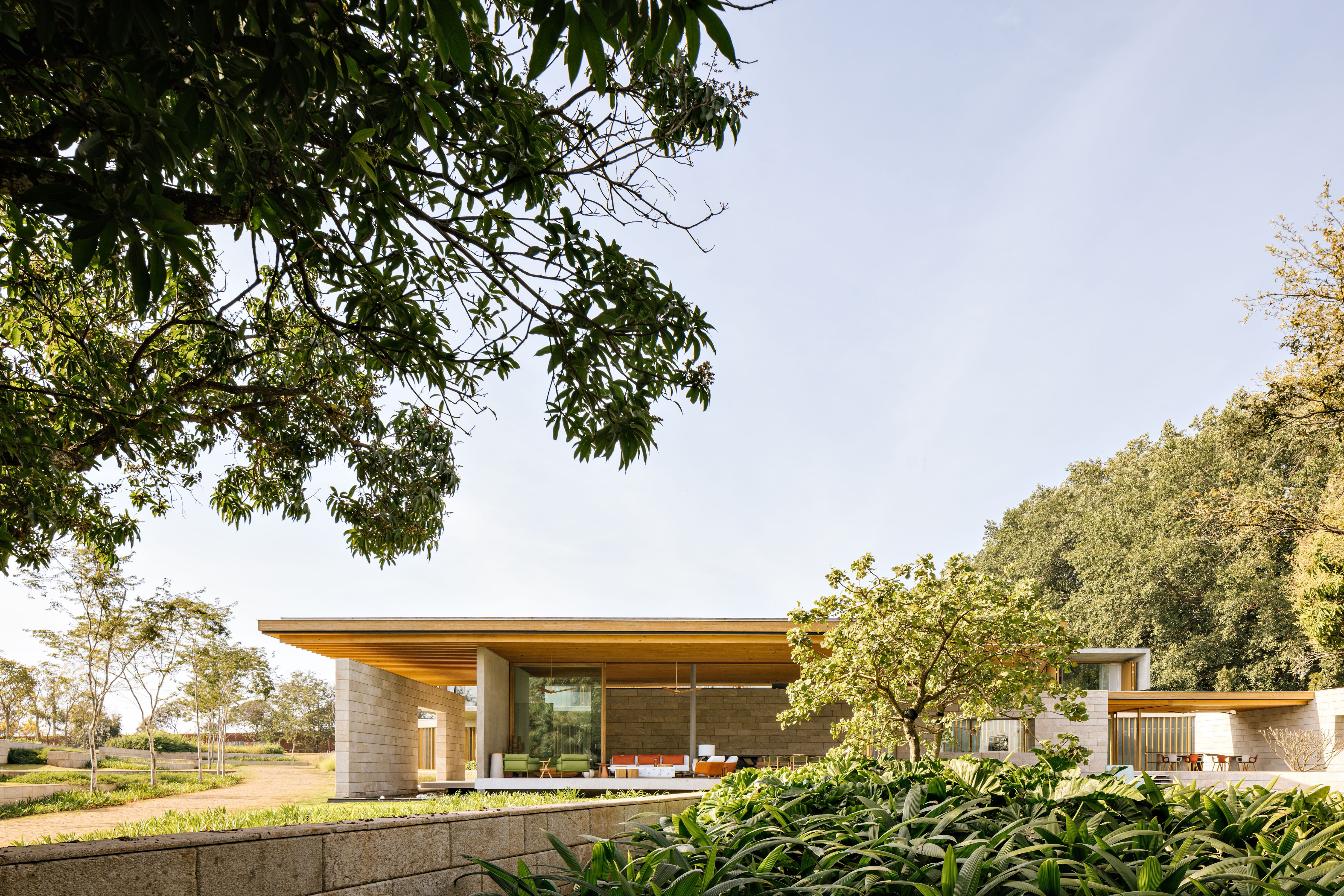Adult and sculptural trees fill the central portion of this 14,000 m² plot in the countryside of São Paulo, Brazil. The slope takes on important proportions across the entire site. The trees and the unevenness form the basis of the occupation strategy. With an extensive program, the house spreads over the space, embracing the vegetation and creating diverse paths and landscapes. Straight lines run through the terrain, defining a central park. The slope adds volume to these lines, transforming them into stone gables that reveal the topography and support pavilions. As these gables enter the main body of the house, they provide continuity to the landscape design and help organize the spaces, along with exposed concrete planes. Wood, introduced as a major covering material, joins the stone and concrete, reinforcing gaps for passage or views. Besides the small pavilions on the ground, a large pavilion perches above the main block, defining the upper floor with rooms, creating an expressive overhang in the courtyard. The continuity between internal and external spaces emphasizes patios of various sizes, where large sculptures showcase the client’s appreciation for Brazilian art.