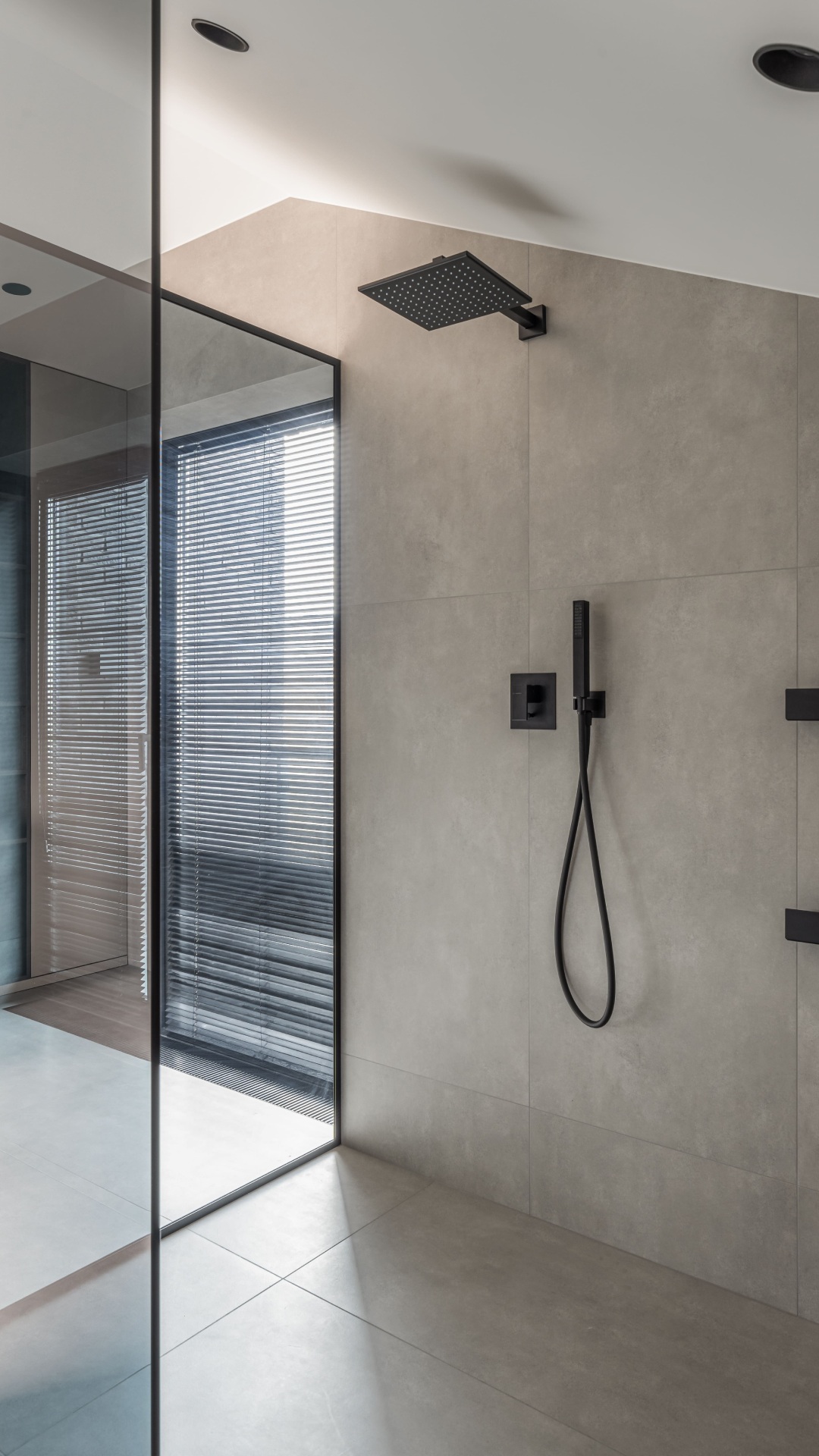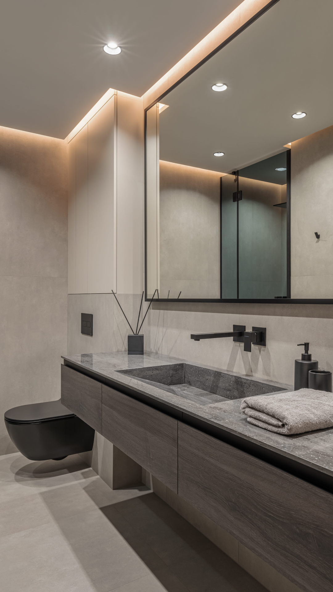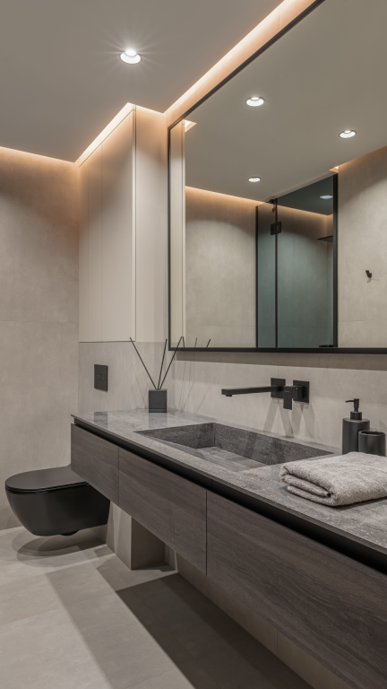 The main color scheme is a rather complex combination of gray and beige shades. Accents in some places are a dark floor or black sanitary ware. There are no bright colors, which enhances the feeling of peace.