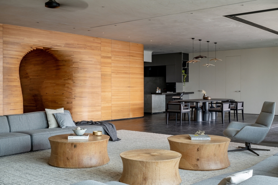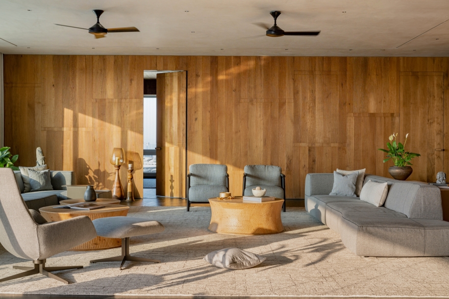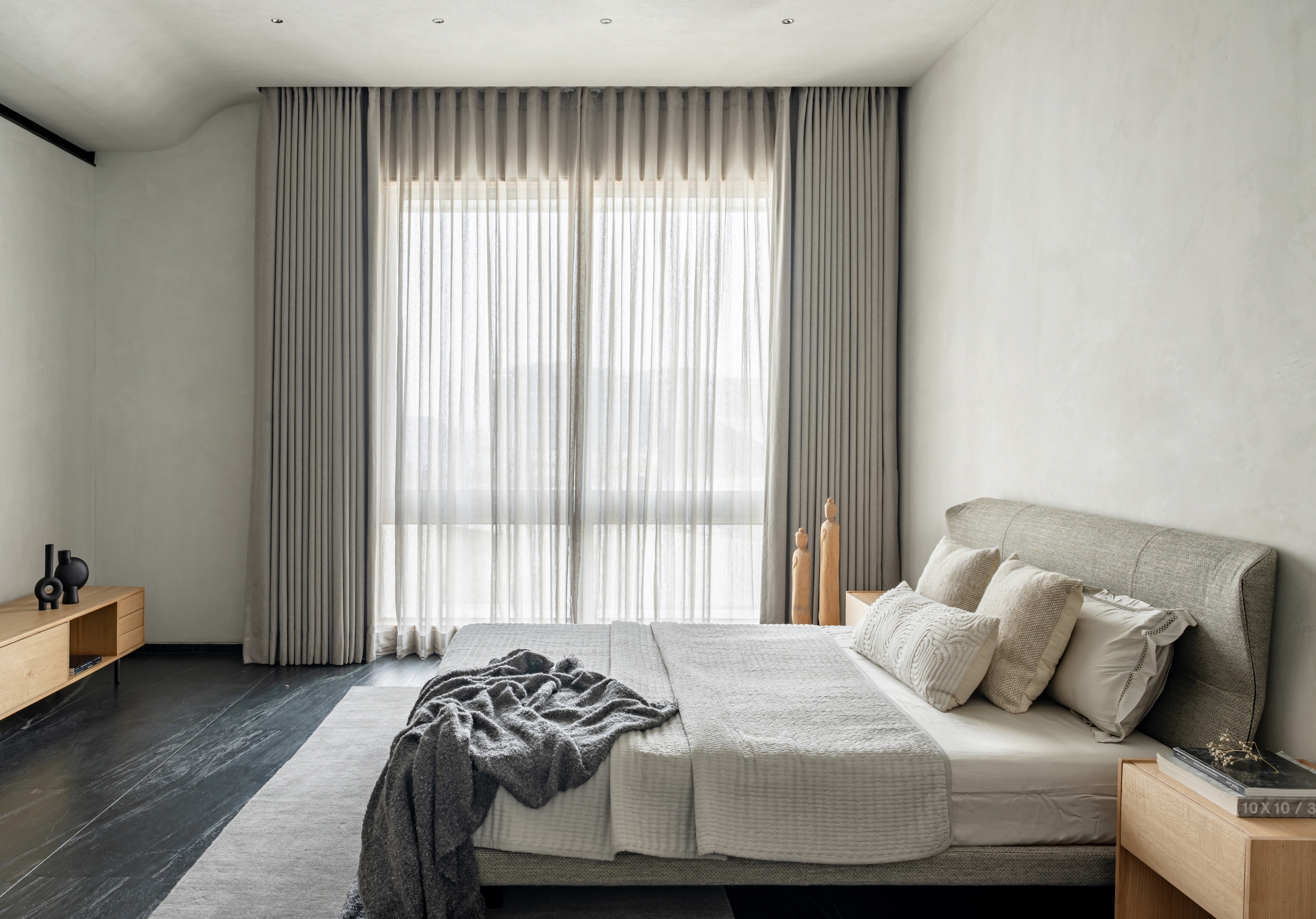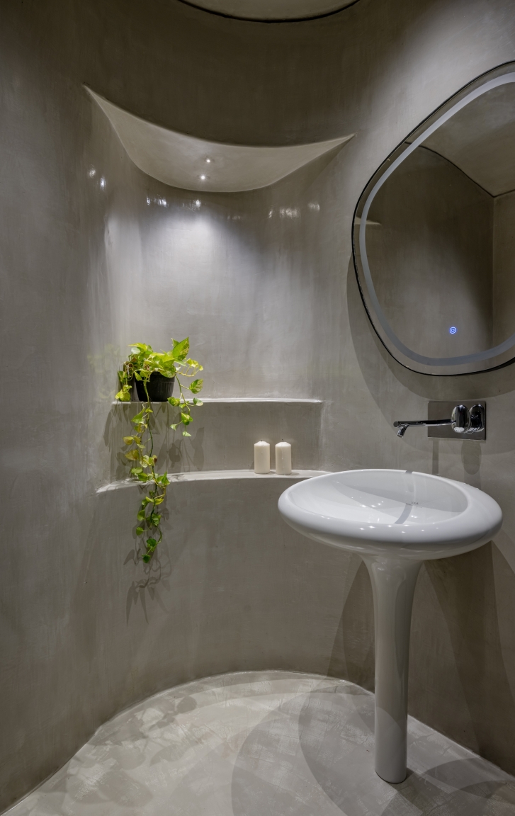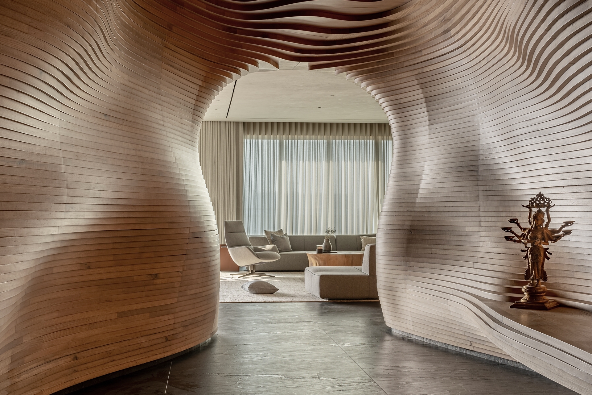 To enhance the meditative feel, we used a limited palette of black stone from Rajasthan, white oak wood, and grey lime plaster, with natural limestone in the bathrooms. Door jambs were camouflaged with walls to reduce visual clutter, and standard AC grills were replaced with custom grooves. Furniture featured extensive wood textures, complemented by stone sculptures. The cave-like entry foyer, the project's centerpiece, required special details, software, and skilled carpenters for precise execution.