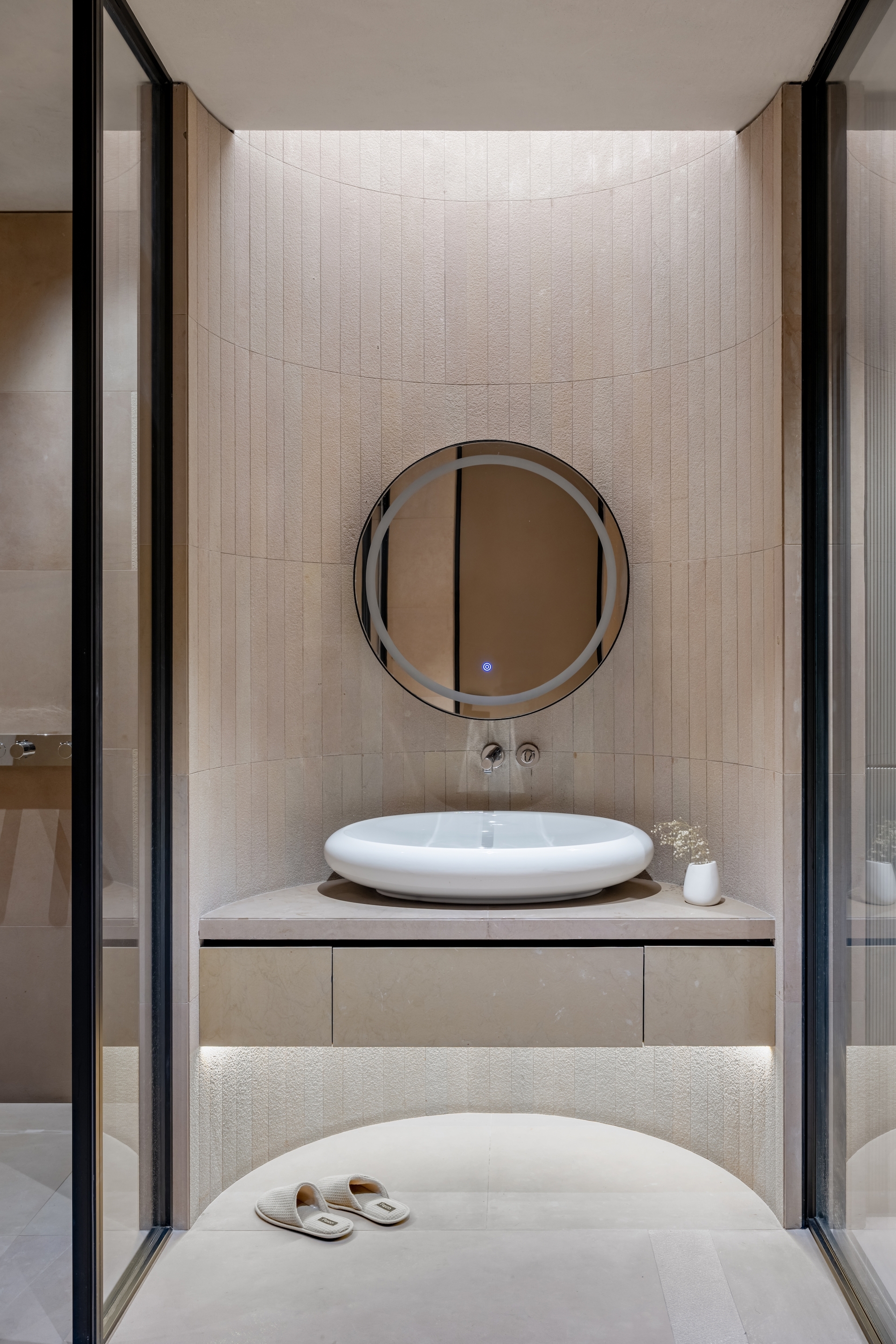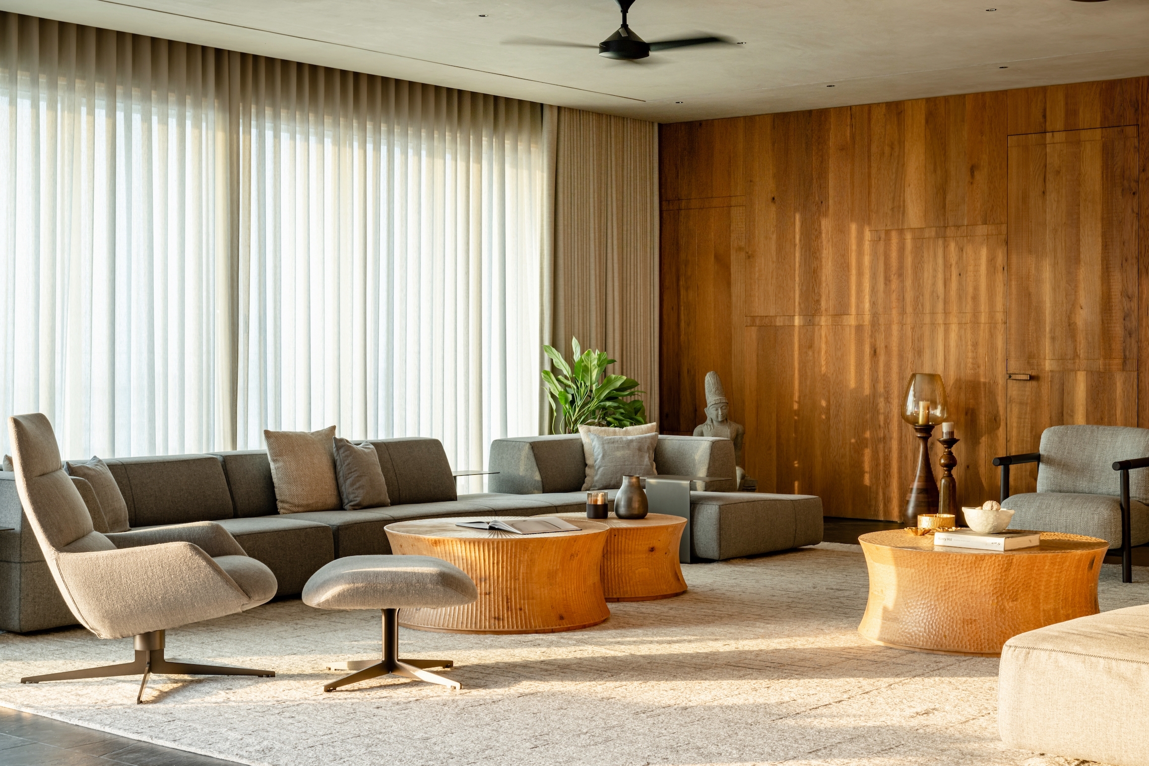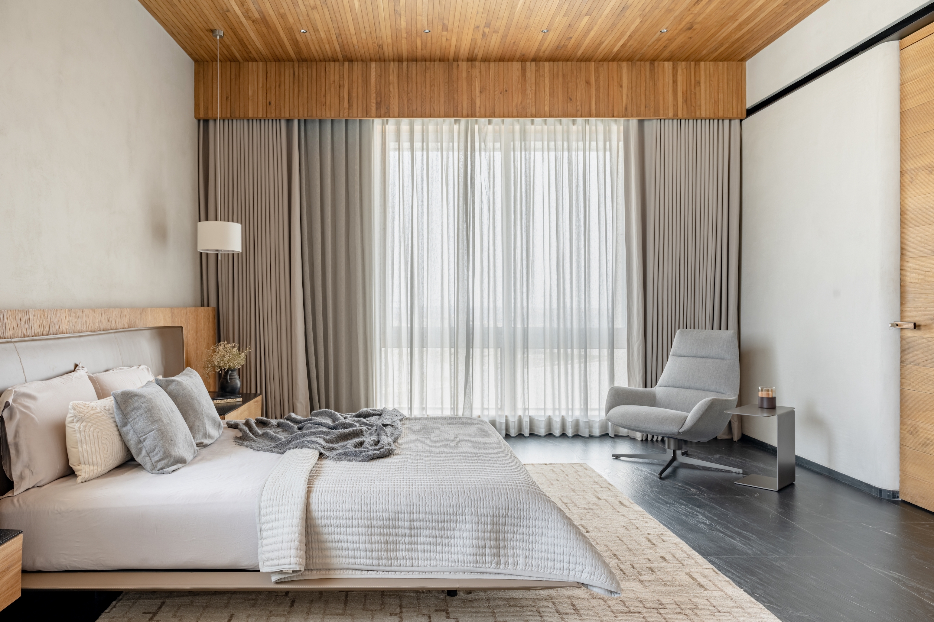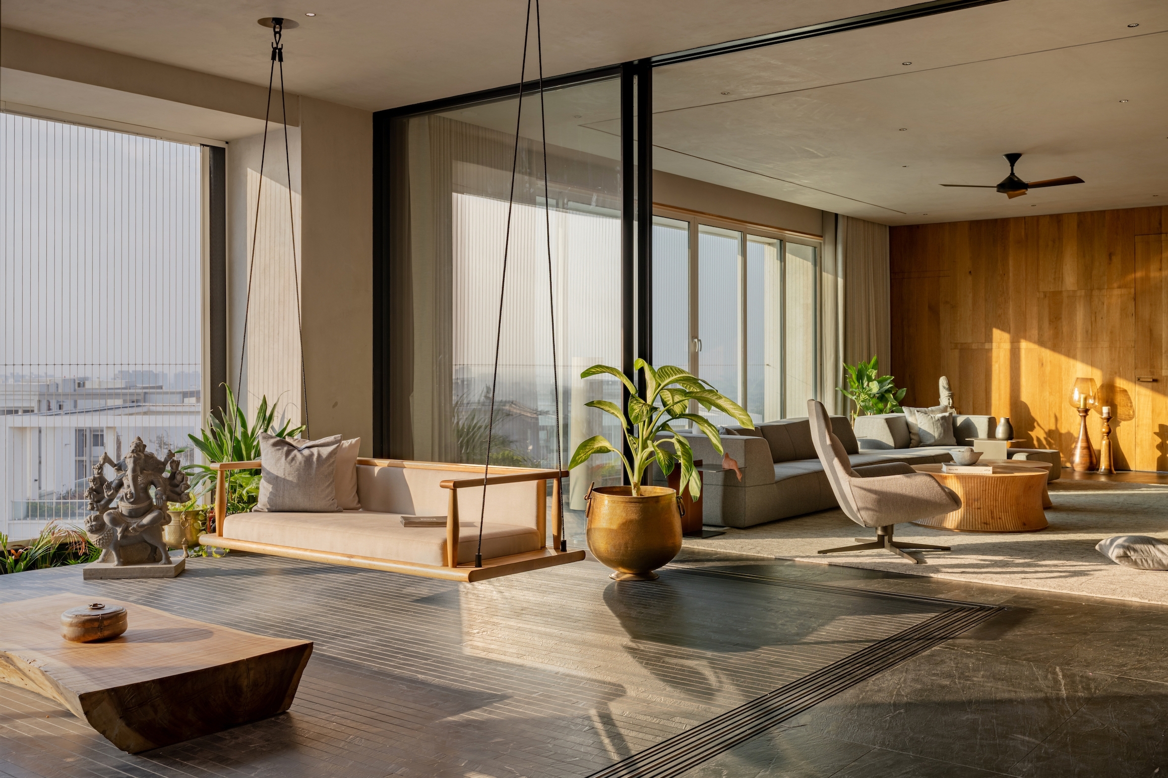 To enhance the meditative feel, we used a limited palette of black stone from Rajasthan, white oak wood, and grey lime plaster, with natural limestone in the bathrooms. Door jambs were camouflaged with walls to reduce visual clutter, and standard AC grills were replaced with custom grooves. Furniture featured extensive wood textures, complemented by stone sculptures. The cave-like entry foyer, the project's centerpiece, required special details, software, and skilled carpenters for precise execution.