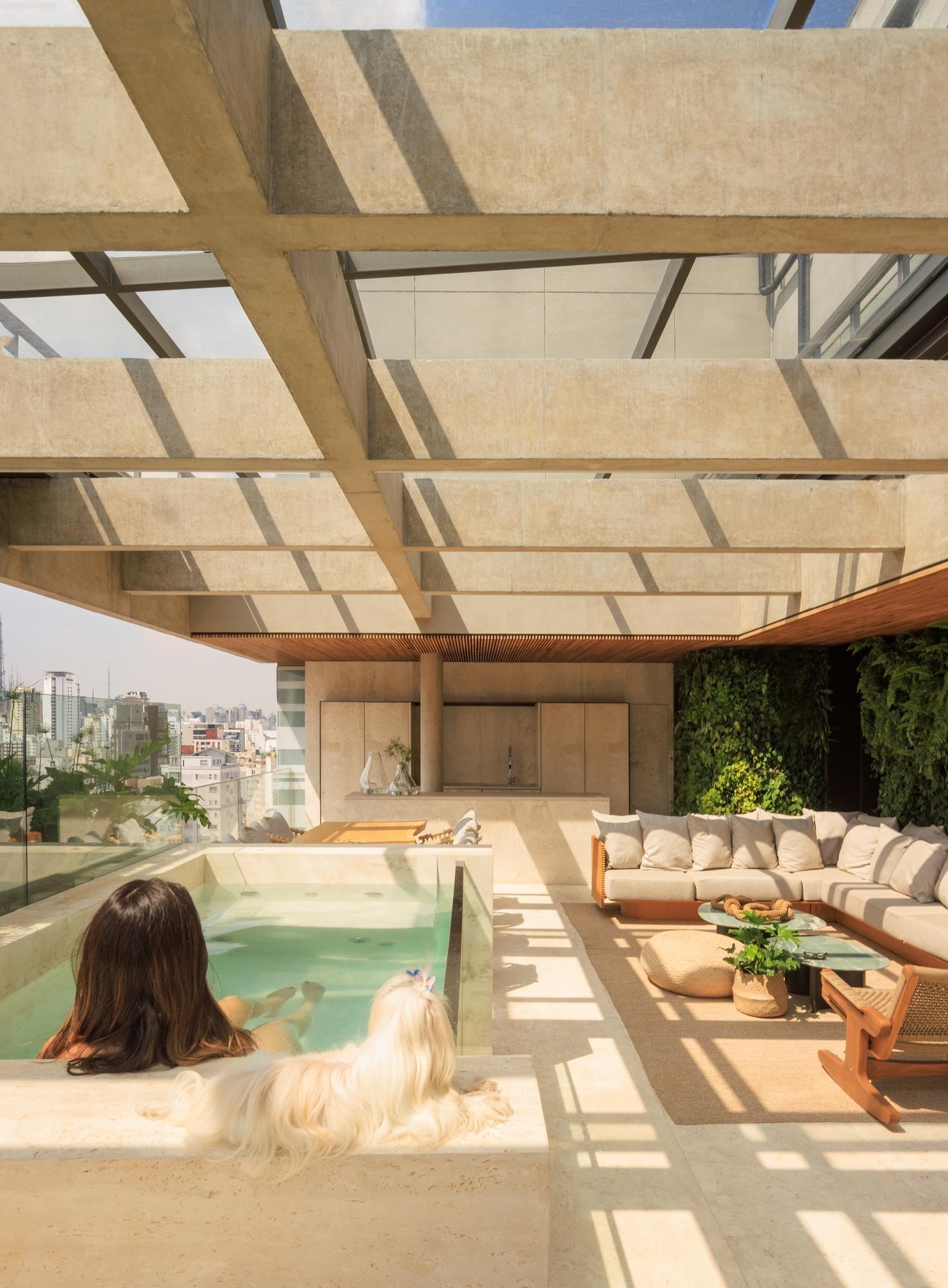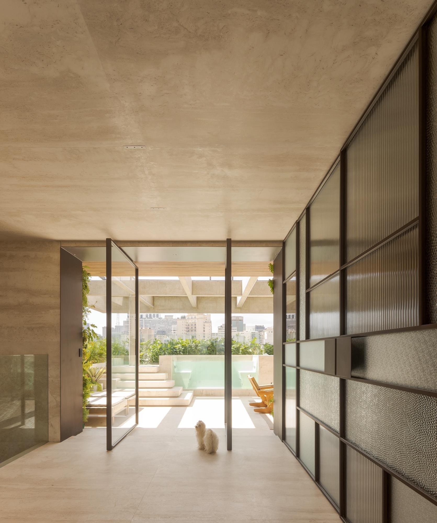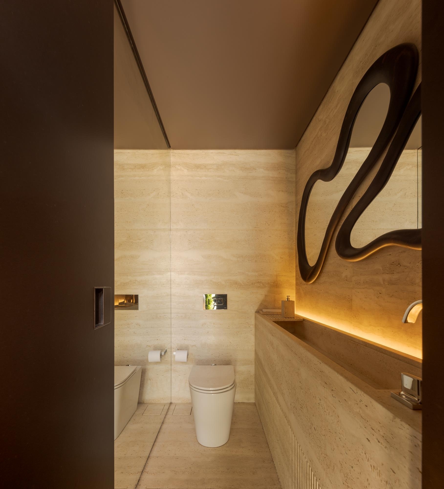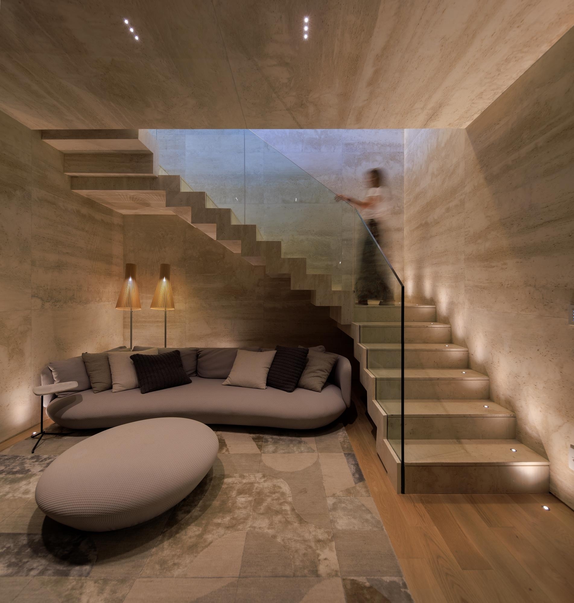 The strategic use of both natural and artificial lighting enhances the materials, such as the travertine Navona marble, which covers the floor and ceiling of the living room, creating a sophisticated yet welcoming atmosphere. Neutral tones dominate the furniture, reinforcing the minimalist concept. "The marble is the material that synthesizes the project, offering both sophistication and a sense of warmth," says Fernanda Marques, the architect behind this space that balances design and functionality.