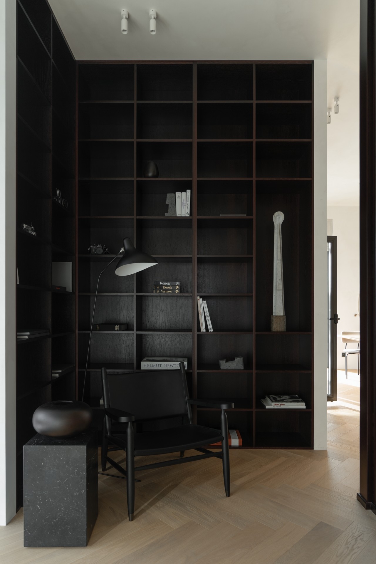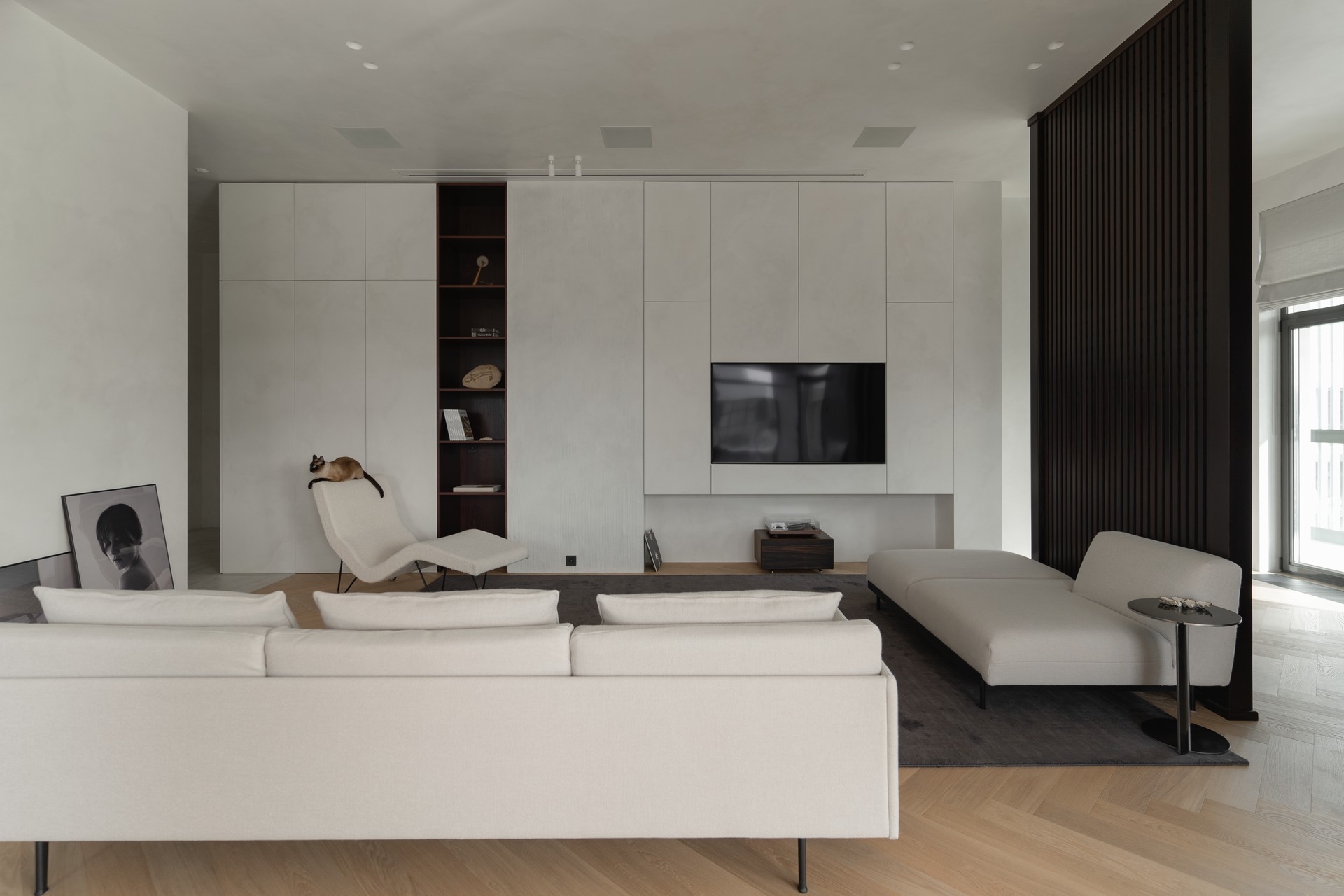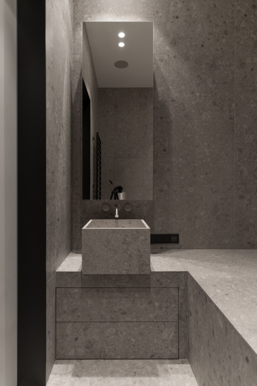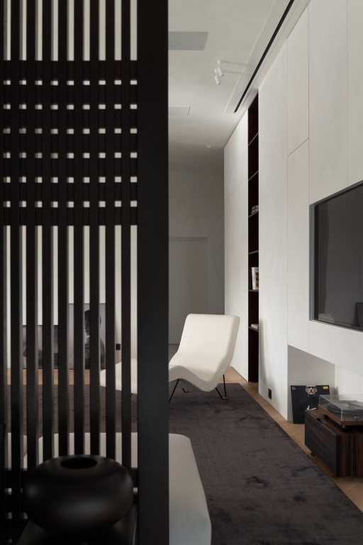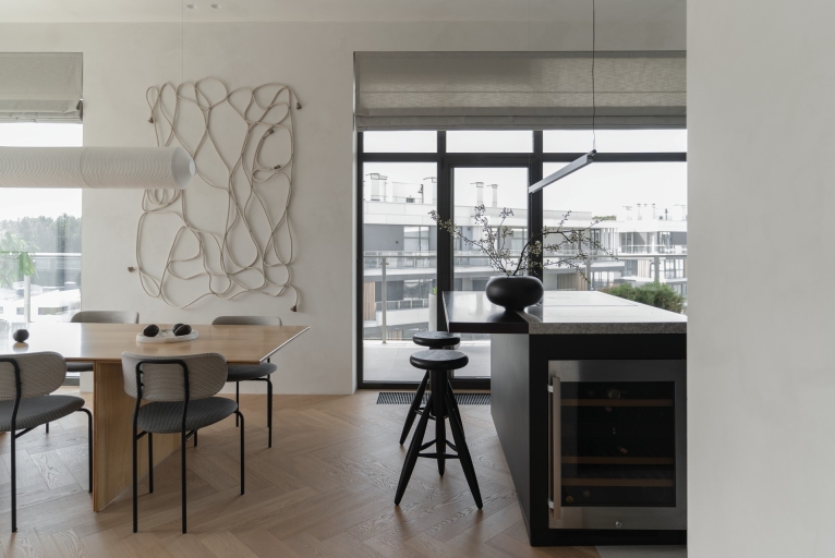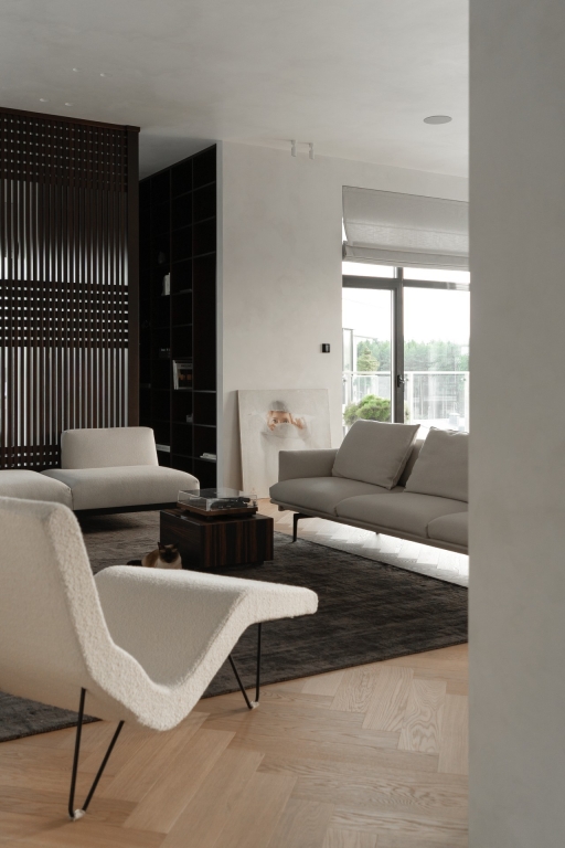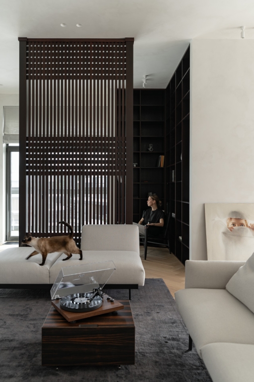 The project began with a spacious light-filled room, where air and volume became the guiding vectors that were to be retained. The main priorities of the owners were comfort, safety and coziness, so that the house would create an atmosphere of love. The main idea of zoning is to create smooth transitions between the rooms while maintaining a sense of lightness. A distinctive feature of the interior is the quiet sitting area with a library, which is also a transit between the common and private areas, while a geometric translucent partition sets an easy rhythm to the space. Every point of the space opens up beautiful visual axes, whether it be views from the window or accents on pieces of furniture-art. The choice of fair materials and a warm palette of natural hues emphasized the shapes and textures of the furniture and balanced the interior. Dark accents were used as a contrast: red-brown wood and graphite porcelain stoneware, which complement and enhance the sense of harmony in the space. The interior is not limited by the rigid framework of any single style, it strives for weightlessness, spatial freedom and expression of the owners' individuality.