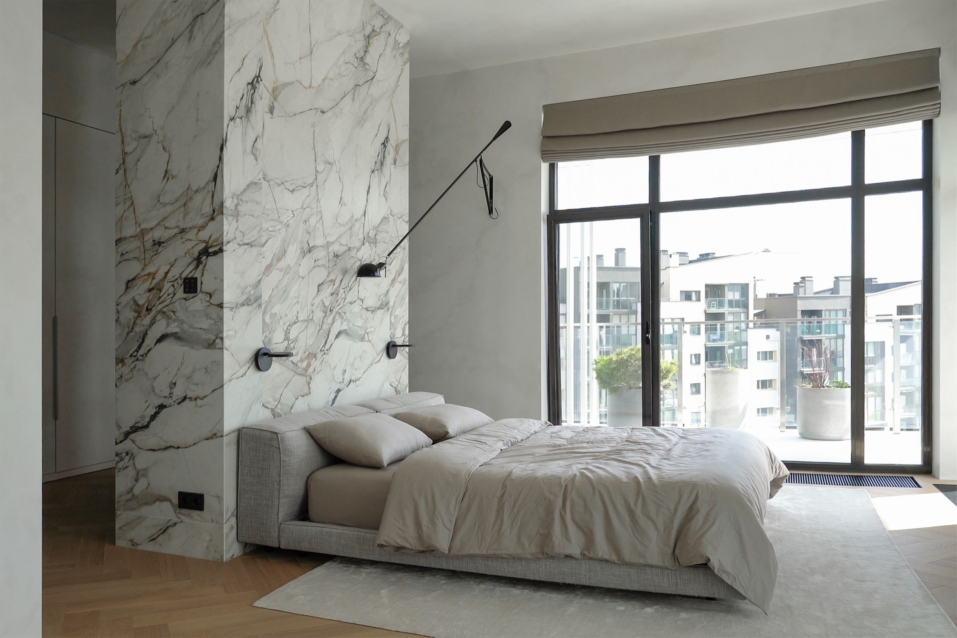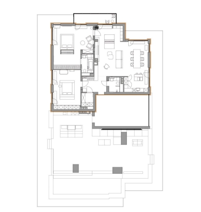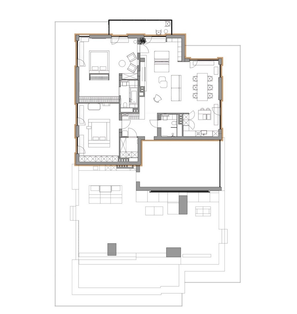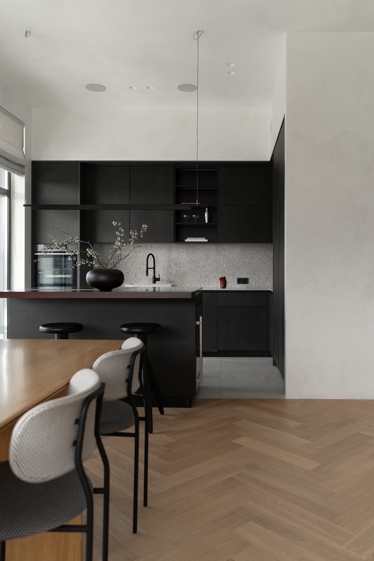 The project began with a spacious light-filled room, where air and volume became the guiding vectors that were to be retained. The main priorities of the owners were comfort, safety and coziness, so that the house would create an atmosphere of love. The main idea of zoning is to create smooth transitions between the rooms while maintaining a sense of lightness. A distinctive feature of the interior is the quiet sitting area with a library, which is also a transit between the common and private areas, while a geometric translucent partition sets an easy rhythm to the space. Every point of the space opens up beautiful visual axes, whether it be views from the window or accents on pieces of furniture-art. The choice of fair materials and a warm palette of natural hues emphasized the shapes and textures of the furniture and balanced the interior. Dark accents were used as a contrast: red-brown wood and graphite porcelain stoneware, which complement and enhance the sense of harmony in the space. The interior is not limited by the rigid framework of any single style, it strives for weightlessness, spatial freedom and expression of the owners' individuality.