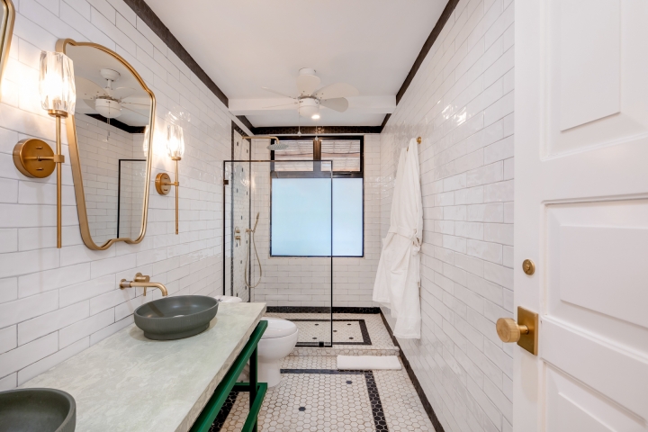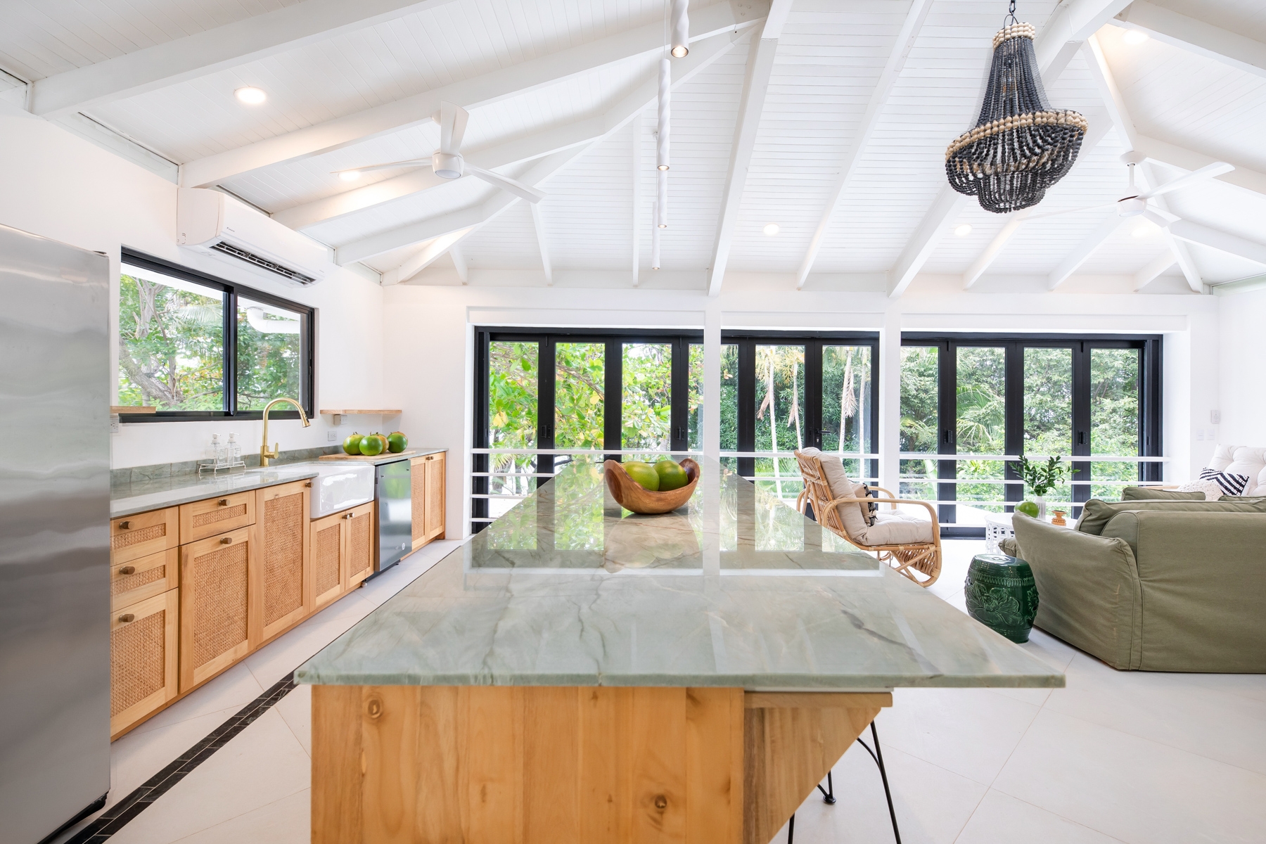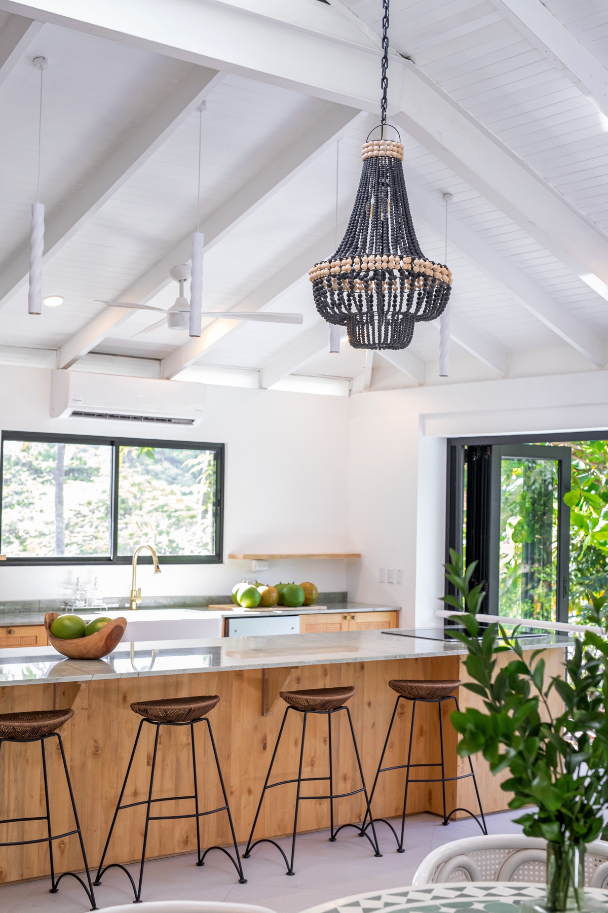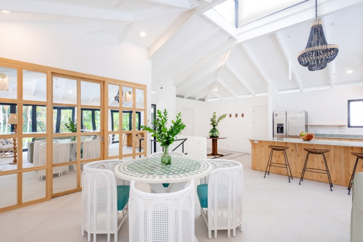 This 40 year-old beachfront home underwent a striking transformation, turning a once dark, enclosed space into a bright, open sanctuary. Previously disconnected from its stunning surroundings, the house now embraces the sea and jungle from nearly every angle—enhanced by a mirrored wall that not only amplifies the views but cleverly conceals the first-floor bathroom.