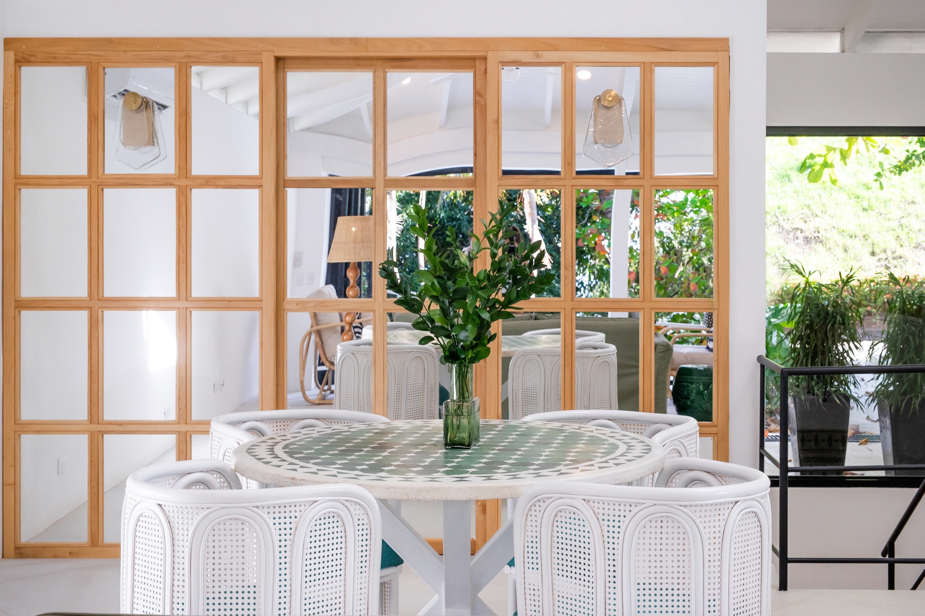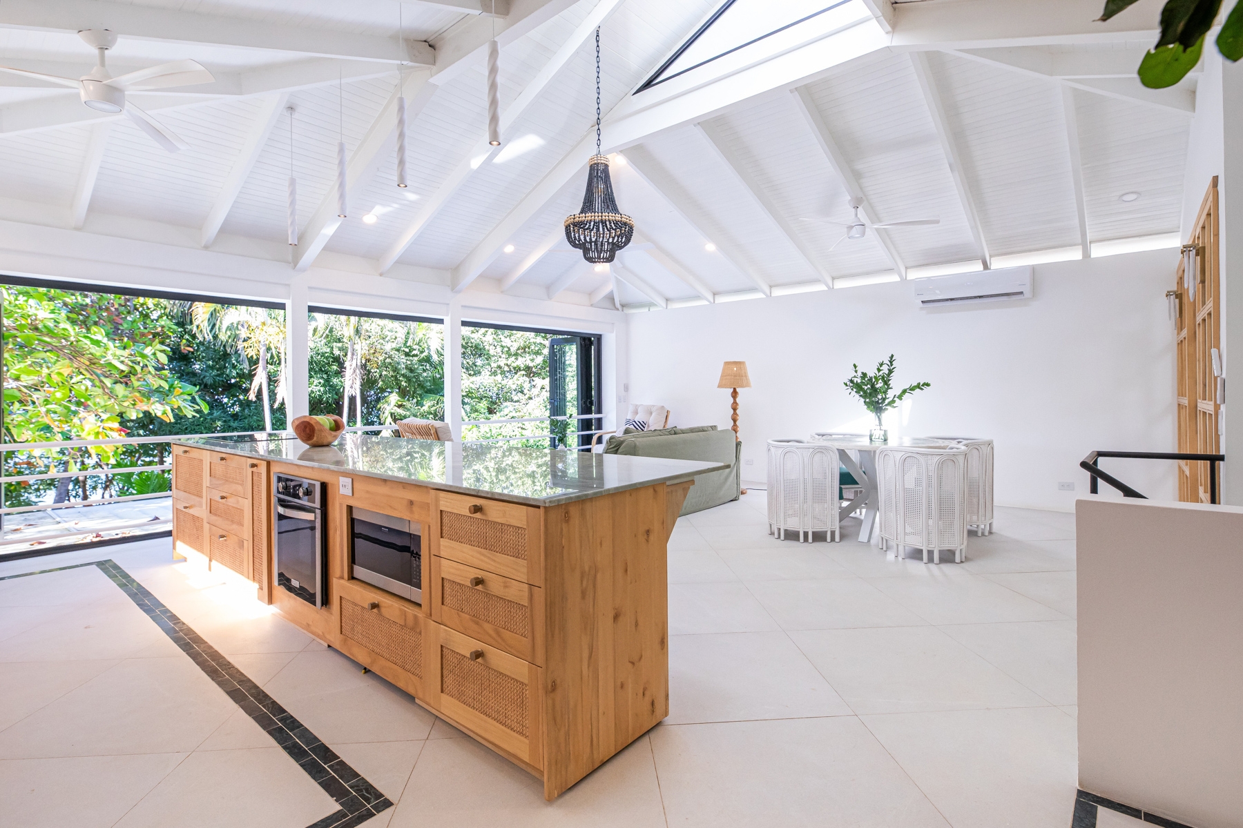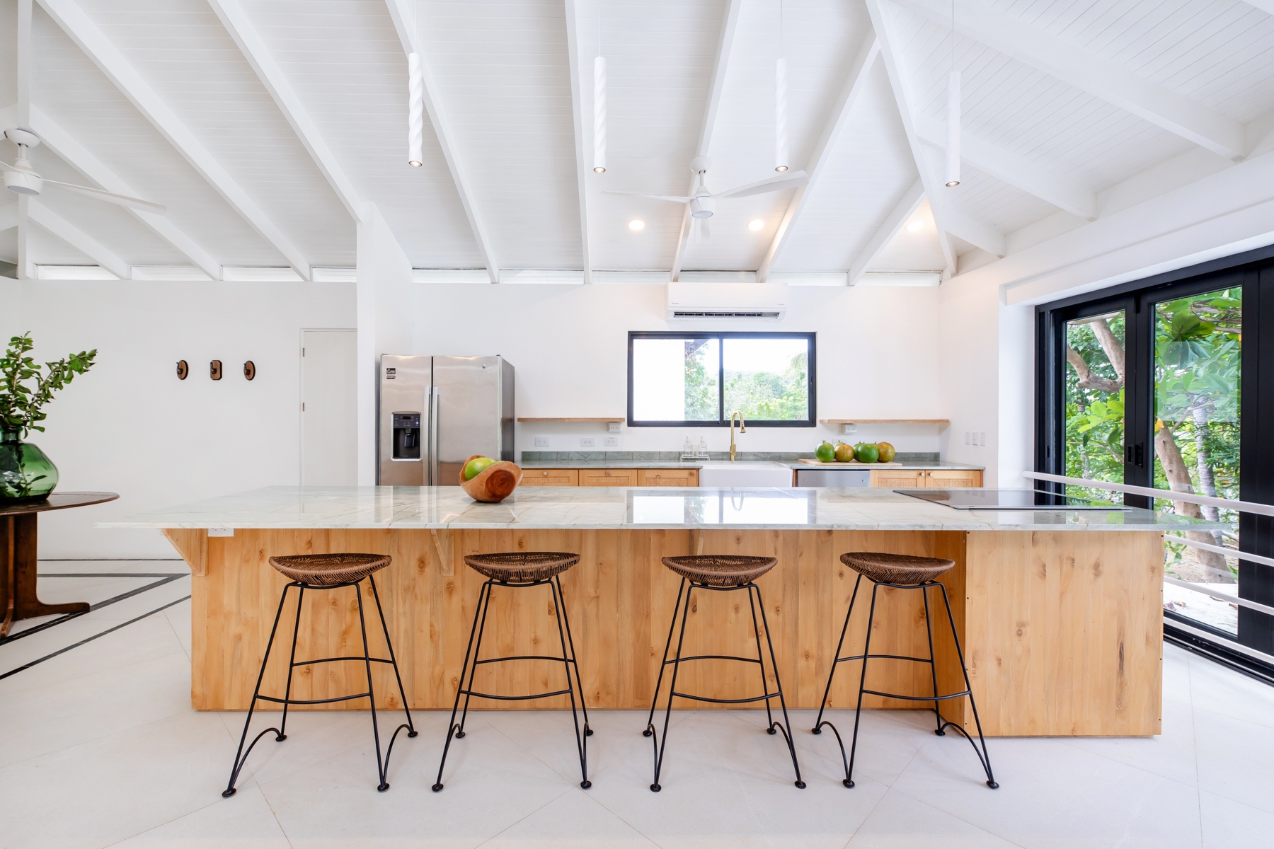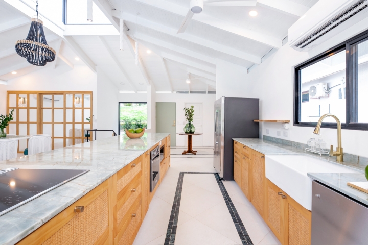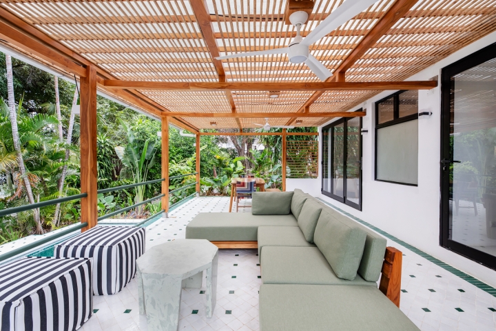 Light-toned local wood and rich green stone replace the once heavy interiors, creating a seamless connection to the lush landscape. A fusion of Moroccan influences, Costa Rican jungle aesthetics, and locally crafted materials infuses the space with character and authenticity (Approximately 70% of the furniture was locally sourced and handcrafted including kitchen, closets, consoles and seating).