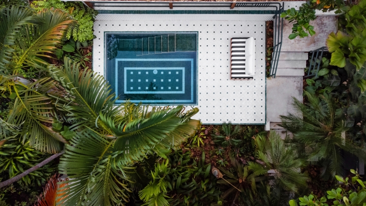 The custom-made exterior furniture purposefully contrasts with the floor's rich zellige patters. More than just a renovation, this project is a celebration of place, culture, and the perfect balance between architecture, interior design, furniture design and nature.