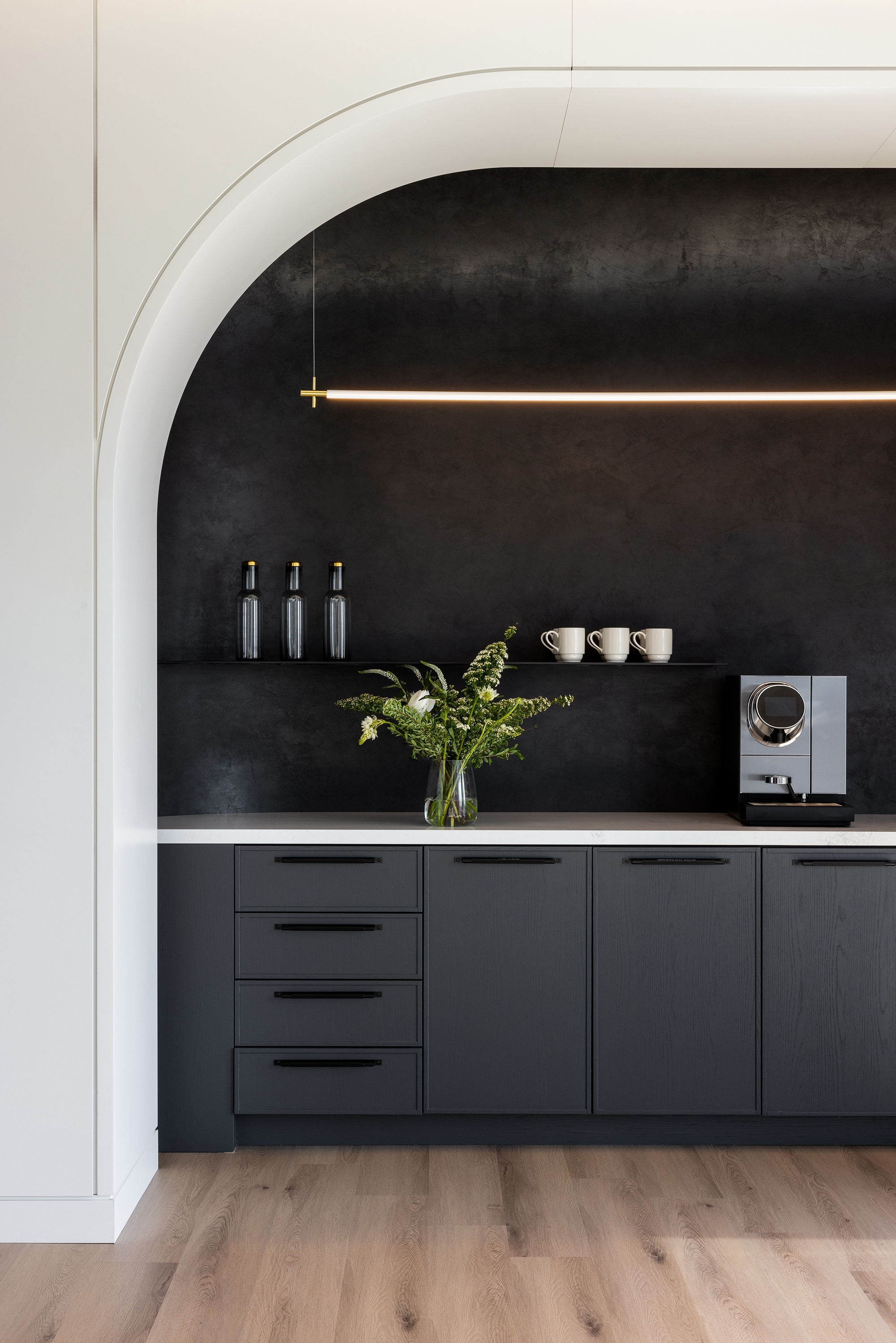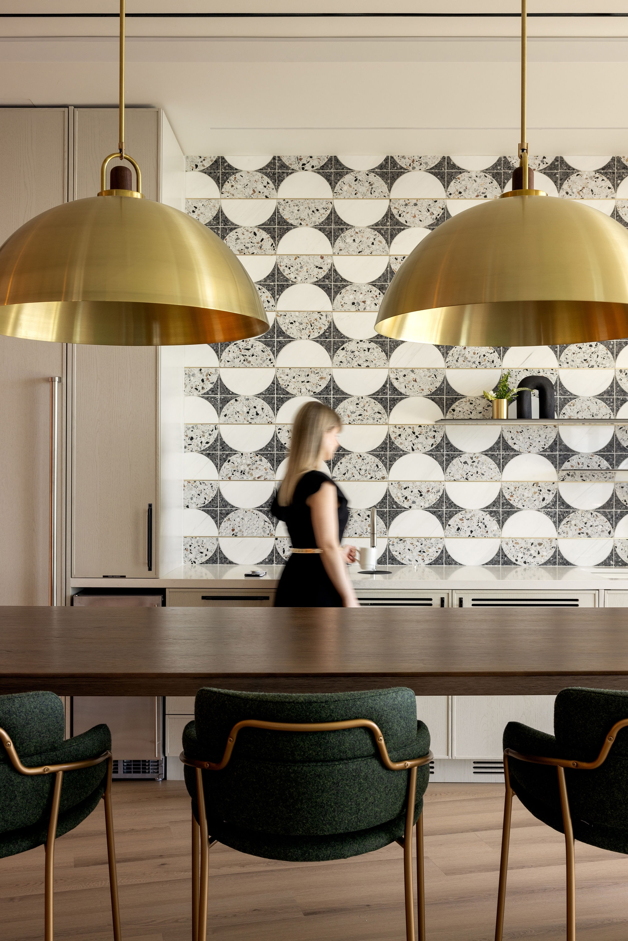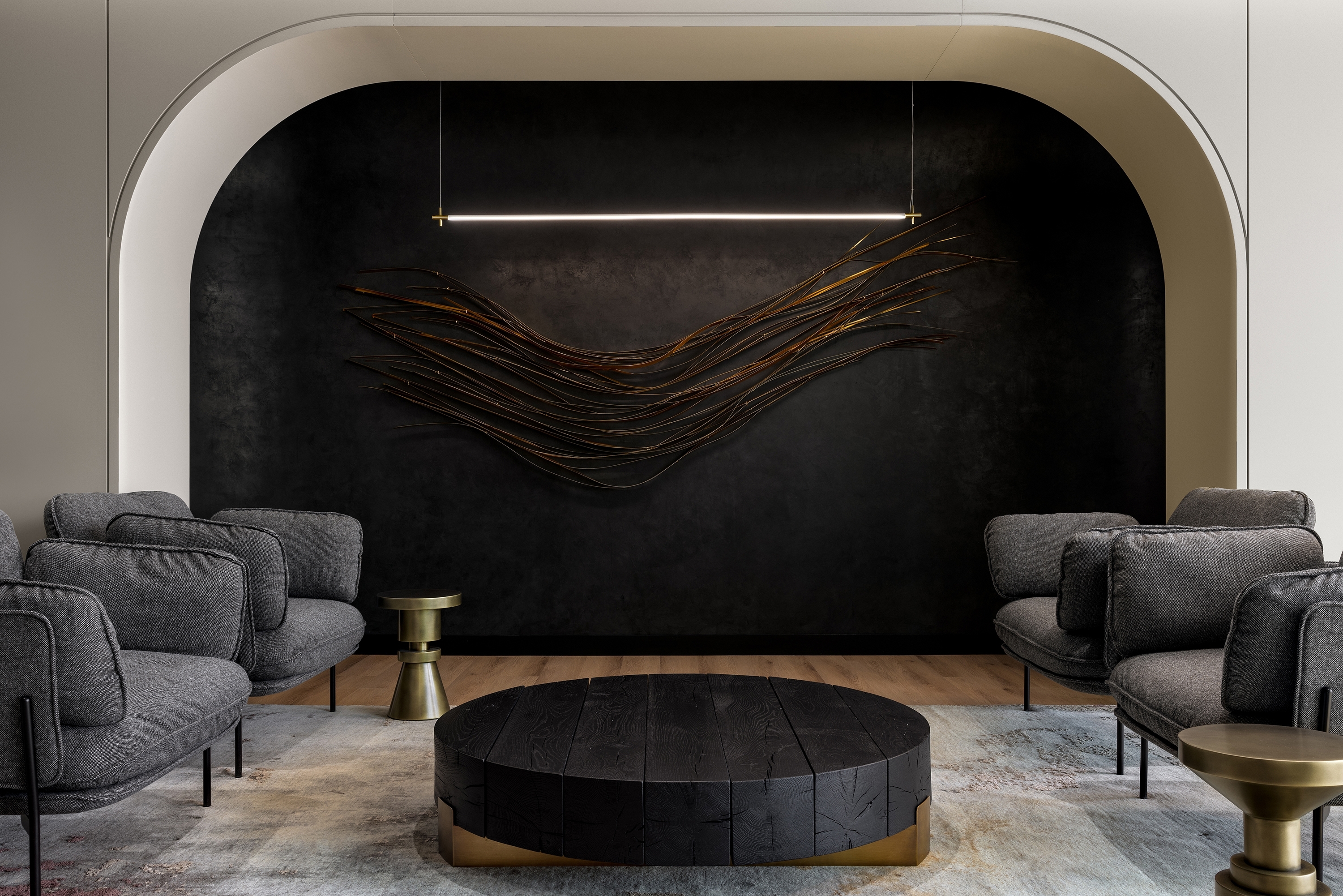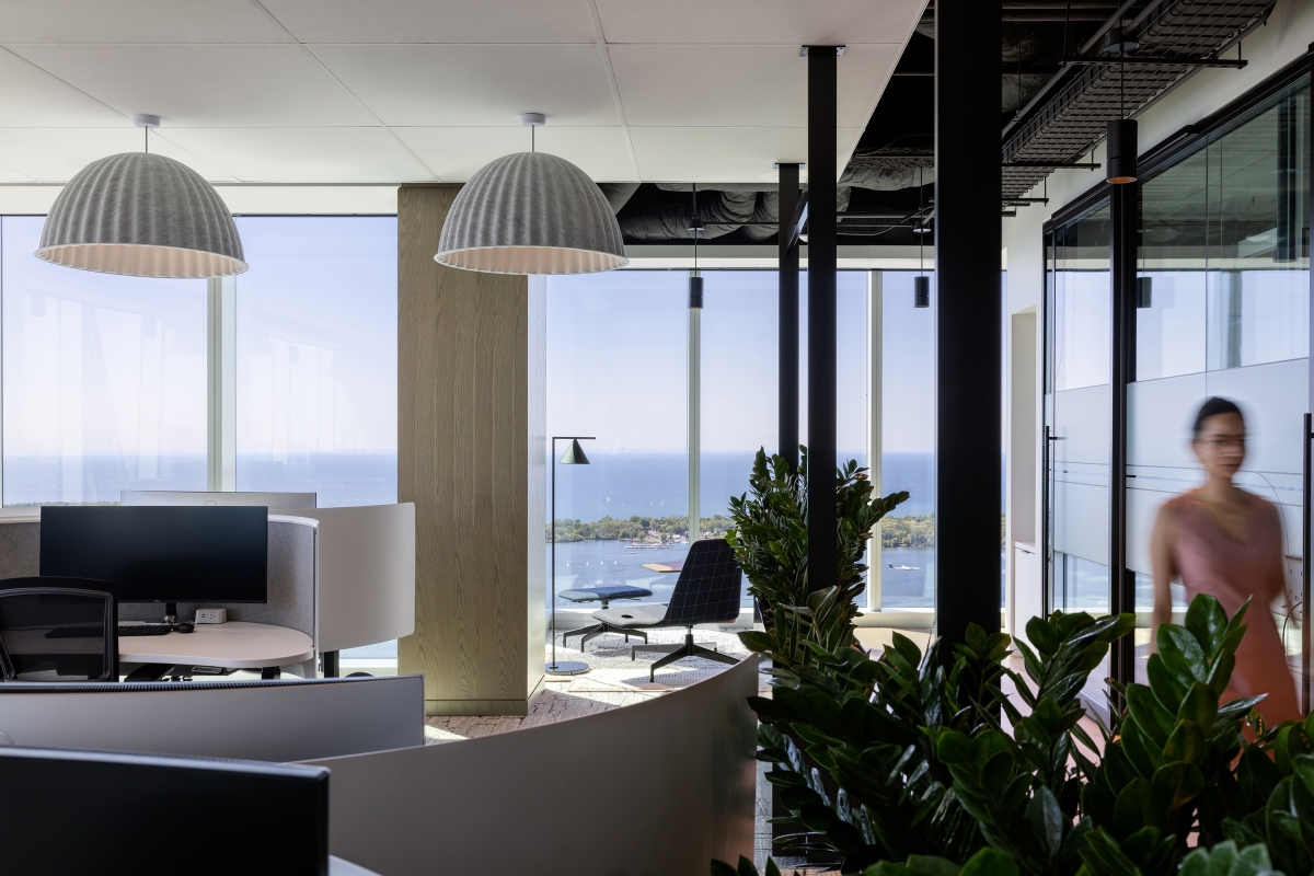 Elements of hospitality design create moments of delight that nurture a sense of ease as people experience the space. The curated art, objects, and greenery within the space come from diverse Canadian artists and vendors. Rich materials and furniture were chosen to provide the comforts of home with ergonomics in mind. Layered wood tones, hand troweled plaster, textured brick veneer, and leather wrapped pulls offer moments of tactile connection to authentic materials. The furniture and lighting evolve throughout to correspond with the unique experiences across the three floors.