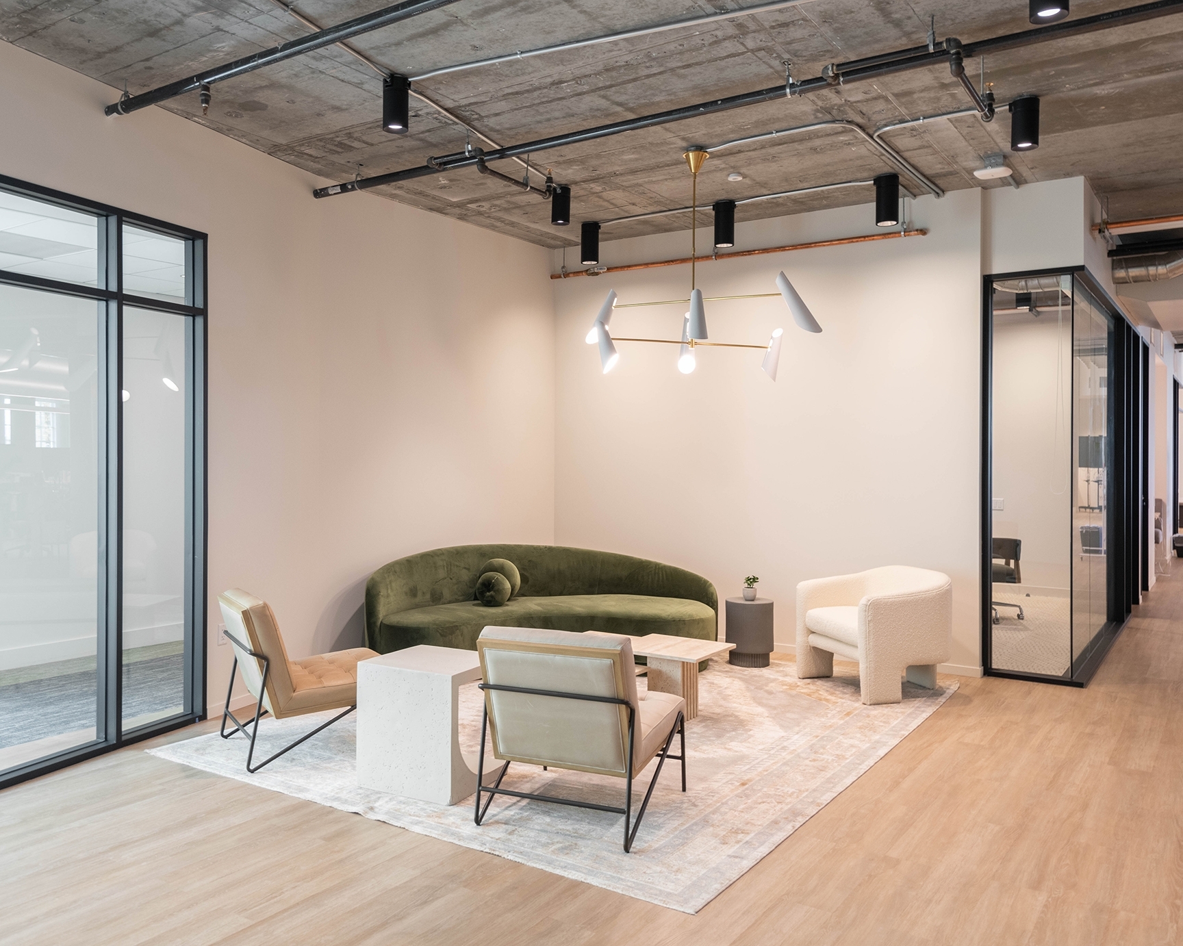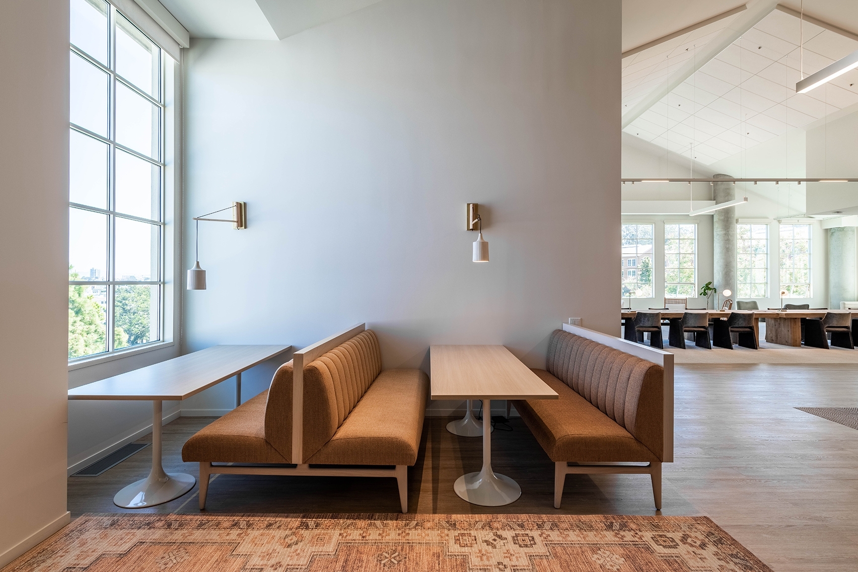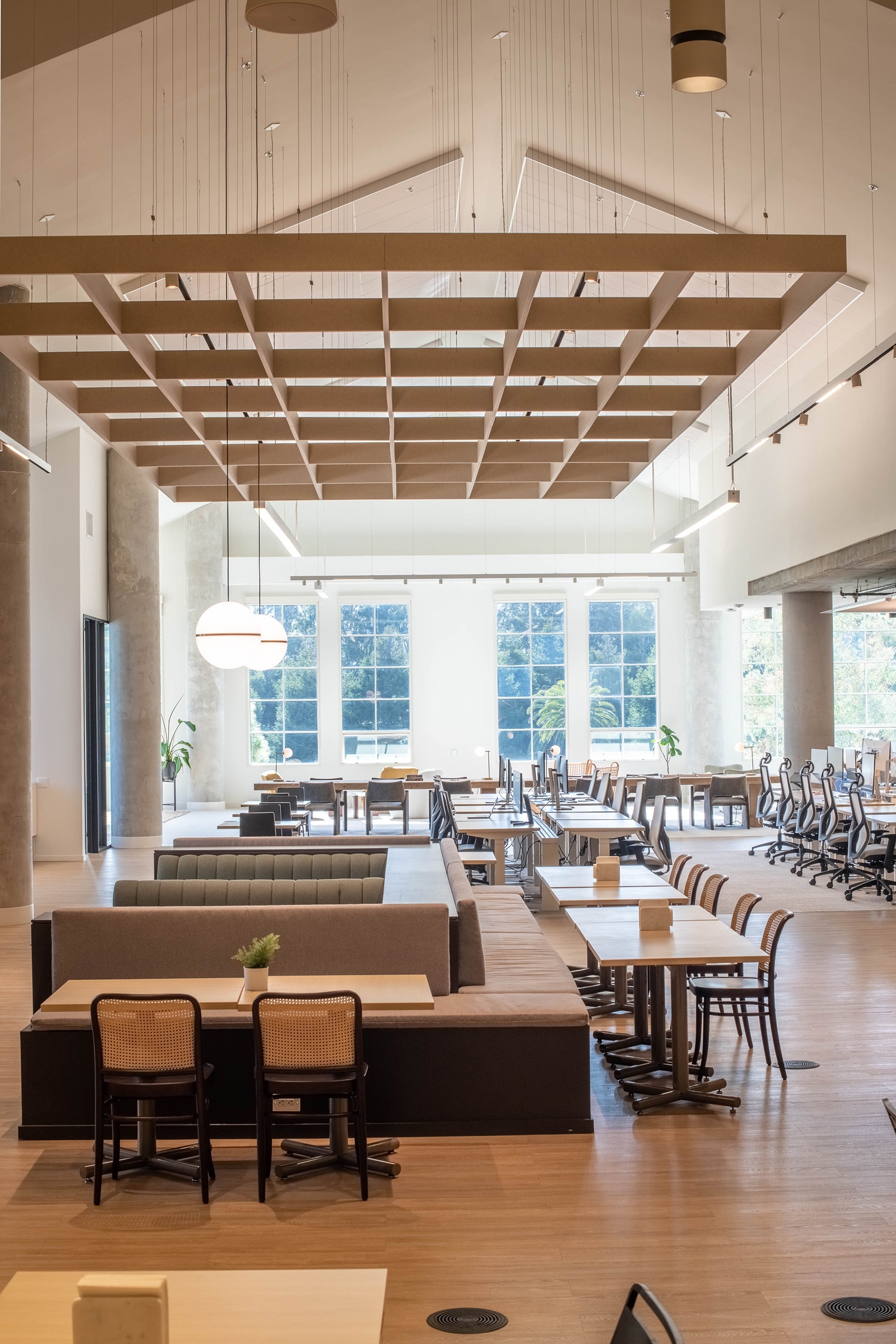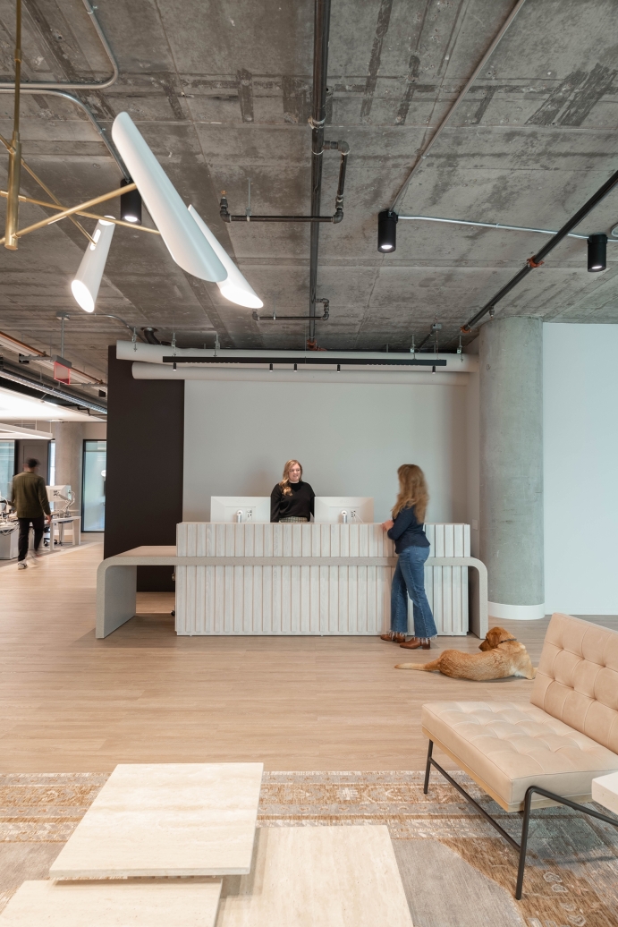 Within an aggressive timeframe, Pandemic-schedule setbacks, and a cost-conscious start-up budget, the designers delivered a workspace that is bright, open, and the perfect backdrop for Column’s work intensive culture. Soft curves within the furniture and lighting add comfort and style. A bright, earthy palette compliments the cypress trees outside, as seen from the 10-foot-tall windows. Welcoming breakout areas flow through and around the work area.