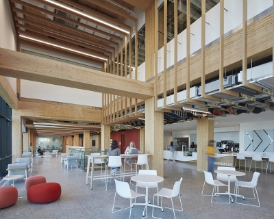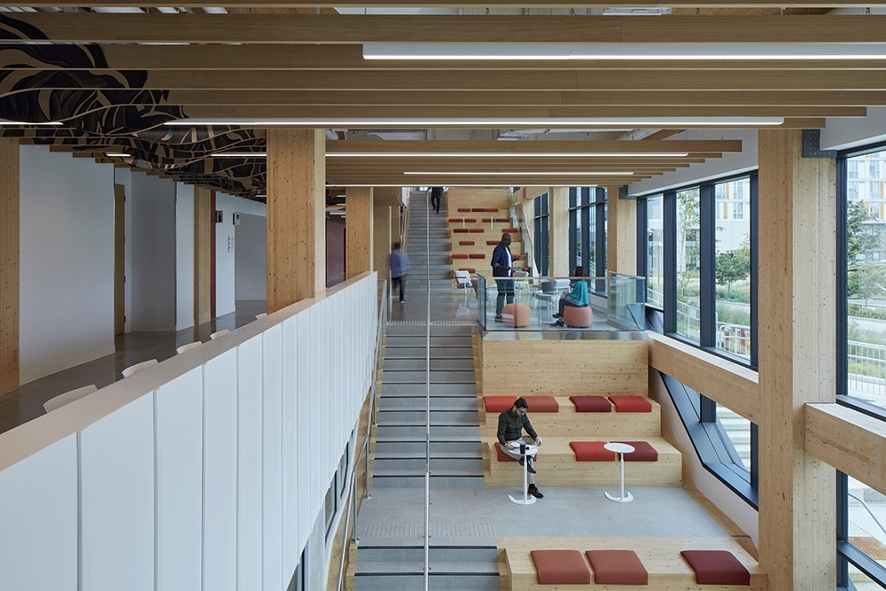 The Centennial College A Building embodies the Mi’kmaq concept of "Two-Eyed Seeing," blending Indigenous wisdom with Western perspectives. As Canada's first LEED Gold, net-zero carbon, WELL-certified, mass timber higher-education facility, it demonstrates a strong commitment to sustainability and social responsibility.