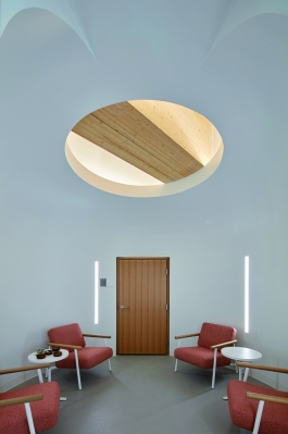 The building, aligned with cardinal directions, features an East-facing entrance, reminiscent of traditional longhouse. Inside, a grand stairway in Wisdom Hall leads to informal learning spaces that foster spontaneous conversation and idea exchange. At Level 3, the stair reaches a Student Hub and Café showcasing Indigenous cuisine, offering a cultural experience through food. The main corridor in Wisdom Hall is adorned with acoustic wood baffles that mimic water flow, reflecting Indigenous stories. The circular Indigenous Commons, the building’s heart, serves as a ceremonial space that anchors the building’s design.