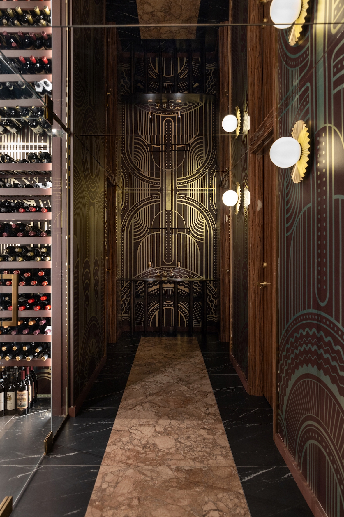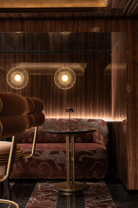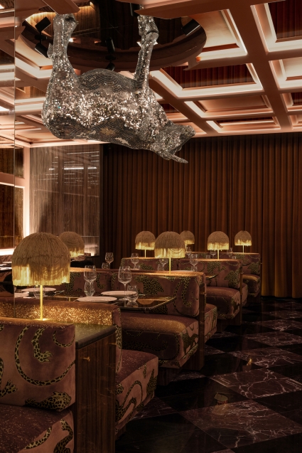 High lacquer wood panelling, gold leaf ceilings, antique mirrors, and graphic marbles envelop the space, while lush velvets, animal prints, and fringe create a tactile experience of mystery and opulence. Each meticulously curated element invites guests to savour a dining experience reminiscent of Studio 54. At the center of it all is a stunning upside-down mirror-encased bull that dazzles above patrons.