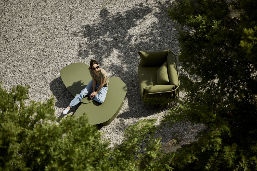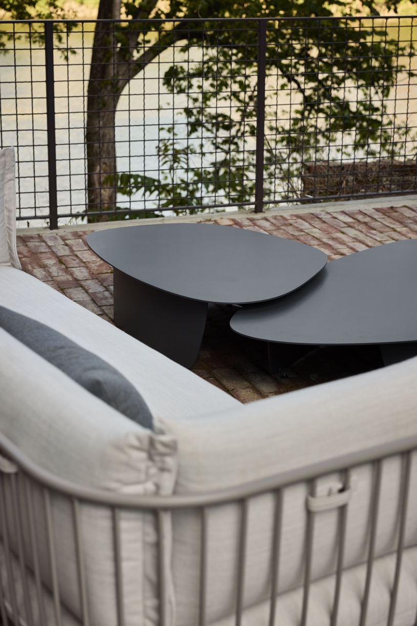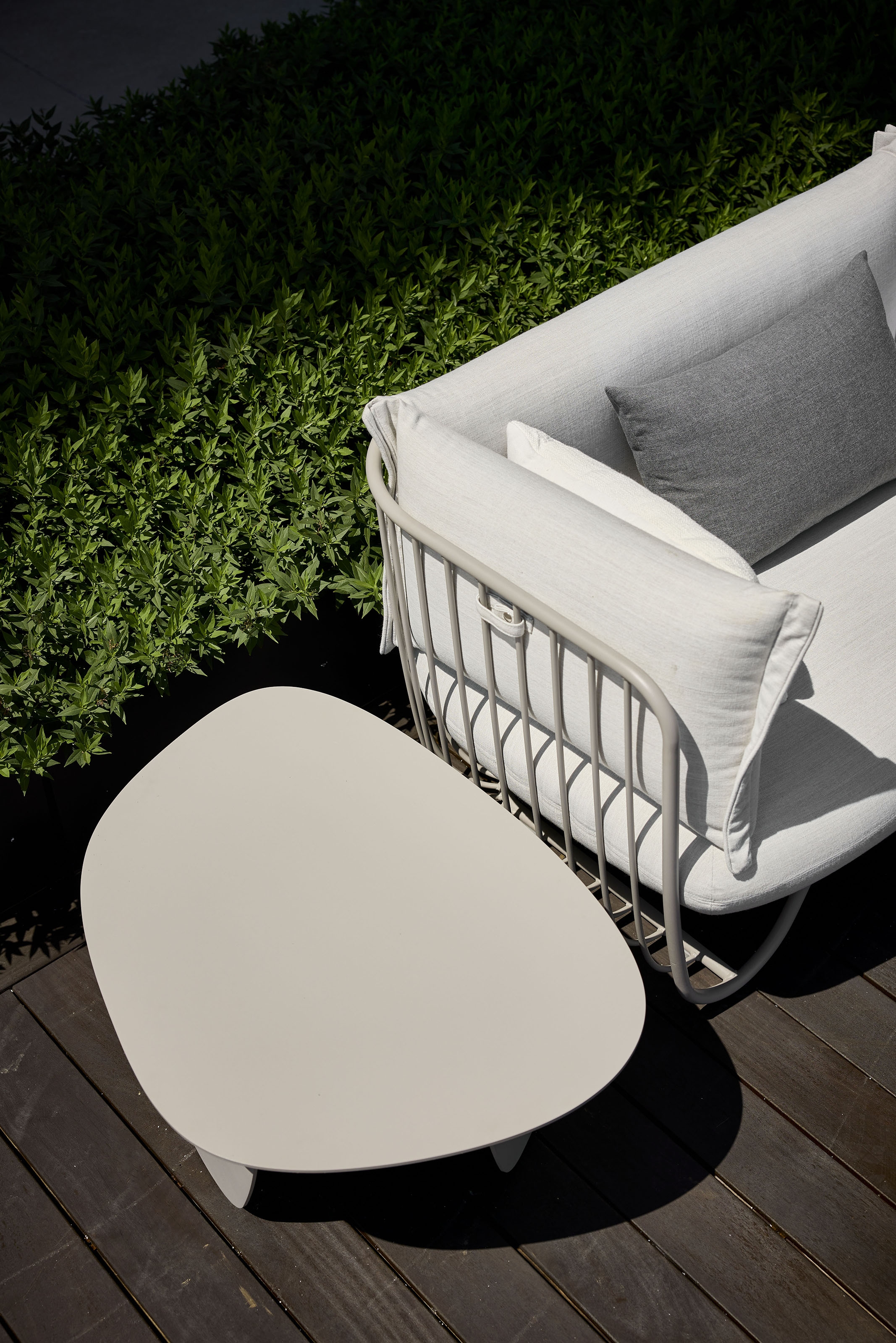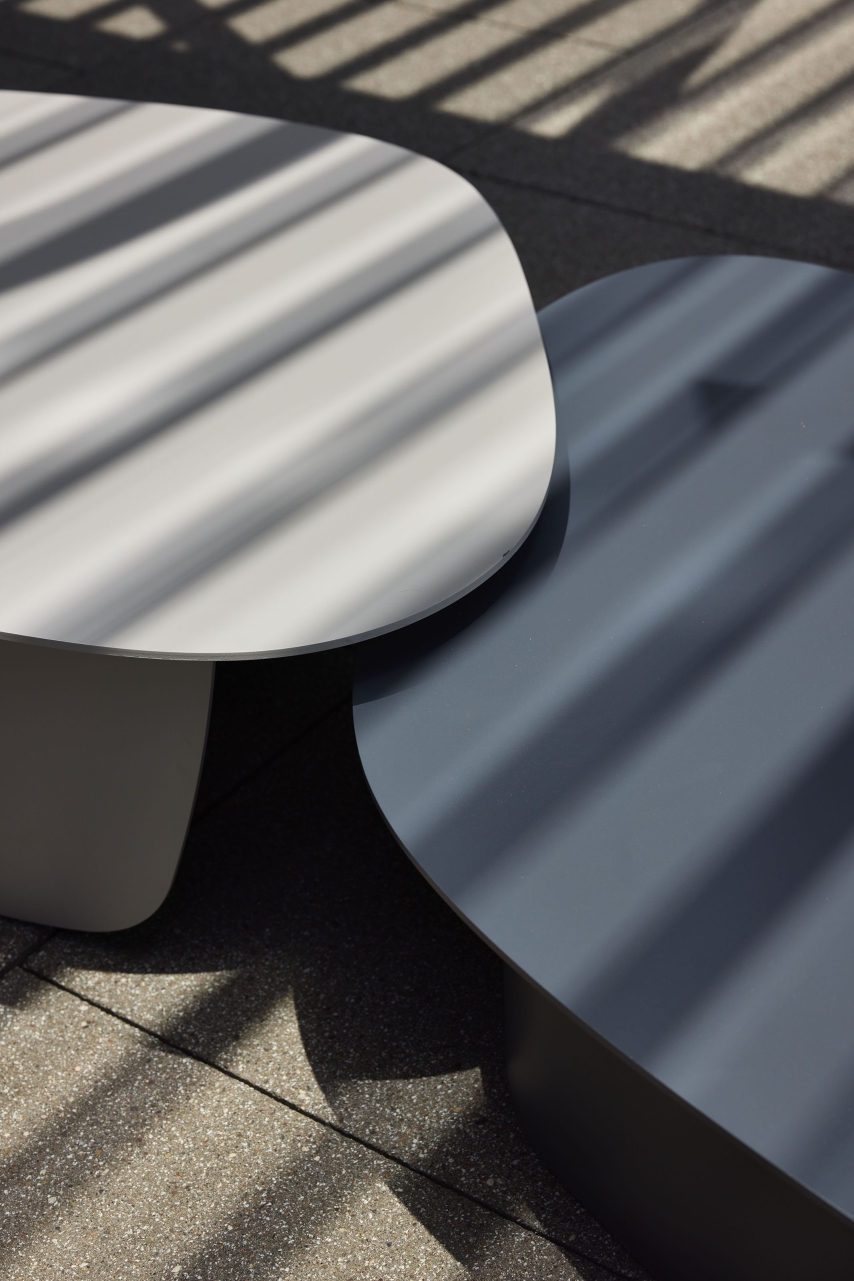 With understated natural form, Cora offers great design versatility, serving as a complement to landscape elements and organic design while also serving to artfully contrast the right angles and crisp edges of modern architecture. The elegant curvature continues in the expertly engineered understructure of the tables throughout which not all points are parallel to the ground plane. This creates a cantilevered, overhanging effect that enables Cora tables to nest in various orientations while remaining stable and fully grounded.