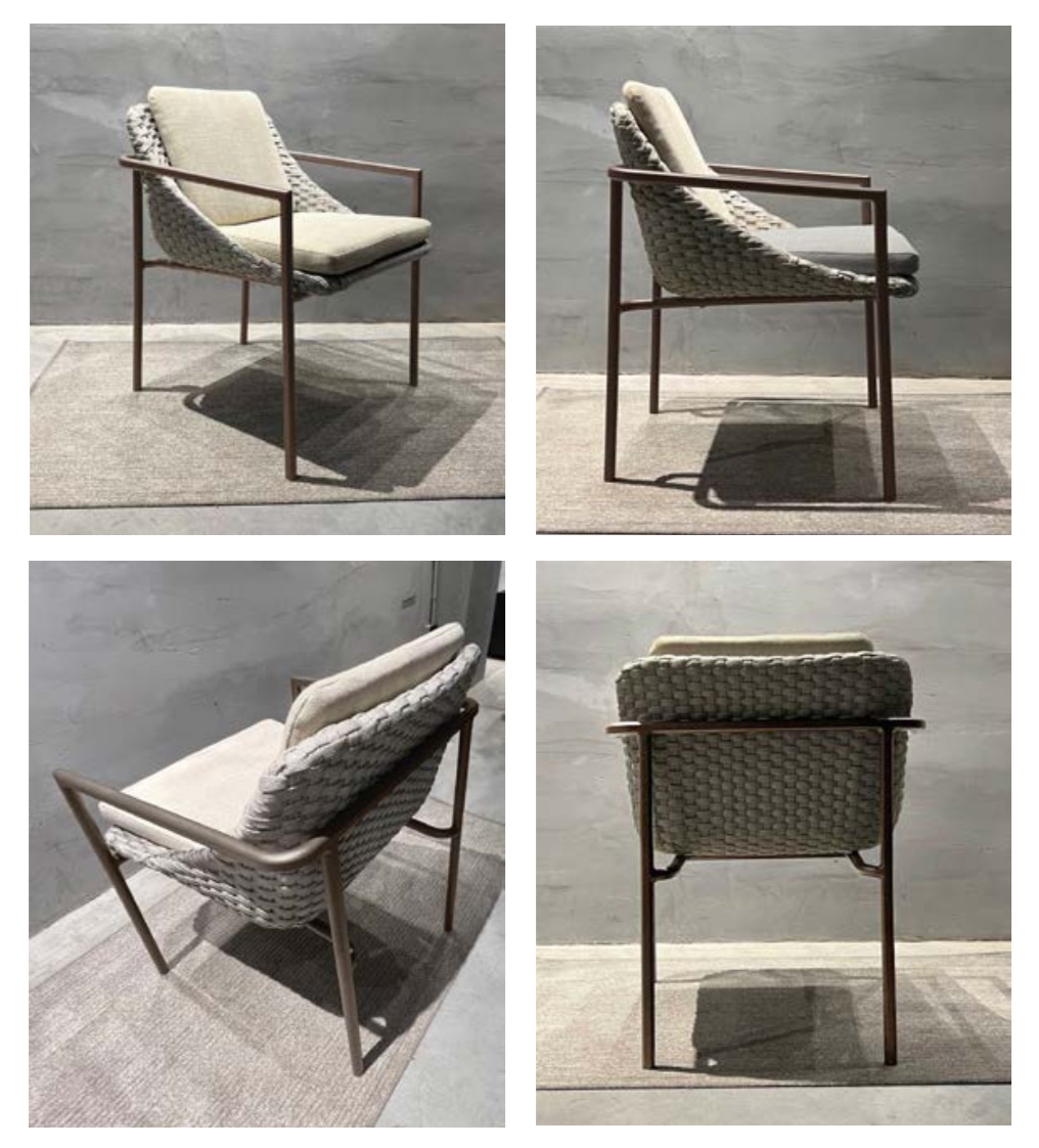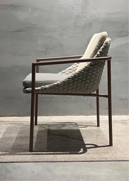 We also used proven materials but with new finishes generally not seen outdoor e.g. the recyclable aluminium has a special treatment giving it the look of polished dark bronze, the weaving is acrylic fibres dressed with acrylic fabrics, all in natural tones.