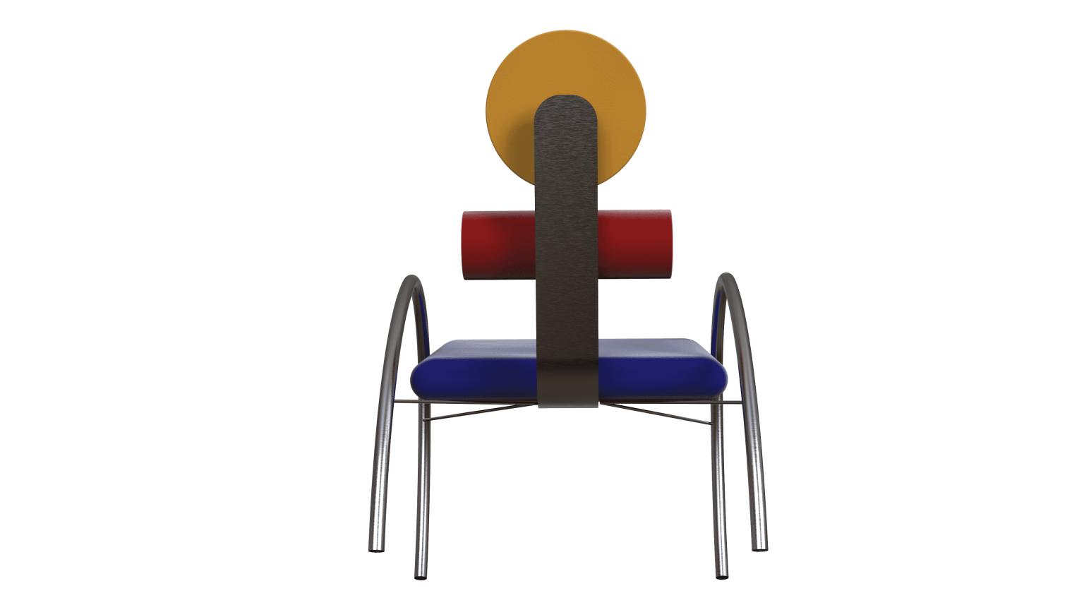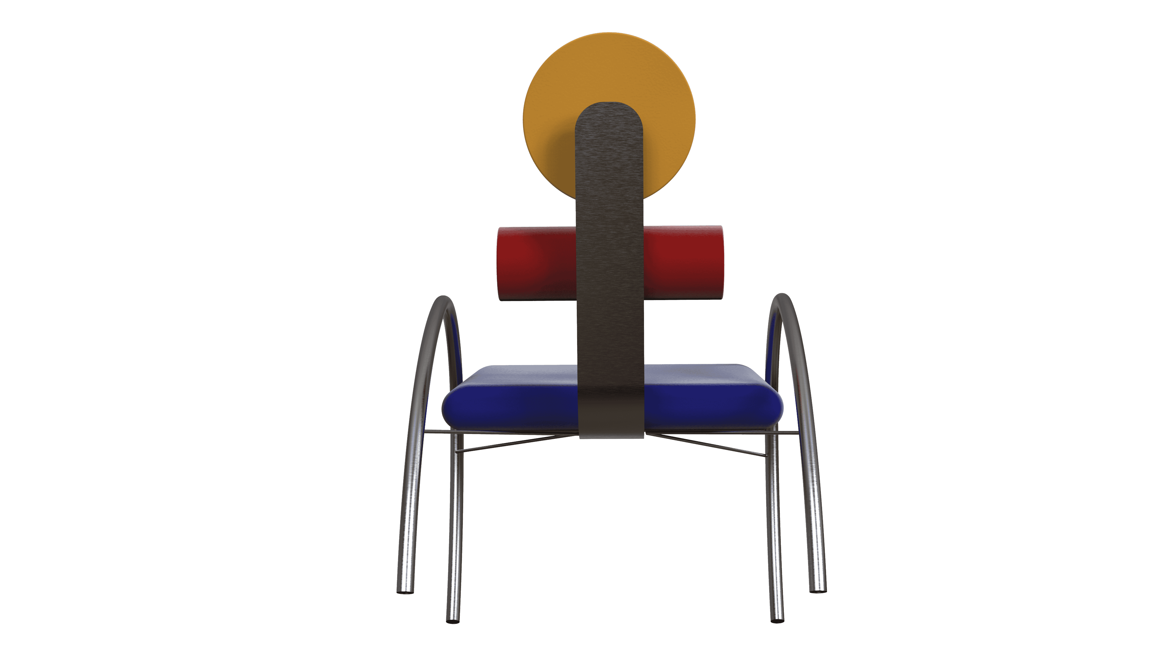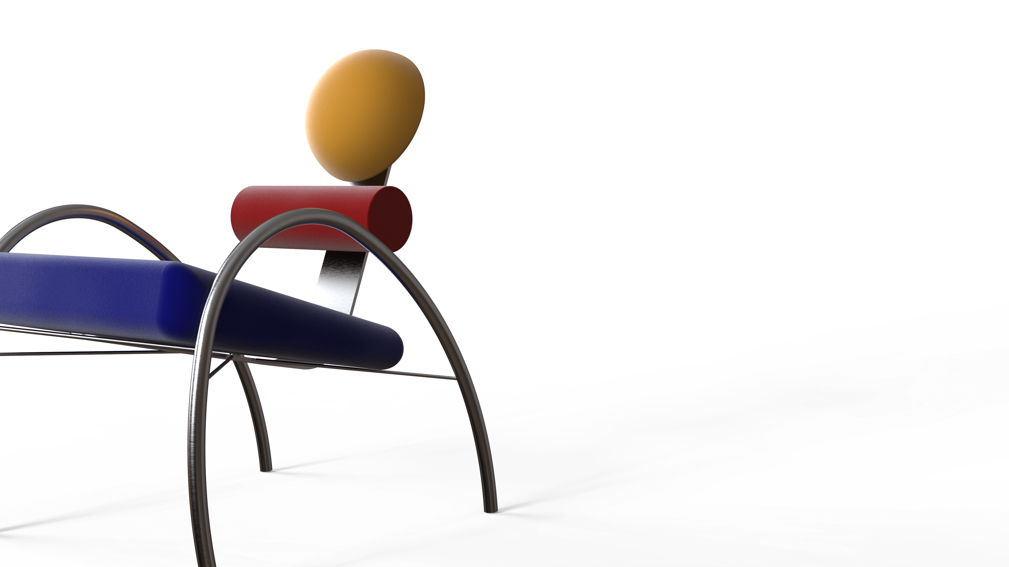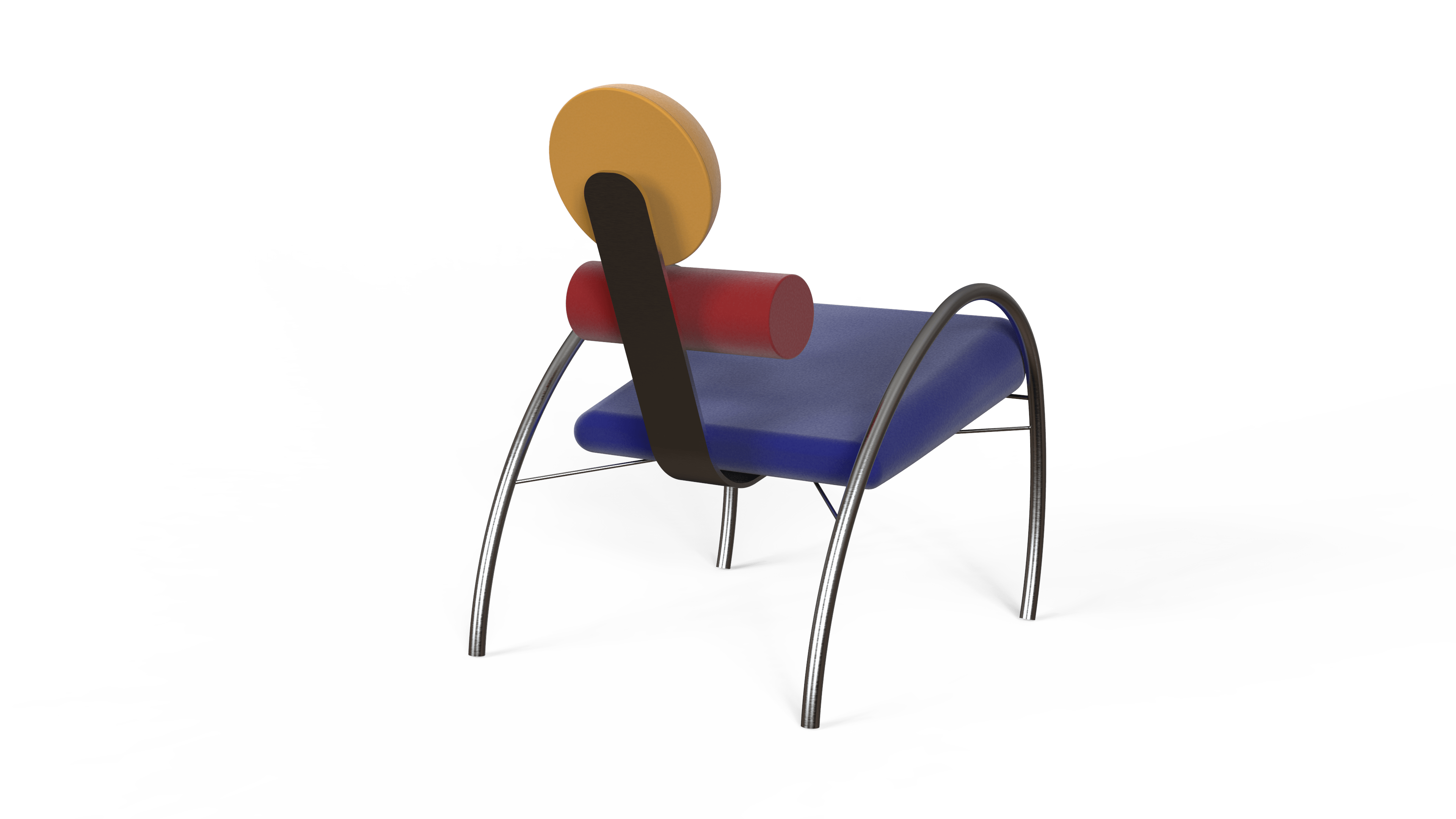Aulski is a Memphis-Bauhaus inspired chair. This chair focuses on key features such as geometry and colors. It has velvet circular and cylindrical cushions, as well as a slanted squared shaped cushion. The base of this design is made of stainless steel bars for support and aesthetics.