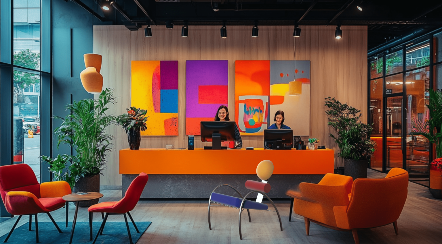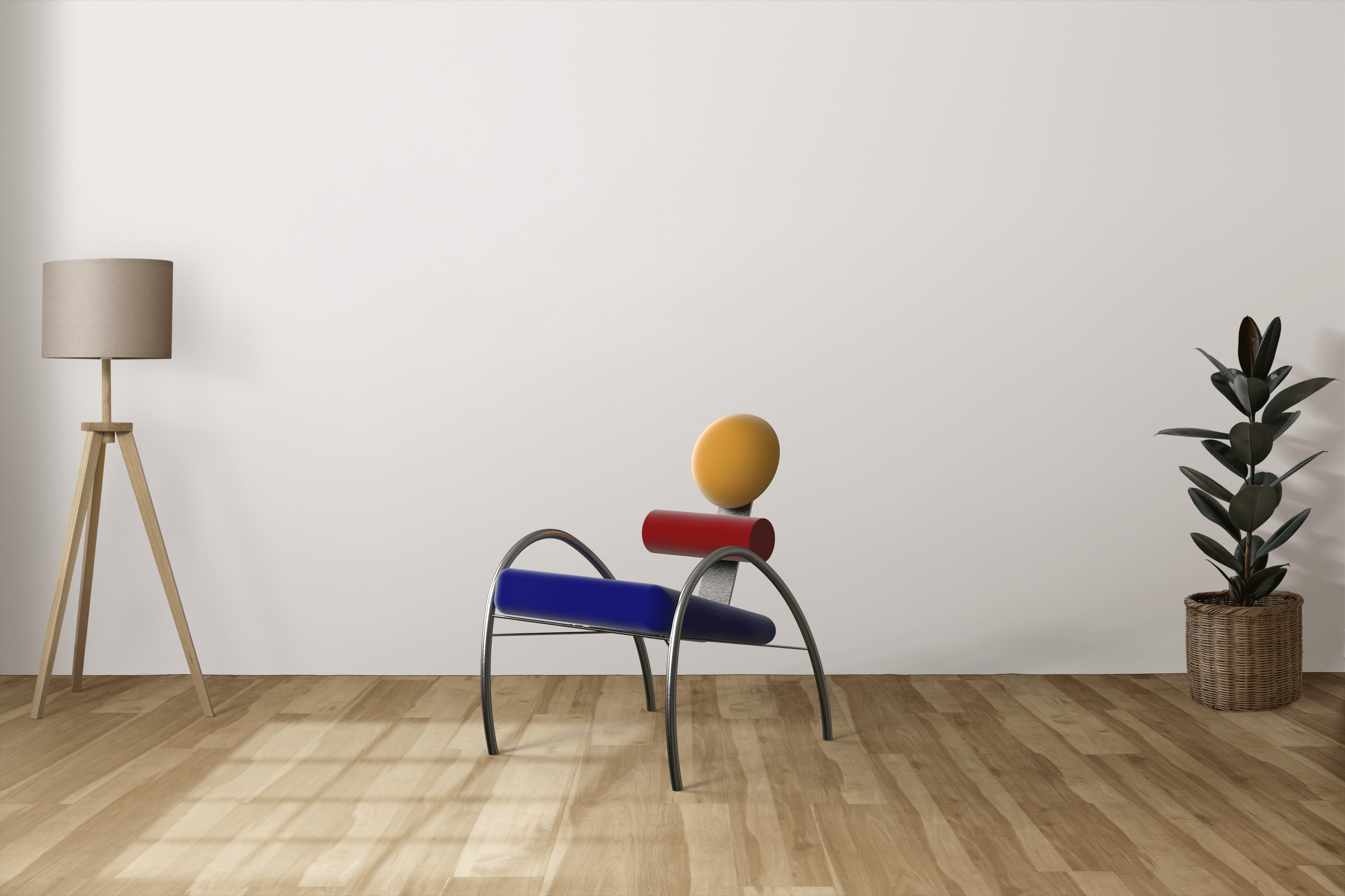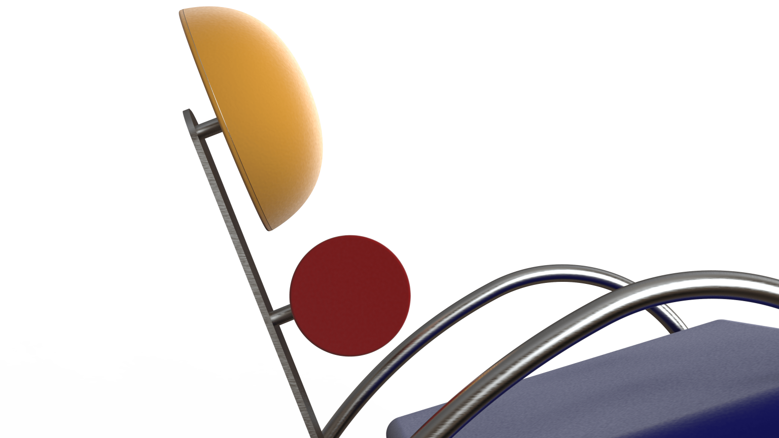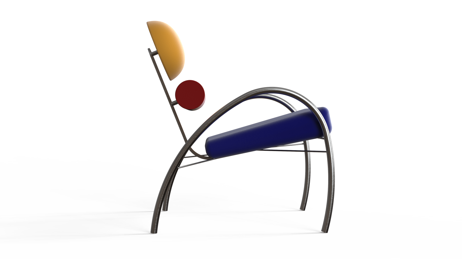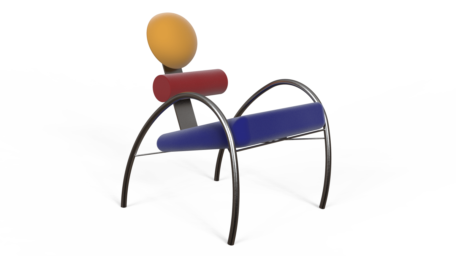 Aulski is a Memphis-Bauhaus inspired chair. This chair focuses on key features such as geometry and colors. It has velvet circular and cylindrical cushions, as well as a slanted squared shaped cushion. The base of this design is made of stainless steel bars for support and aesthetics.