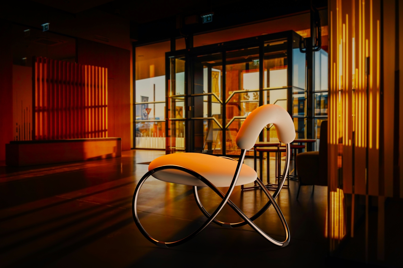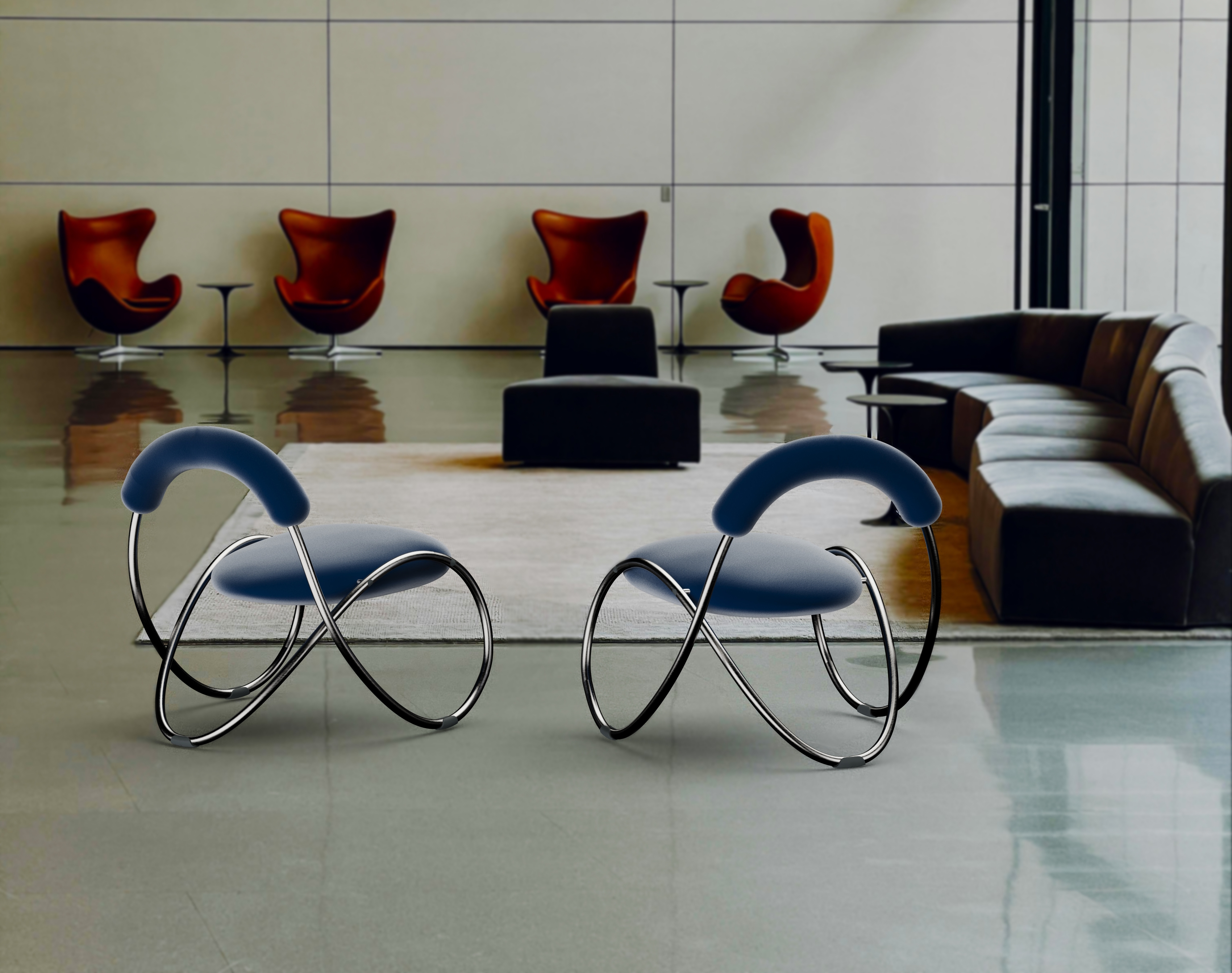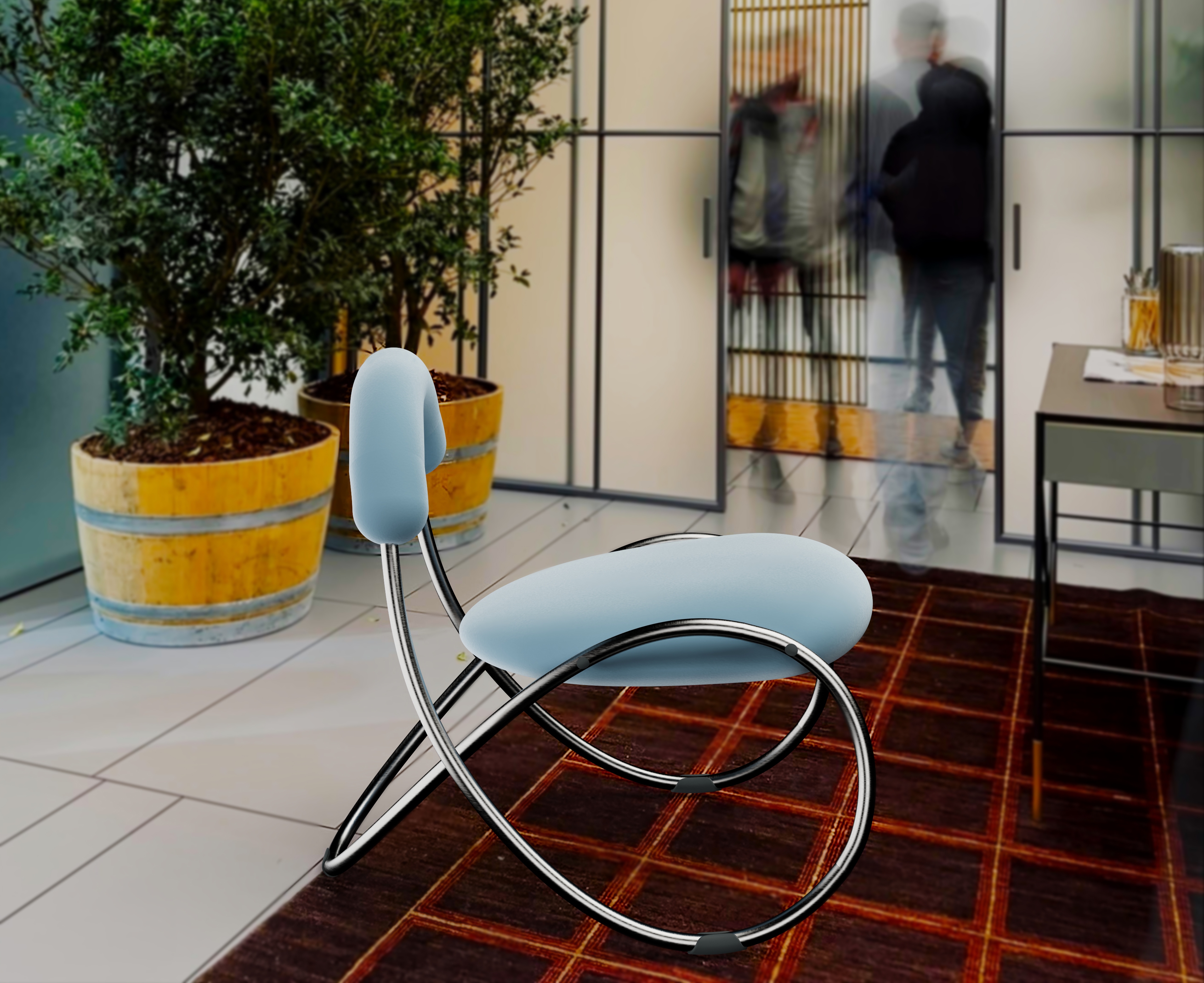 The Infini chair is designed to evoke a sense of movement through visual flow rather than physical motion. The gracefully curved steel tubing forms a smooth, continuous loop, while the seat and back cushions mirror the roundness and fluidity of the frame. The chair incorporates detachable rubber stoppers at three connection points to prevent unwanted movement.
