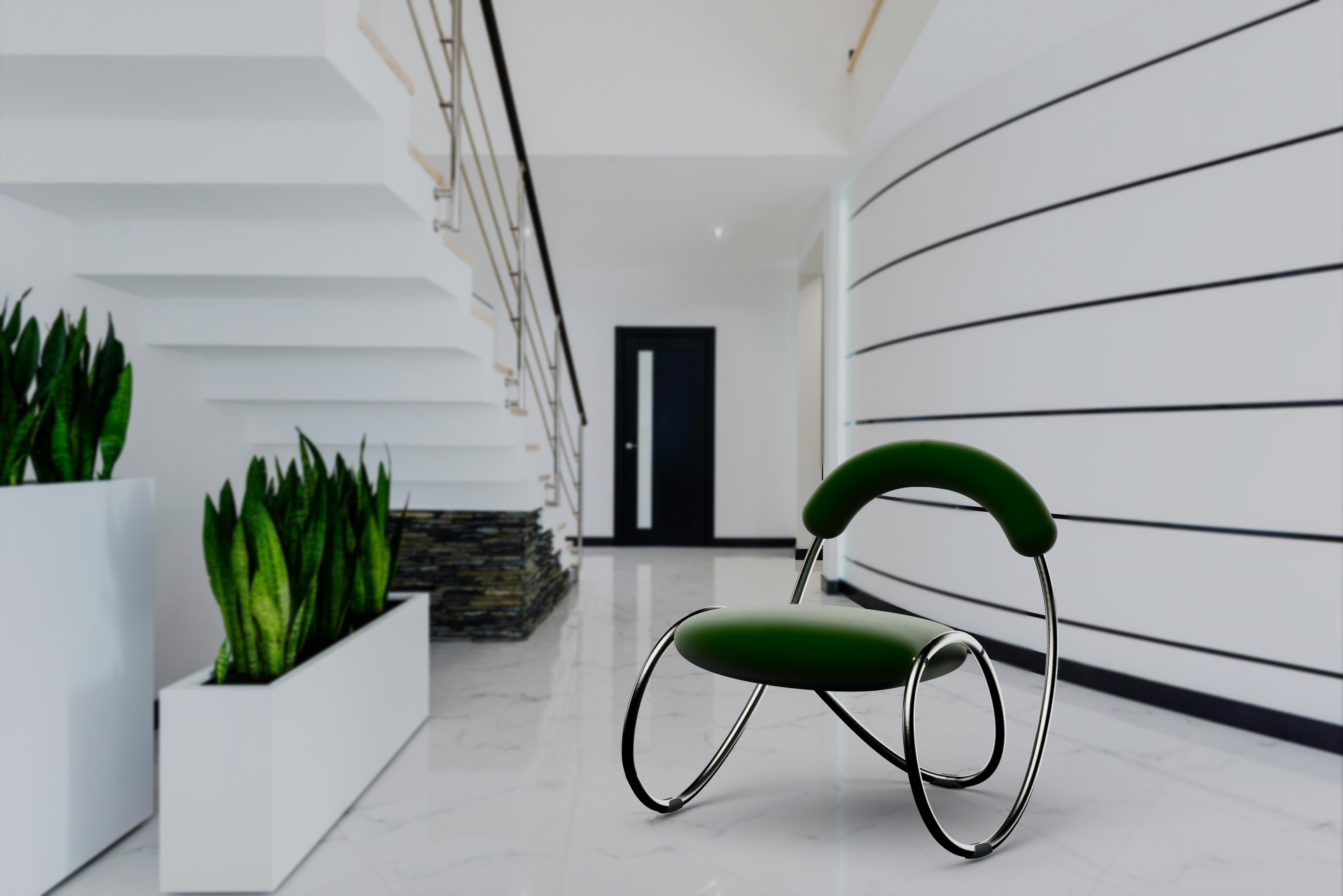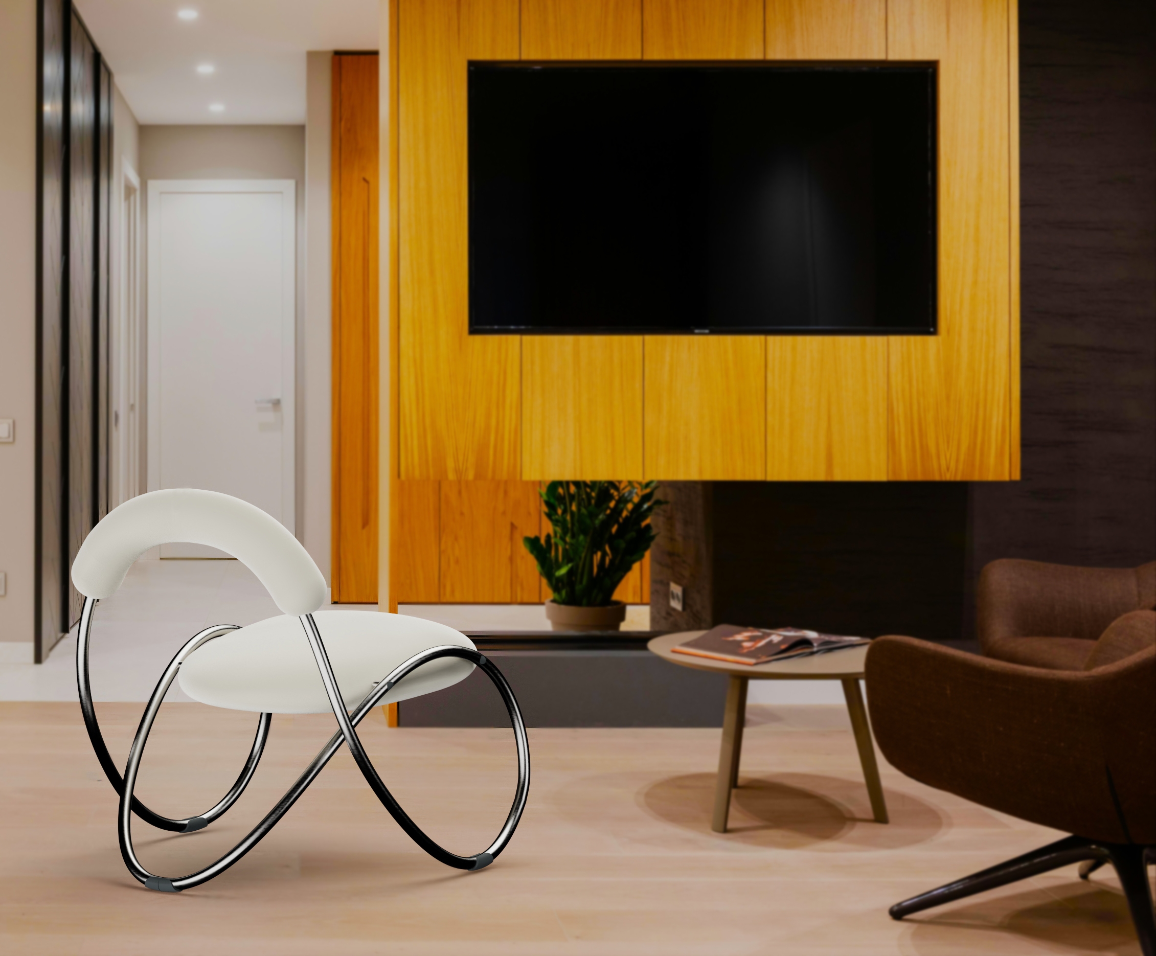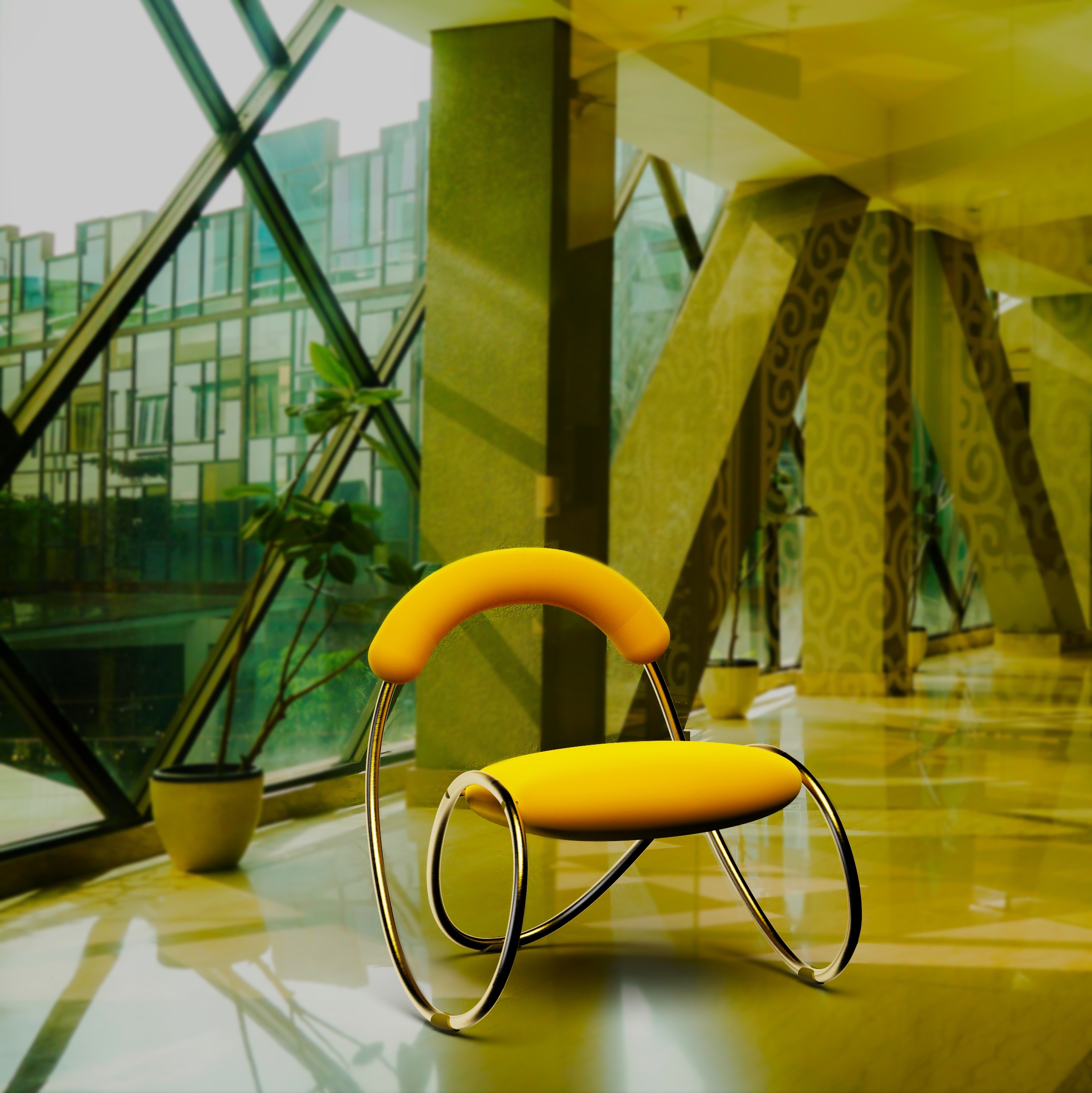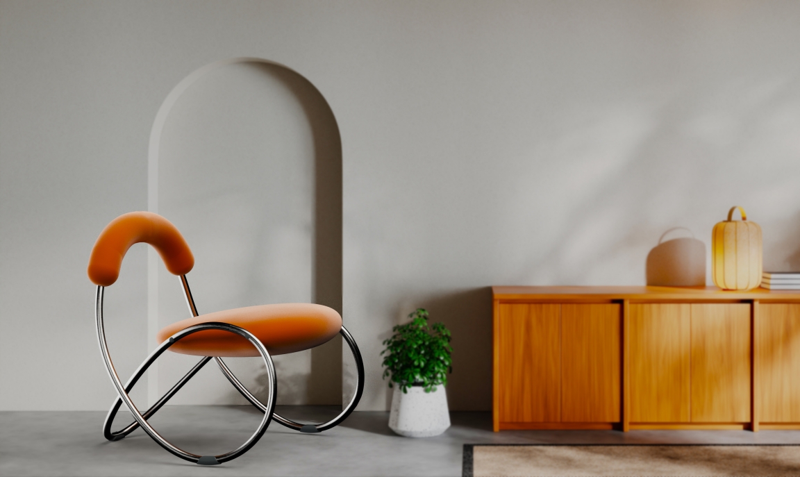 The Infini chair is designed to evoke a sense of movement through visual flow rather than physical motion. The gracefully curved steel tubing forms a smooth, continuous loop, while the seat and back cushions mirror the roundness and fluidity of the frame. The chair incorporates detachable rubber stoppers at three connection points to prevent unwanted movement.