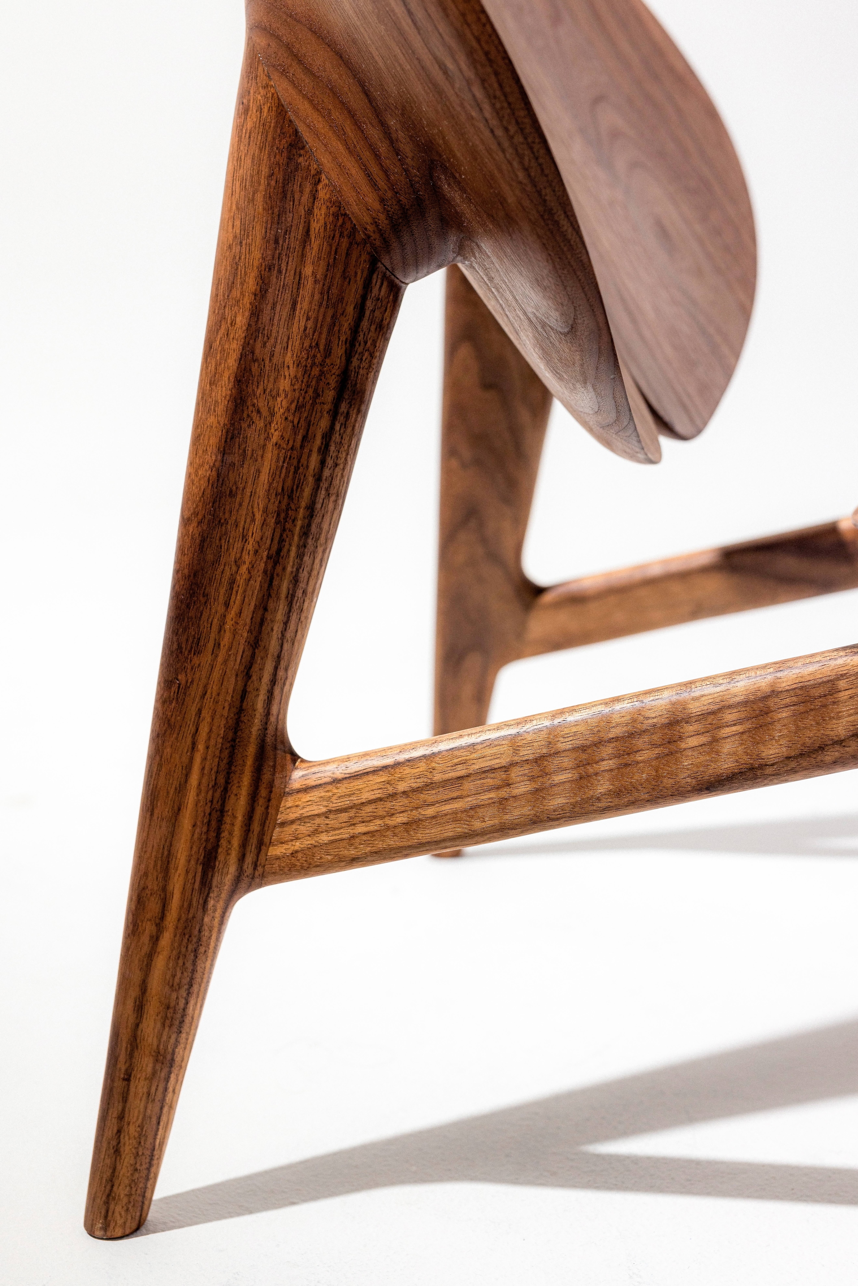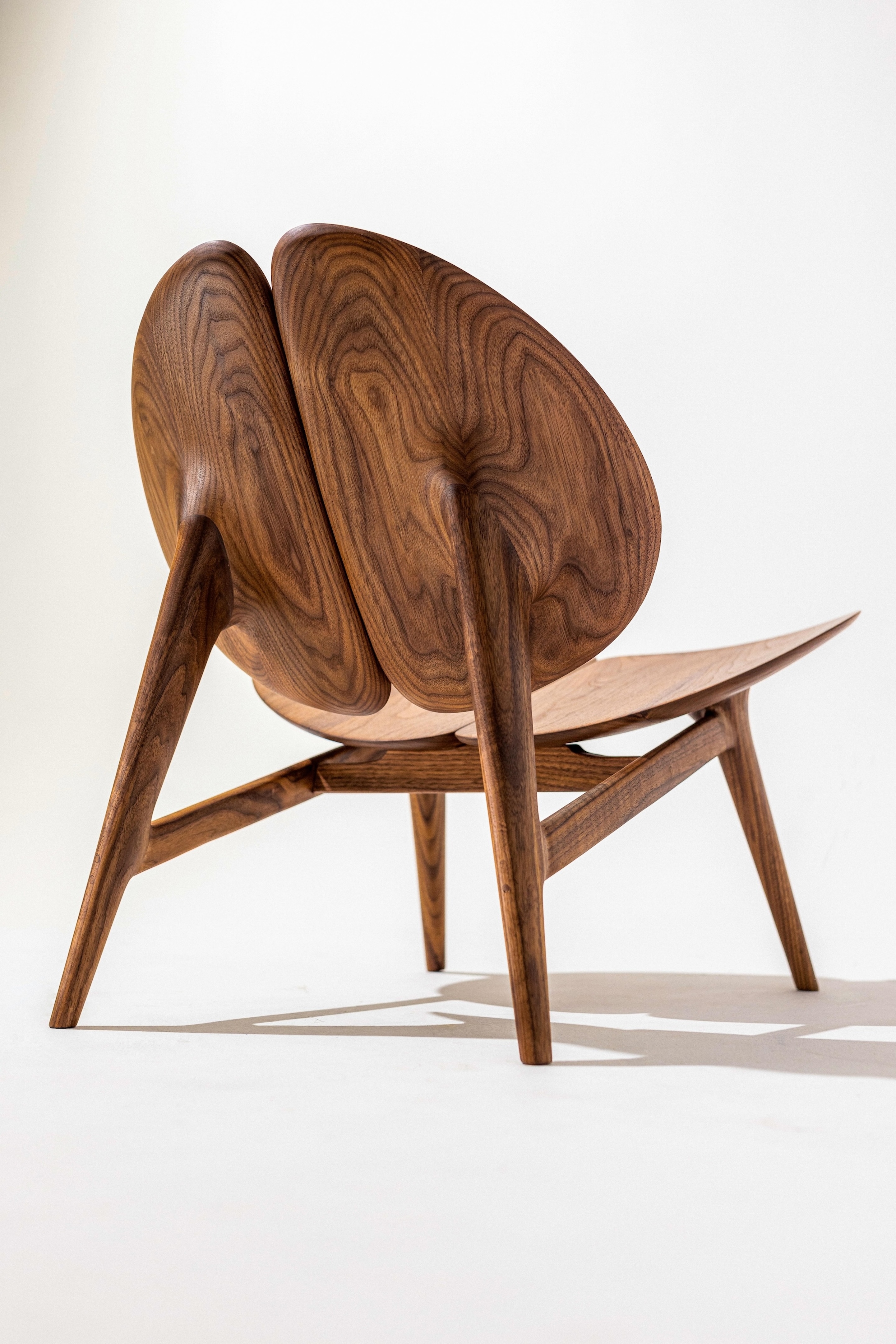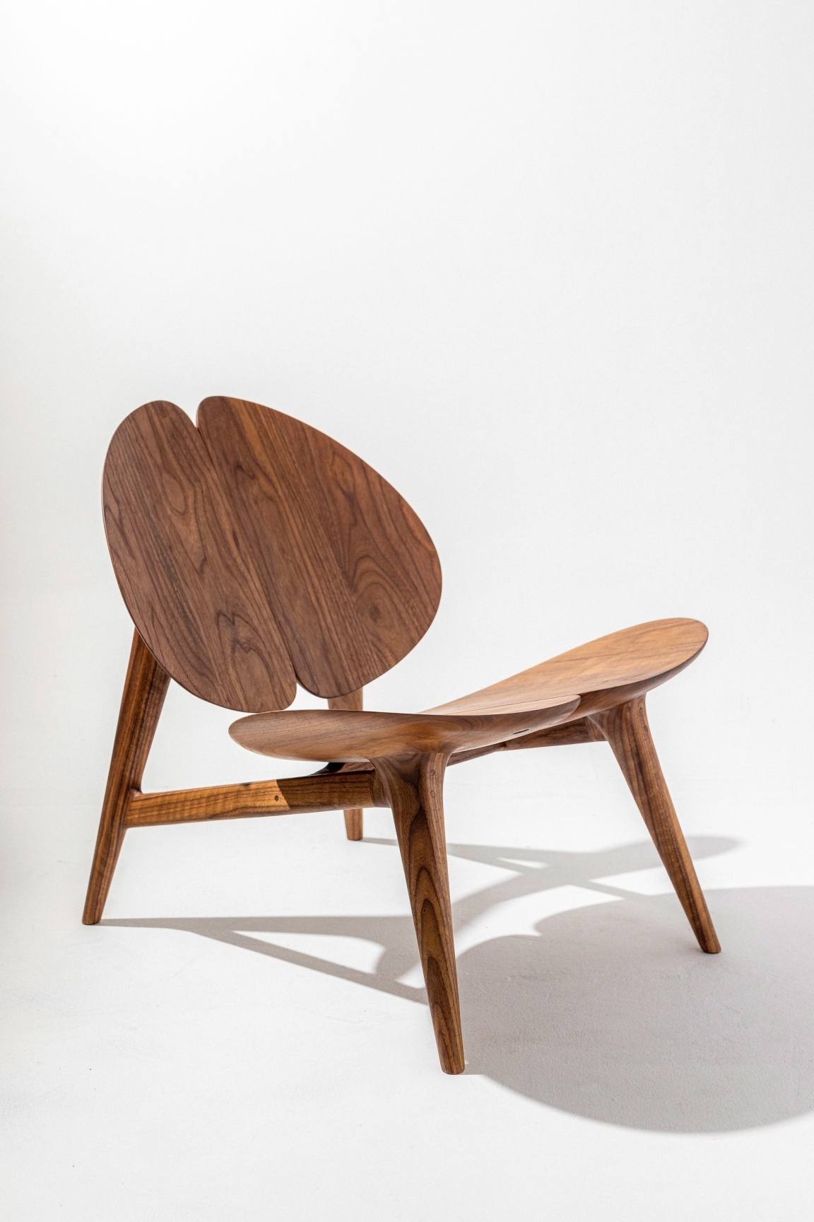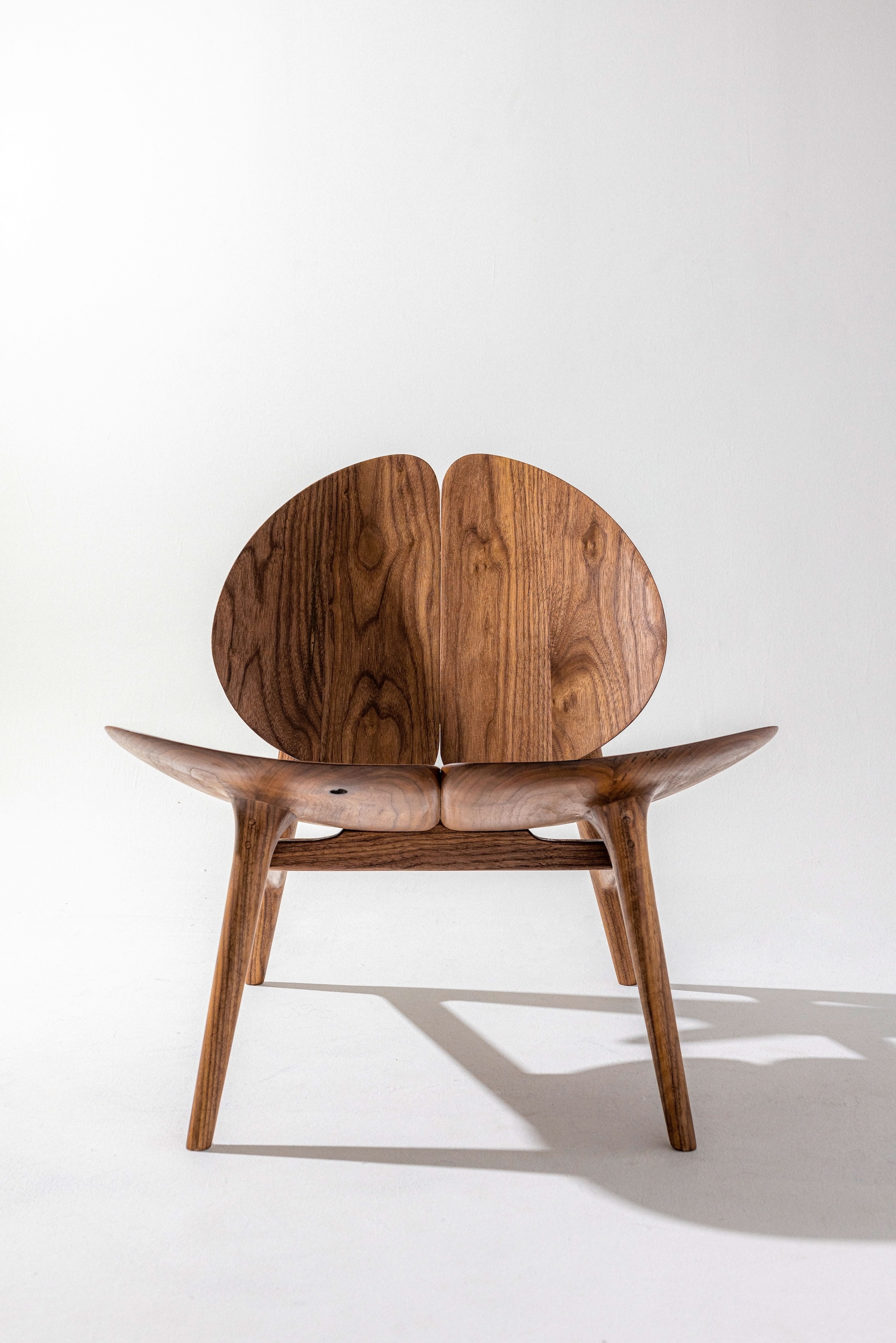 The Lamina Chair is a luxurious lounge chair inspired by the four-leaf clover, symbolizing luck and harmony. It embodies the essence of retreat, relaxation, and recharge, seamlessly integrating the tranquility of nature into your home environment. Its design strikes a delicate balance between form and function, offering a unique blend of comfort and elegance, making it an ideal sanctuary for unwinding and reconnecting with the essence of life. Crafted from walnut wood, the chair brings the warmth and richness of natural materials into space, further enhancing the connection to nature and creating a soothing atmosphere for relaxation.
