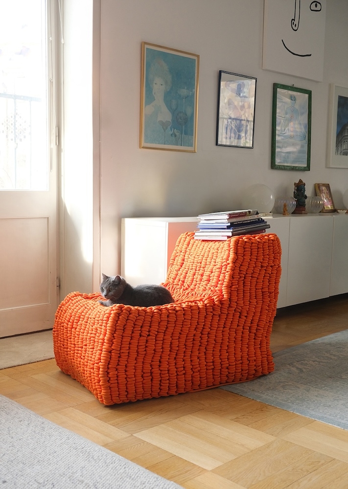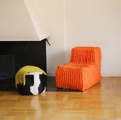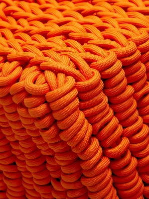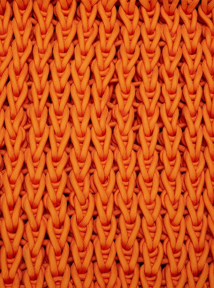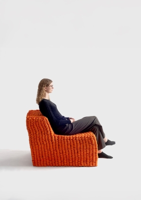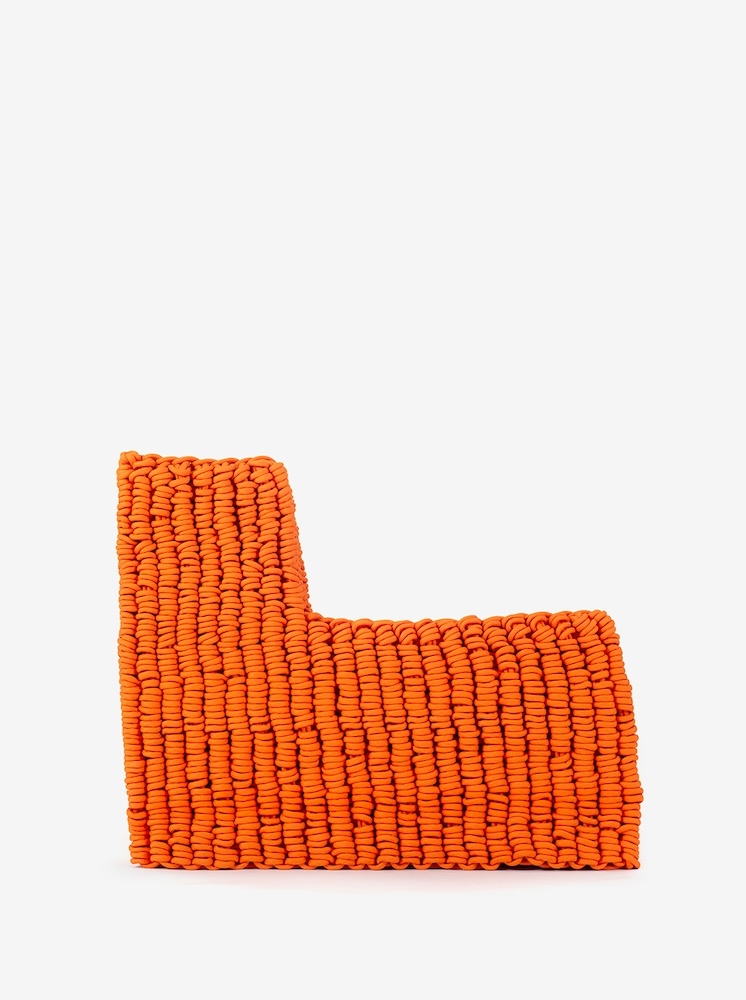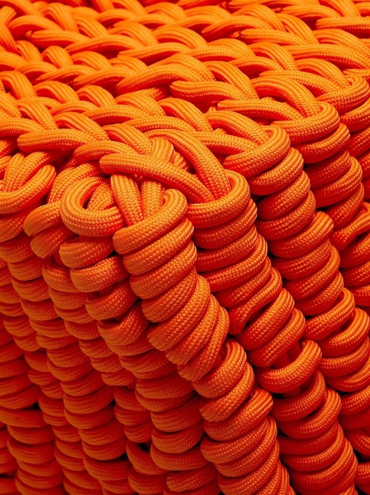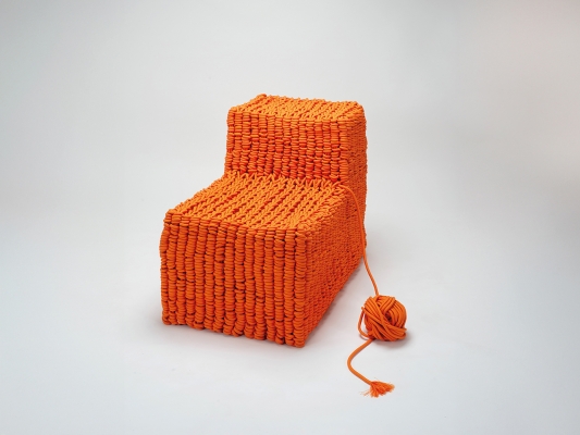 The 2500m Lounge Chair is crafted from a single continuous 2.5km rope using the Multiweave technique, transforming a simple material–a rope–into a complex structure. The warps are arranged in vertical rows, stretching from the bottom to the top. The weave draws patterns in between the warp grid to create three-dimensionality by building layers upon layers. When the weave is finished, the warps are interlaced and finished off with a single knot, tying the beginning and end of the 2500 meter long rope. If untied, the chair unravels, making the material fully reusable. The vivid orange 12mm shoelace in this structure generates new kinds of textile patterns. This mono material piece shows a new way of producing upholstered furniture, where only one person, one material and one technique is needed to make a complete piece of furniture. The result is the first three-dimensionally woven chair, offering a seat that feels like sinking into wet snow, gradually adapting to your body and creating a personalized seat shaped by you. Initially geometric and austere, the chair deforms as it interacts with the seated human body, transforming into a softened, sculptural shape molded by touch.