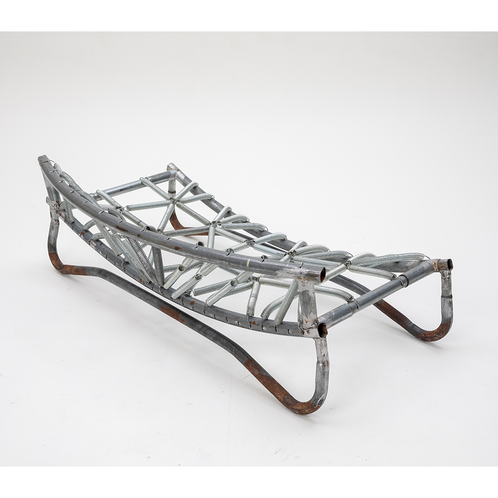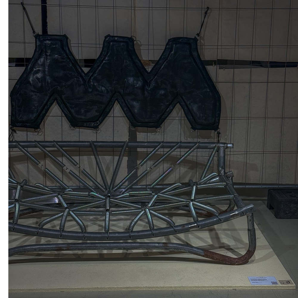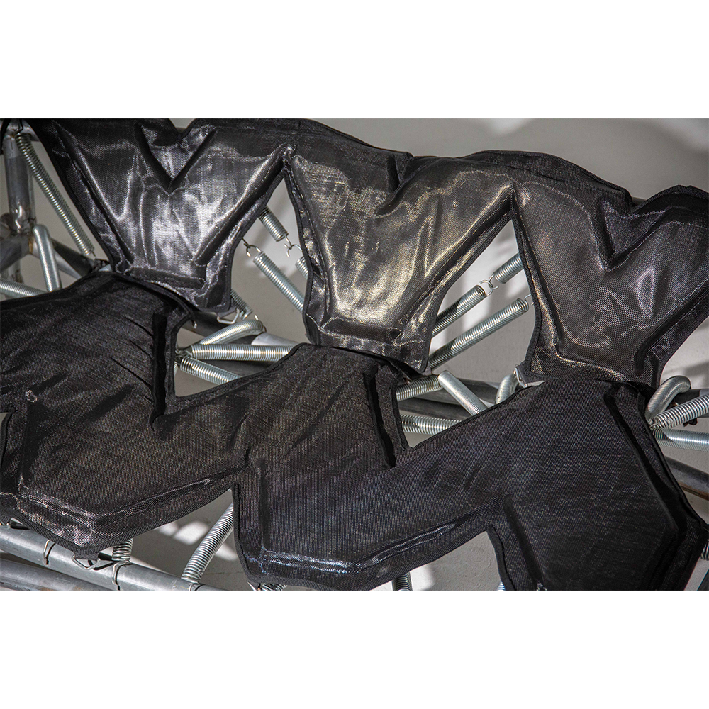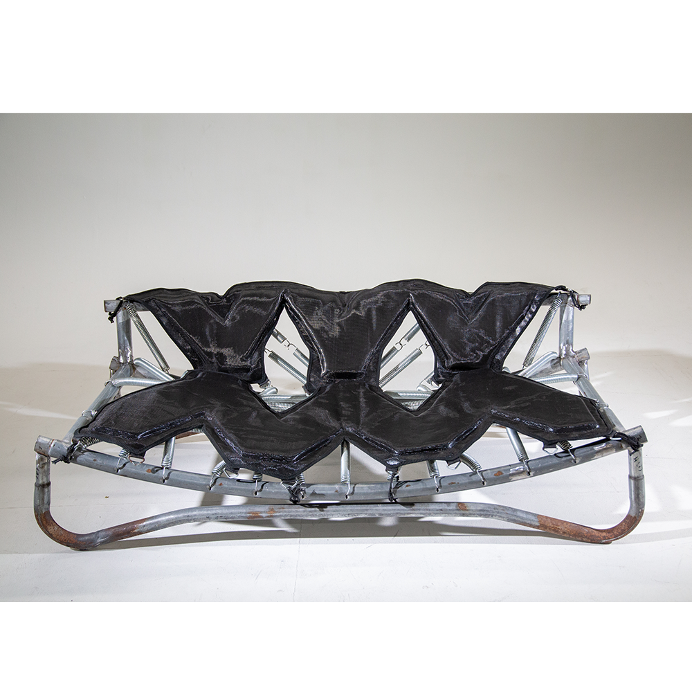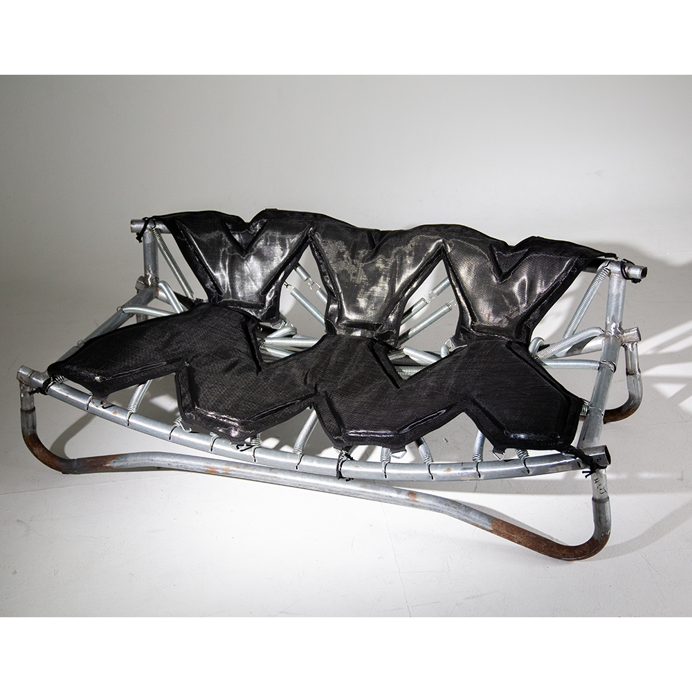 Designed for playful seating with bouncing springs that invite both laughter and active focus. The entire piece is made from parts of a worn-out trampoline that I was given. The padding and fabric also come from the trampoline—I want to show that the materials we discard around us have life and potential that we often fail to see.