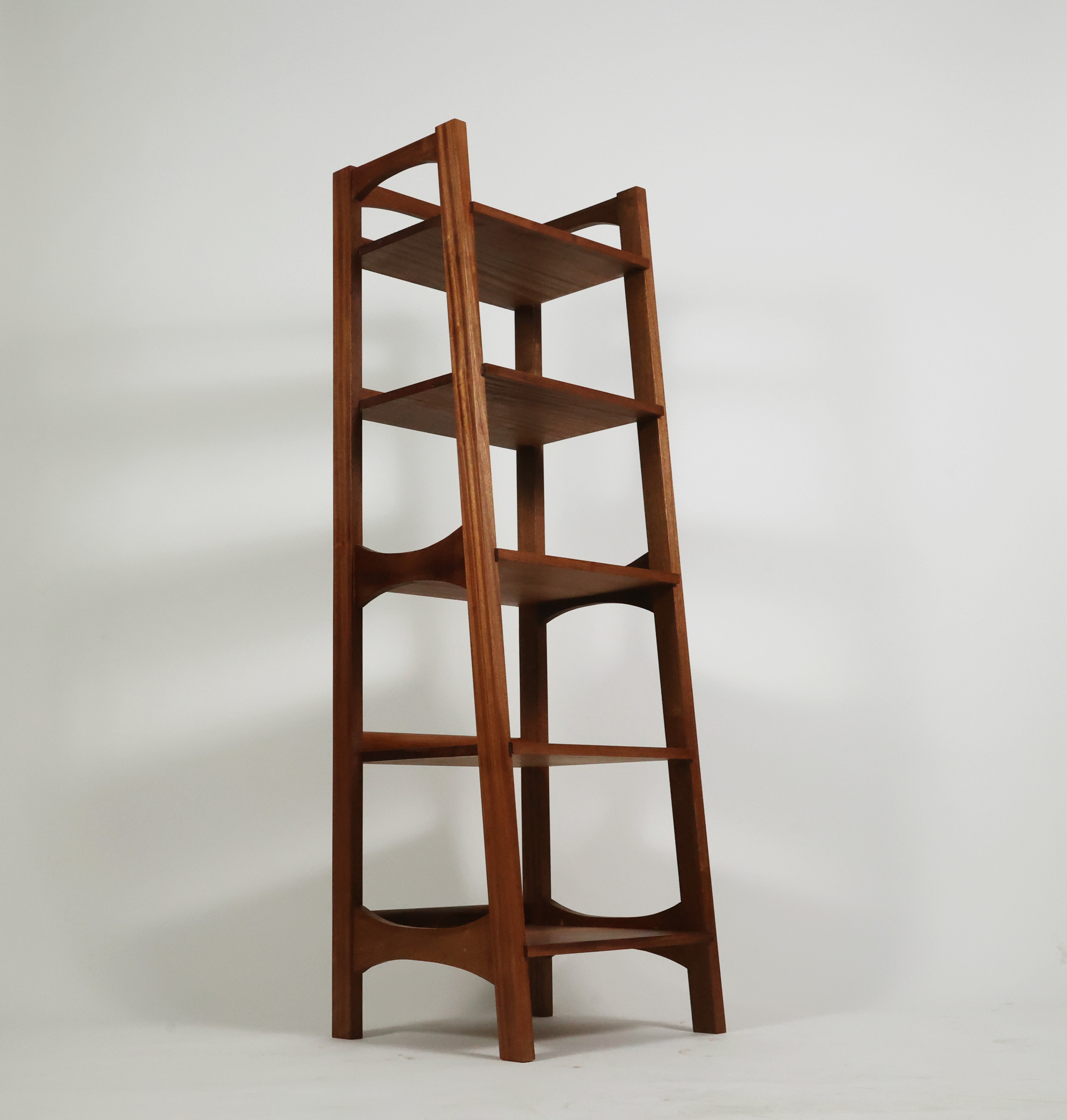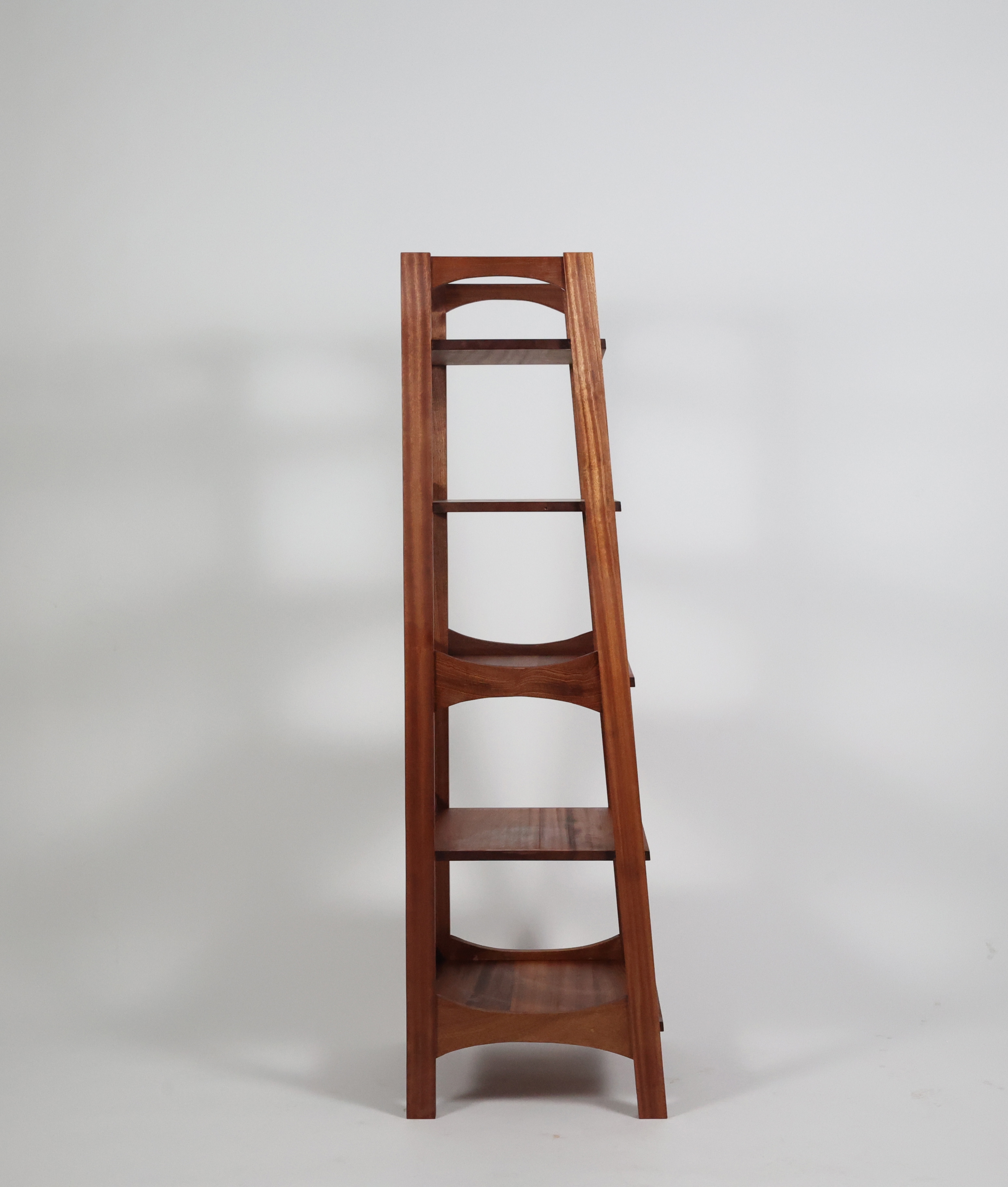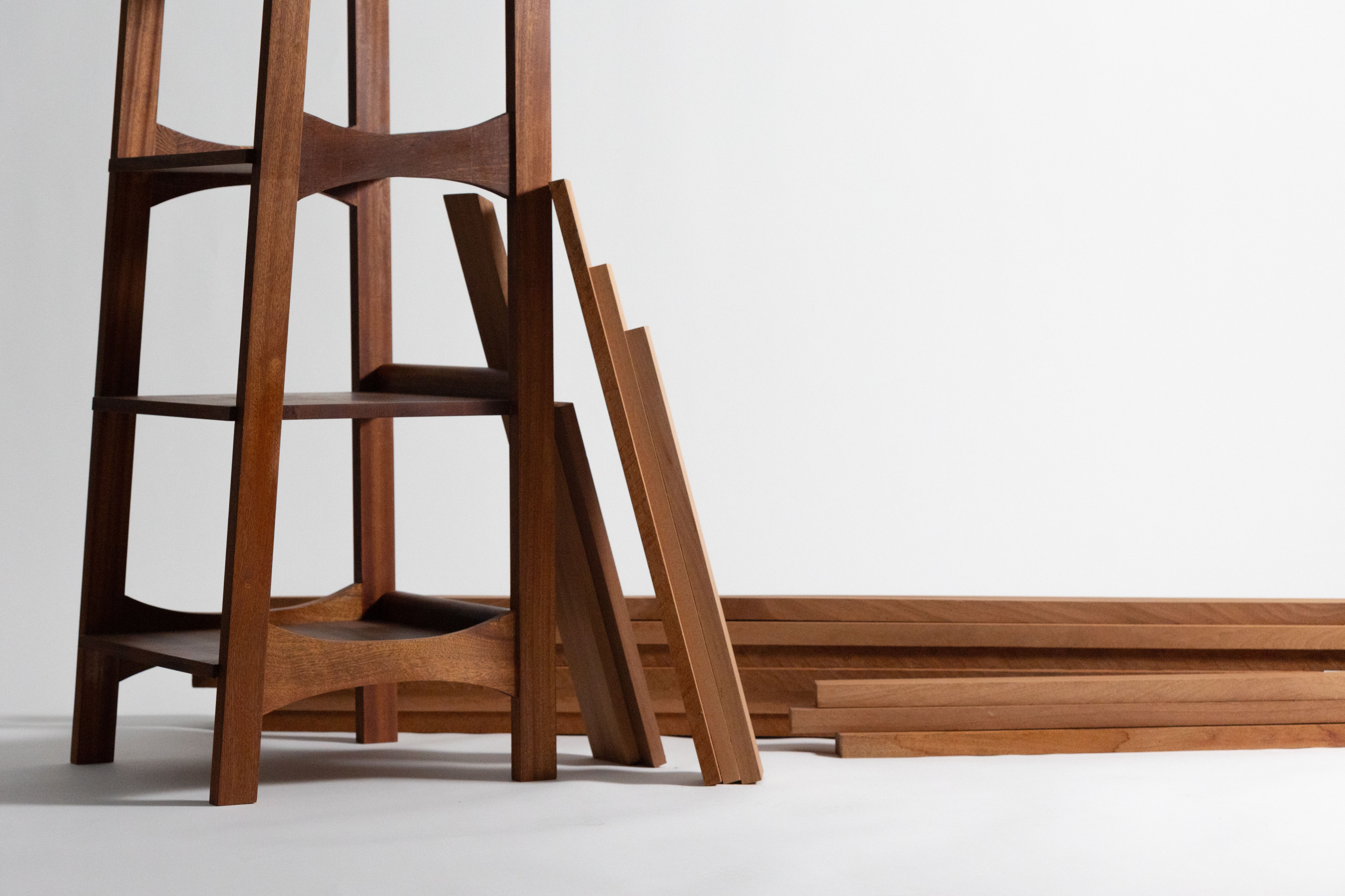 Jumar is a ladder-style bookshelf built out of sapele wood cutoffs from a local cabinet shop's scrap bin. It's designed to be simple to build and easy to integrate into any living space. It's a companion to other pieces in the room, as well as anything it holds, elevating its surroundings and contents alike, as any good bookshelf should.