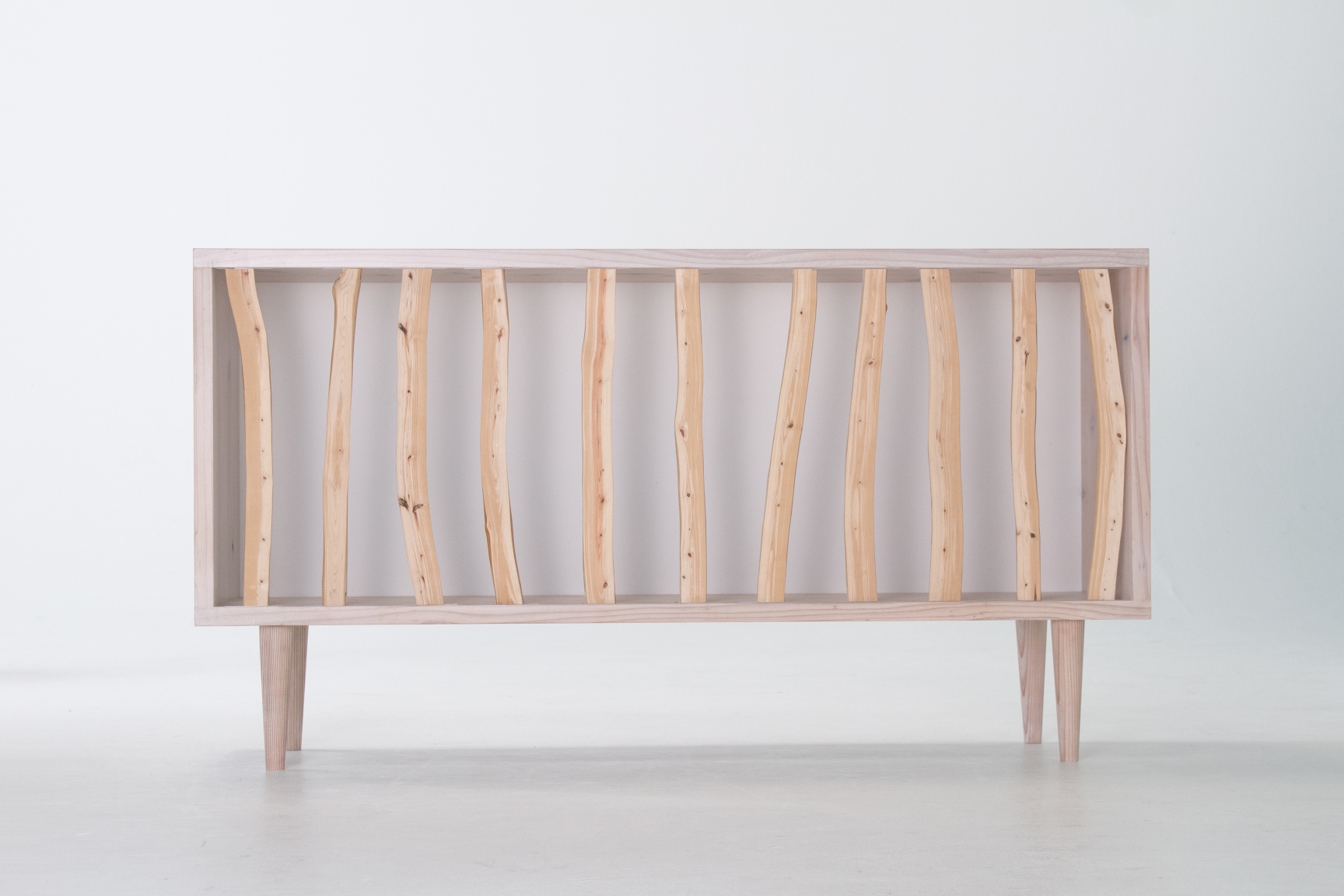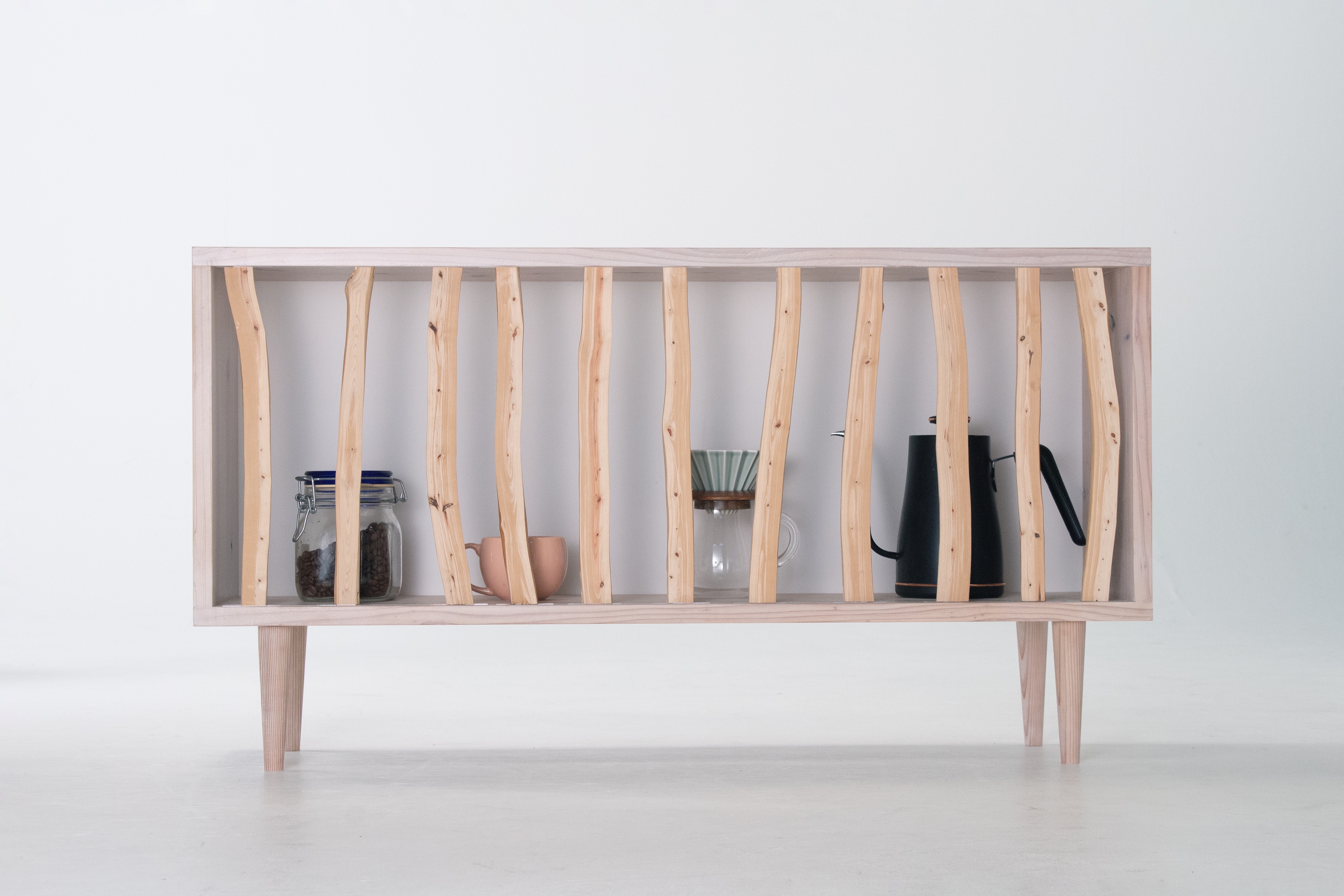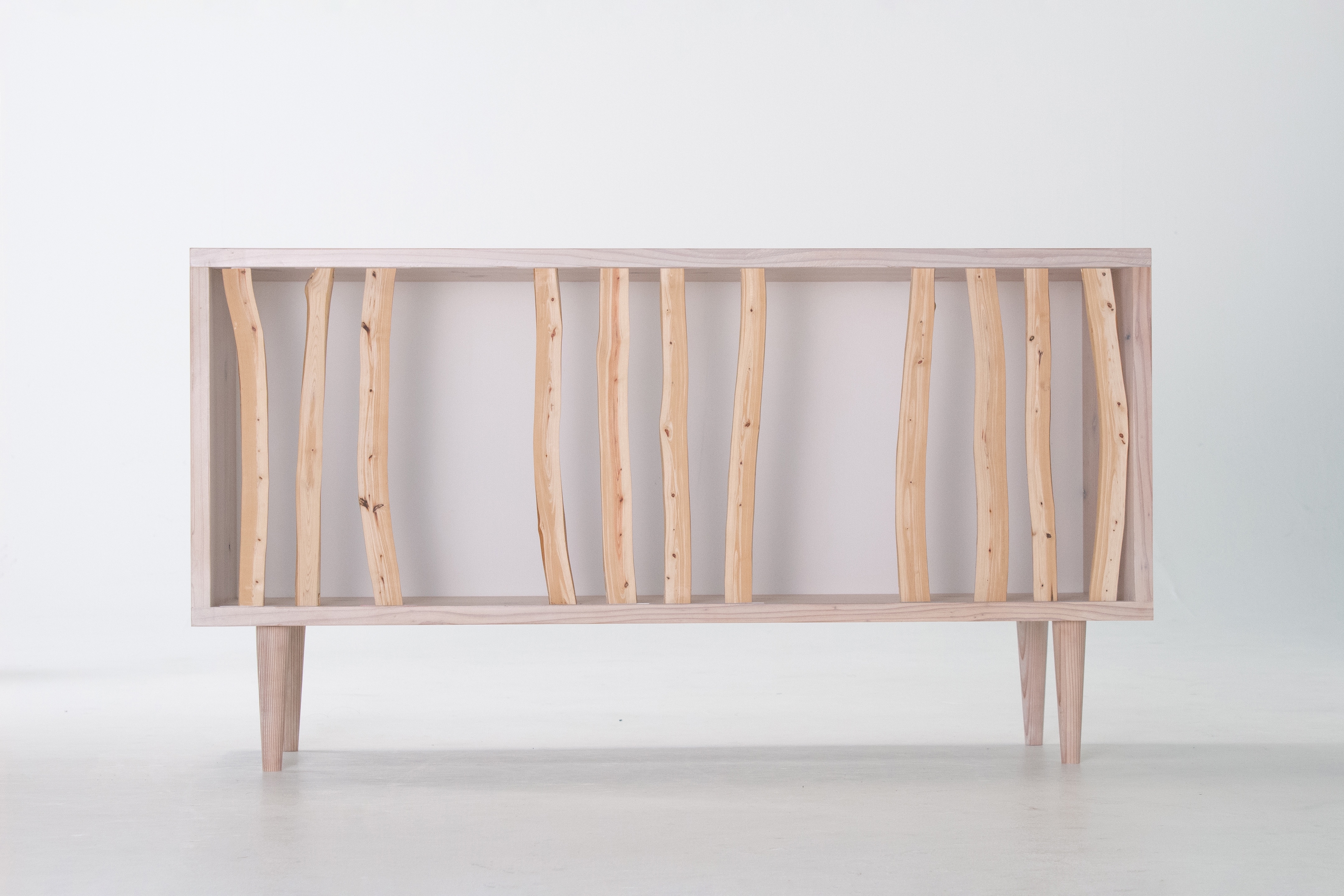 In Japan, planted forests of cypress and cedar are widespread, and thinning is conducted to manage these forests. However, the branches, which are difficult to process and low in value, are often left in the mountains, causing adverse effects on the environment. This furniture is crafted from thinned Japanese cypress branches, showcasing a unique beauty with tight grain and graceful curves that are not found in regular lumber.The design is inspired by the flexible use of space in Japanese homes, where partitions such as sliding doors and shoji screens are used to adjust room size. By moving the branch wood left or right, the sideboard can be tailored to fit your lifestyle, depending on the design, purpose, and frequency of use of the stored items.The freely extending, yet naturally straight branches evoke the tranquil beauty of Japanese forests, bringing the quiet breath of nature to life.