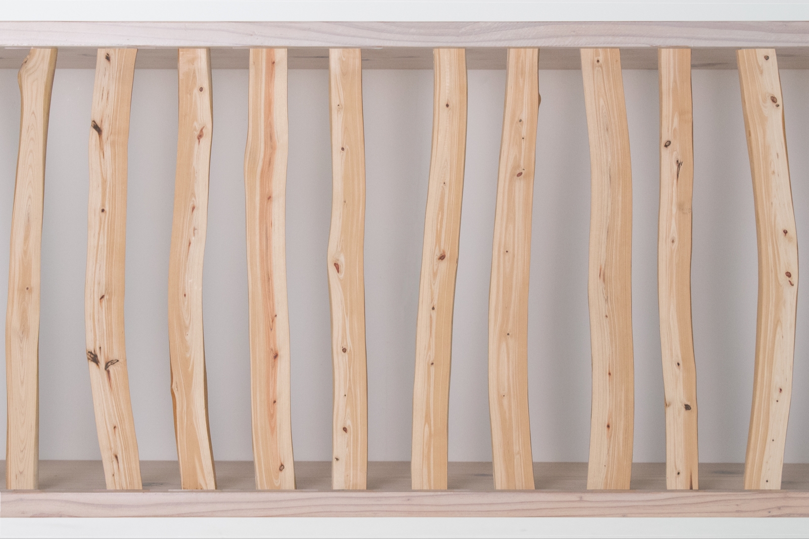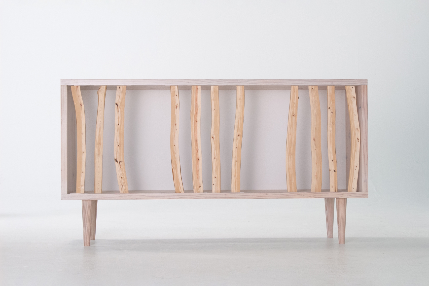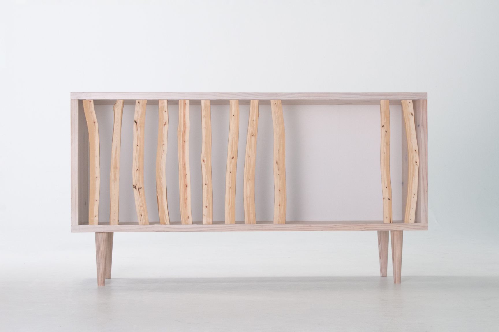 In Japan, planted forests of cypress and cedar are widespread, and thinning is conducted to manage these forests. However, the branches, which are difficult to process and low in value, are often left in the mountains, causing adverse effects on the environment. This furniture is crafted from thinned Japanese cypress branches, showcasing a unique beauty with tight grain and graceful curves that are not found in regular lumber.The design is inspired by the flexible use of space in Japanese homes, where partitions such as sliding doors and shoji screens are used to adjust room size. By moving the branch wood left or right, the sideboard can be tailored to fit your lifestyle, depending on the design, purpose, and frequency of use of the stored items.The freely extending, yet naturally straight branches evoke the tranquil beauty of Japanese forests, bringing the quiet breath of nature to life.