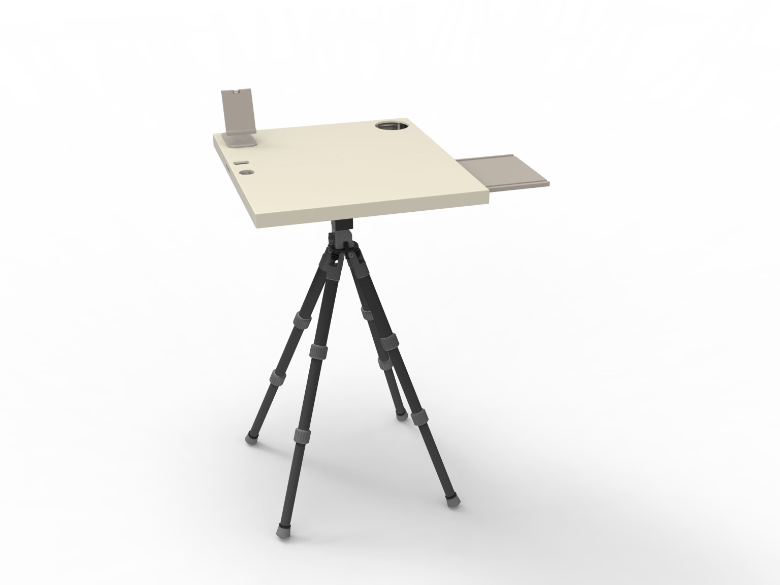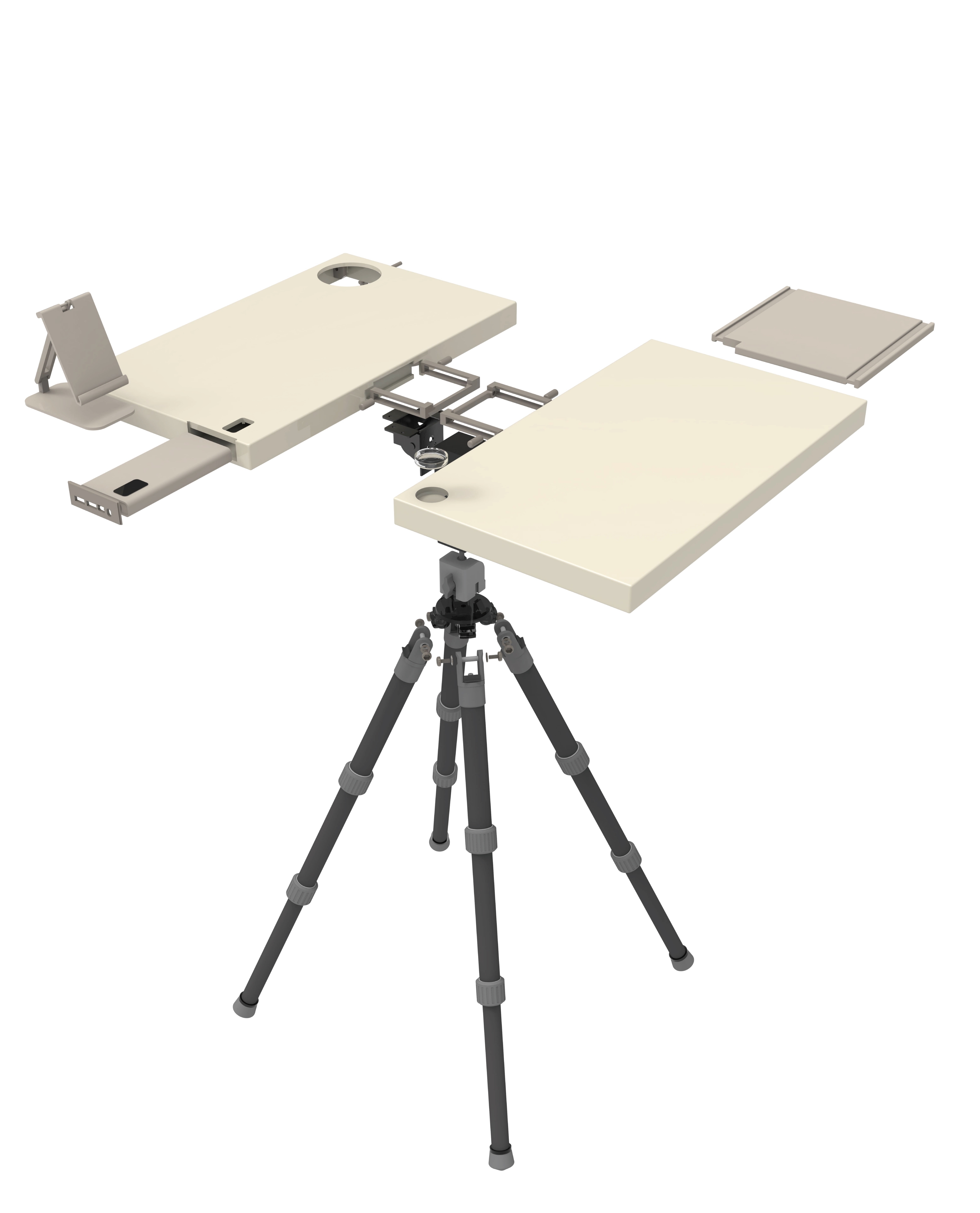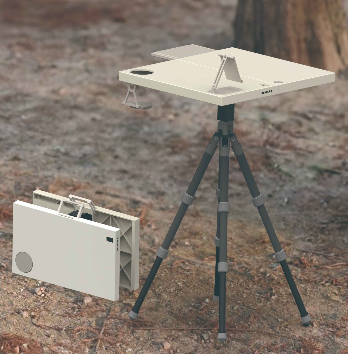 In response, we have redefined the functionality of outdoor work equipment and designed a lightweight, portable, flexible, and stable **Outdoor Creative Work Table* tailored for professionals such as journalists, live streamers, and on-location photographers. Combining portability and technology, it adapts to diverse terrains with adjustable height and configurations supported by a four-legged design, offering a stable workspace anywhere. This workstation not only enhances creative efficiency but also transforms outdoor creation into a bridge for global audience interaction.